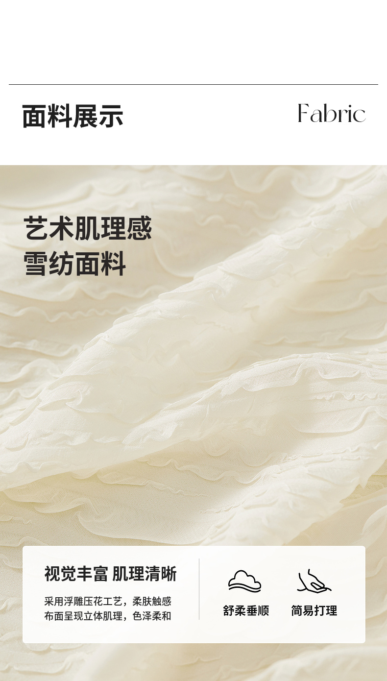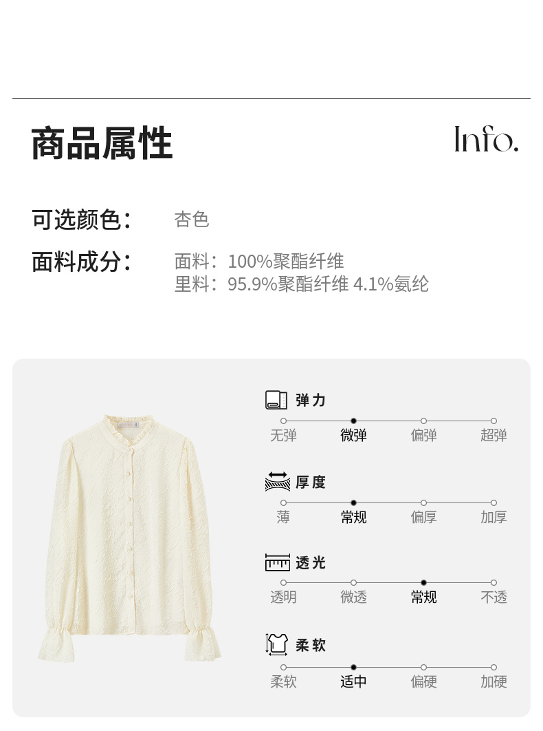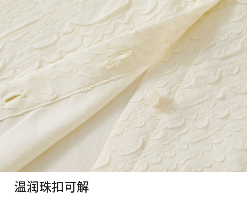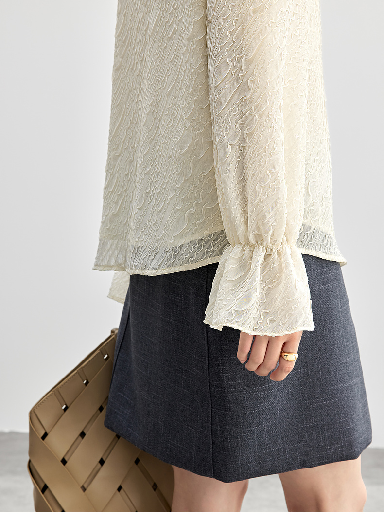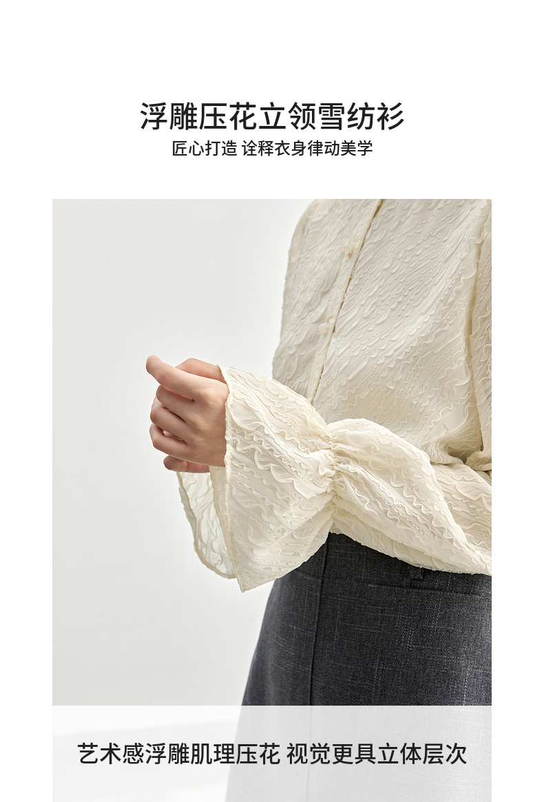 【内购】浮雕肌理压花木耳边立领珠扣松紧花瓣泡泡袖雪纺衫-151C58162