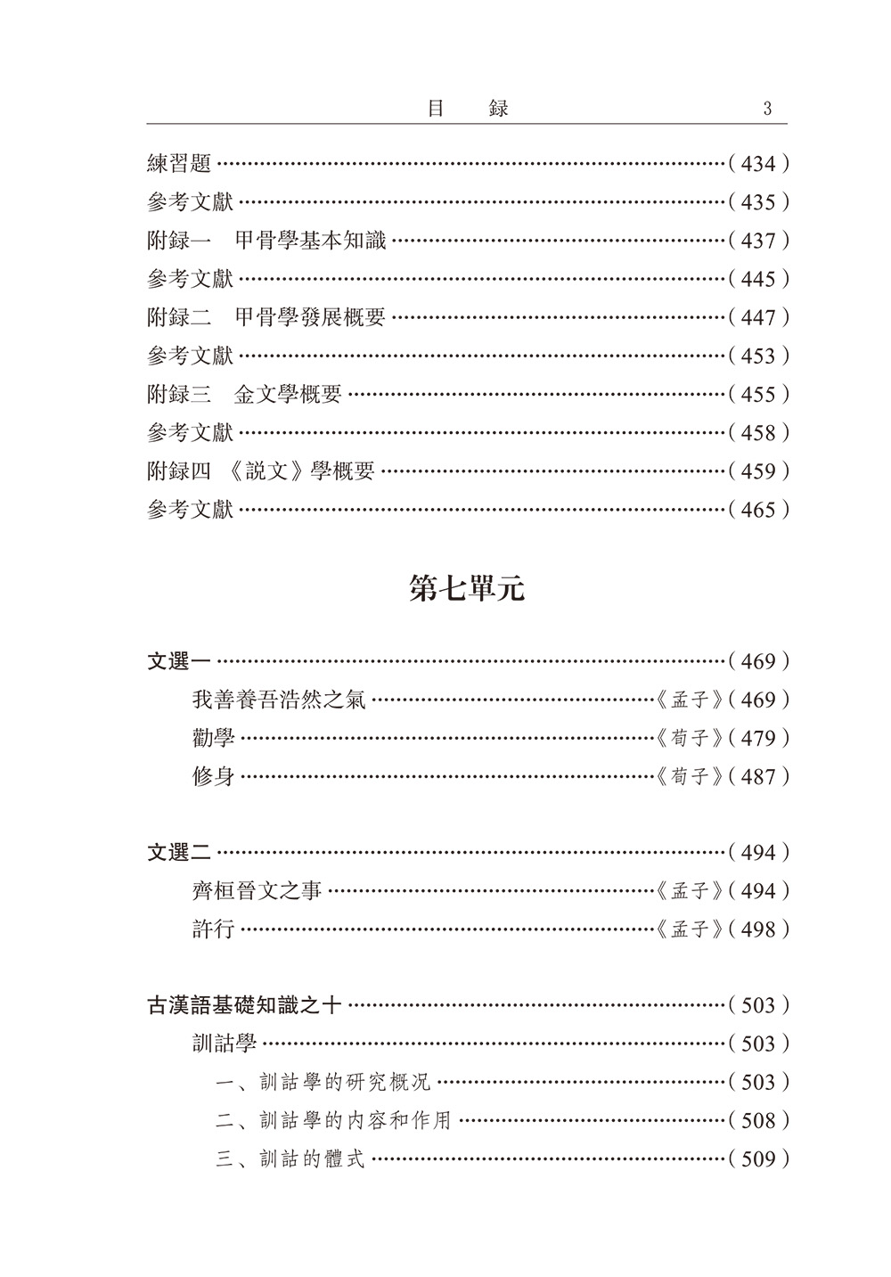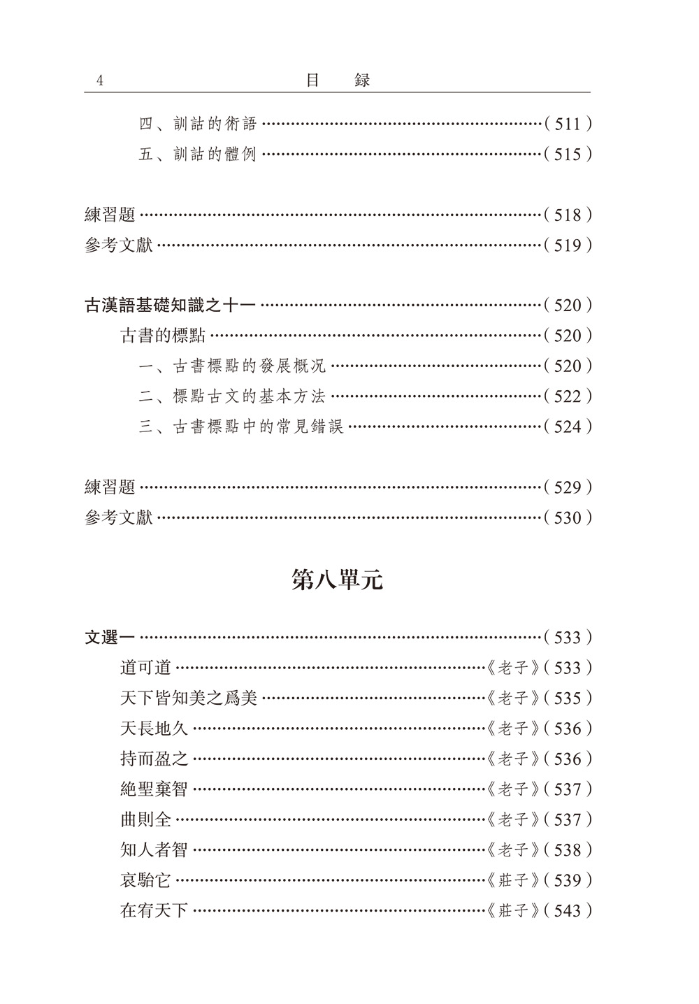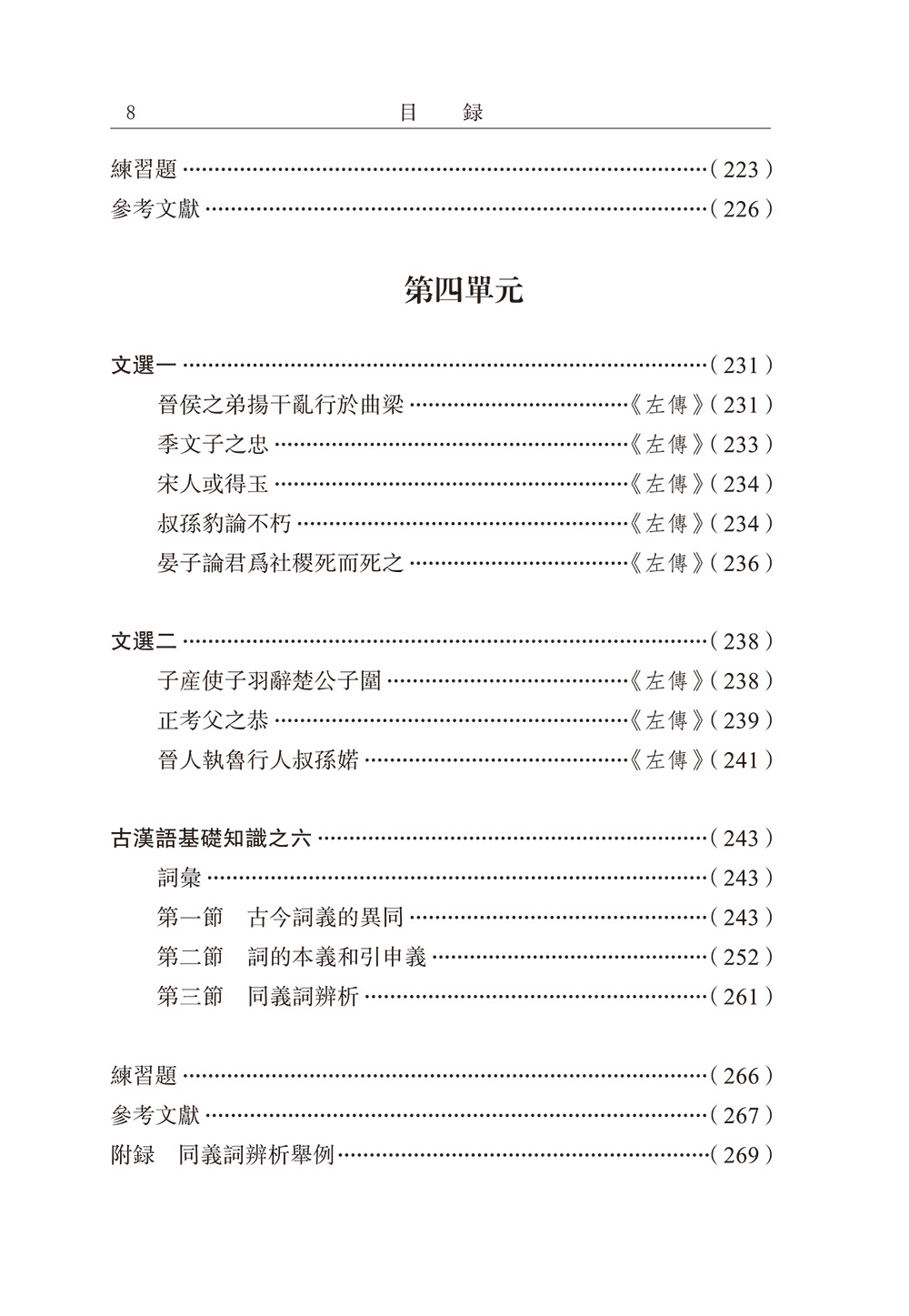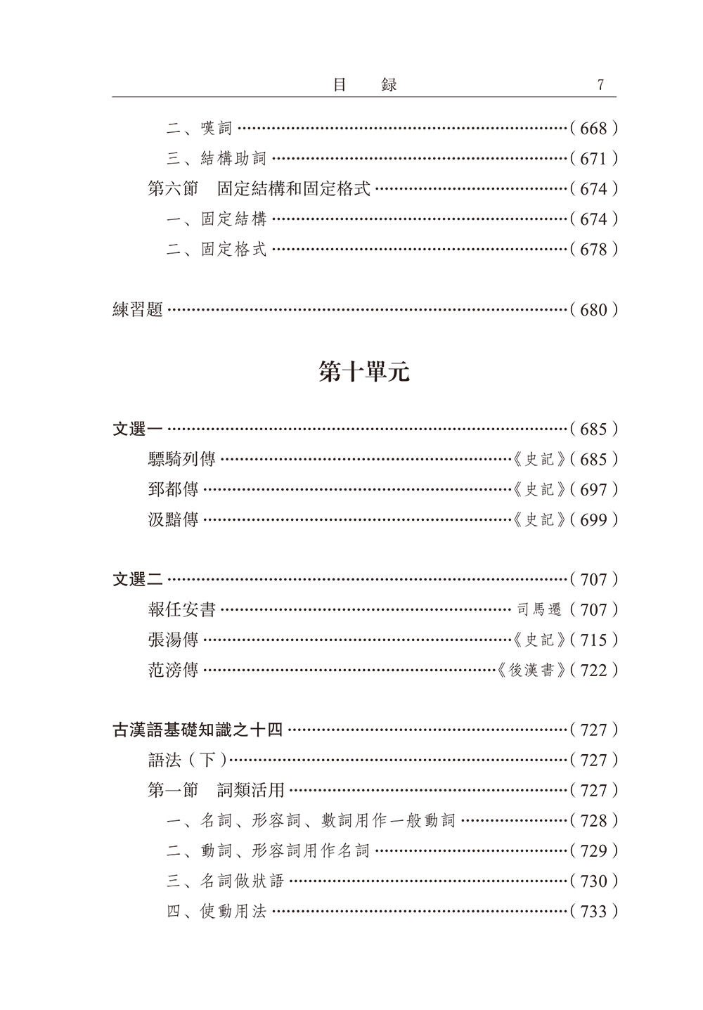 本书为面向高等院校学生编写的《古代汉语》教材。全书共设11个单元,每个单元下面主要分文选、知识通论两大部分。文选之后附有同类文章若干,方便学生课外阅读与参考。部分通论之后附有相关资料,旨在扩大学生的学术视野。文选的选取以先秦两汉的优秀代表作为主,内容方面兼顾文史哲,注释部分简明扼要。知识通论主要突出实用性和学术性。本书采用繁体字,横排版式。参与编写的人员有22人,均为高校古代汉语教师,保证了内容的准确性和专业性。