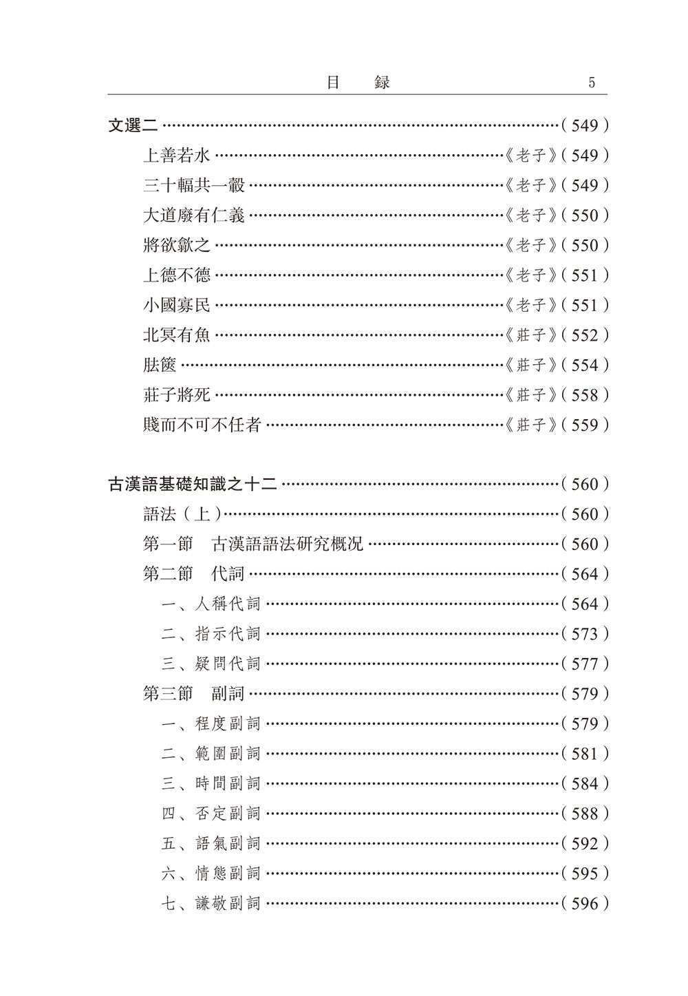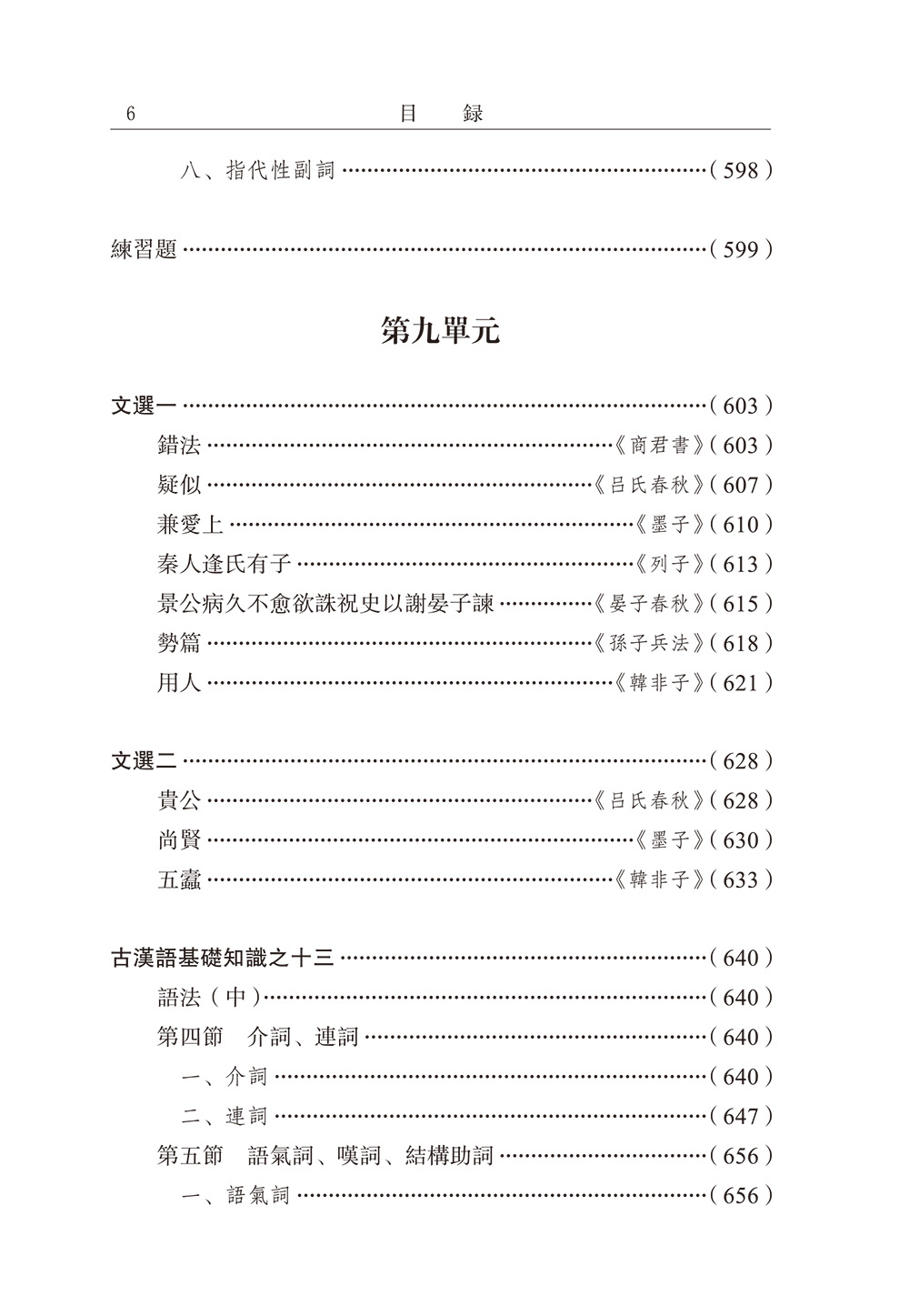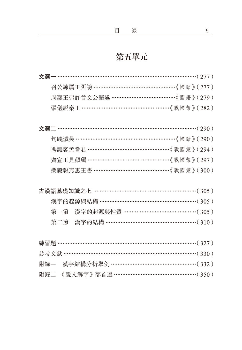 本书为面向高等院校学生编写的《古代汉语》教材。全书共设11个单元,每个单元下面主要分文选、知识通论两大部分。文选之后附有同类文章若干,方便学生课外阅读与参考。部分通论之后附有相关资料,旨在扩大学生的学术视野。文选的选取以先秦两汉的优秀代表作为主,内容方面兼顾文史哲,注释部分简明扼要。知识通论主要突出实用性和学术性。本书采用繁体字,横排版式。参与编写的人员有22人,均为高校古代汉语教师,保证了内容的准确性和专业性。