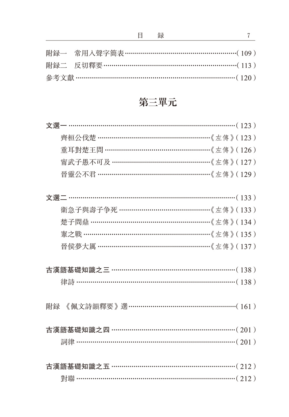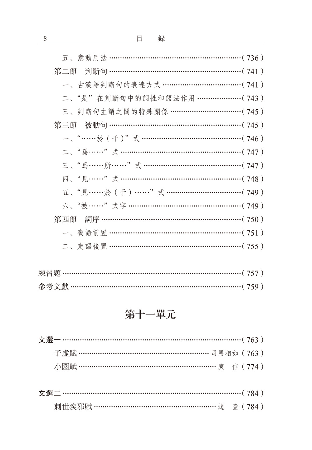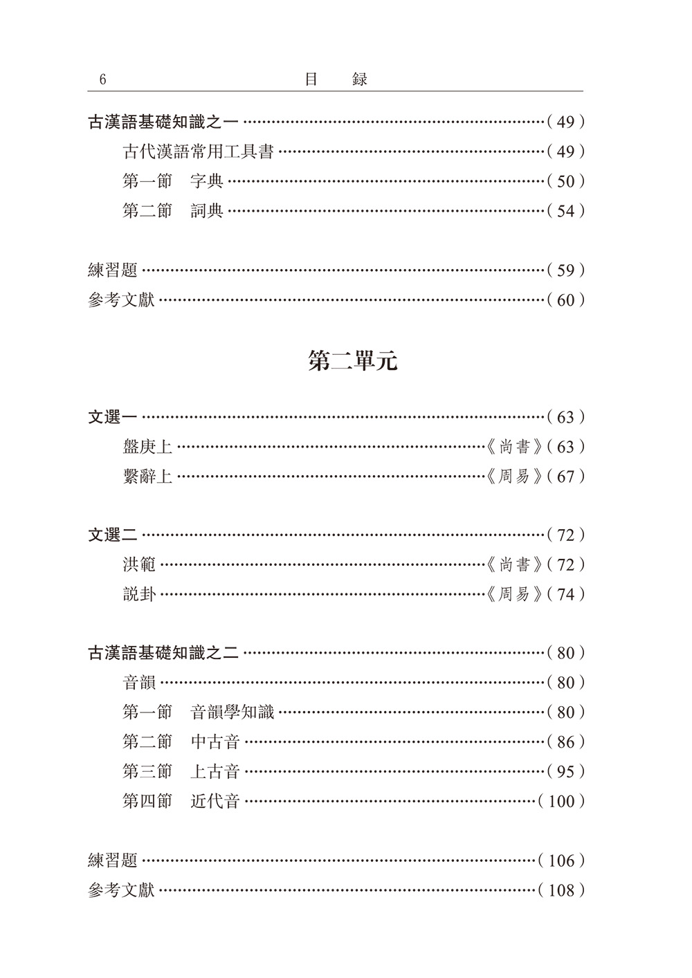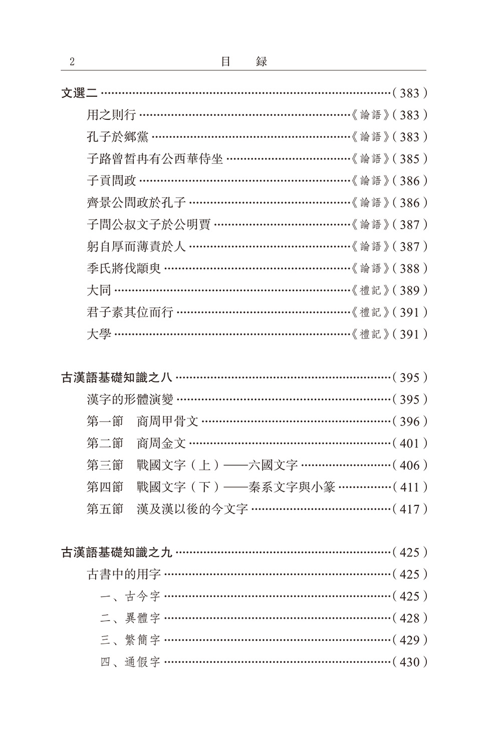 本书为面向高等院校学生编写的《古代汉语》教材。全书共设11个单元,每个单元下面主要分文选、知识通论两大部分。文选之后附有同类文章若干,方便学生课外阅读与参考。部分通论之后附有相关资料,旨在扩大学生的学术视野。文选的选取以先秦两汉的优秀代表作为主,内容方面兼顾文史哲,注释部分简明扼要。知识通论主要突出实用性和学术性。本书采用繁体字,横排版式。参与编写的人员有22人,均为高校古代汉语教师,保证了内容的准确性和专业性。
