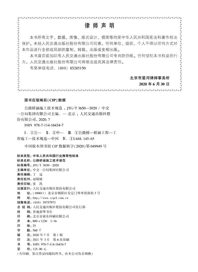 书名:公路桥涵施工技术规范(JTG/T 3650—2020)