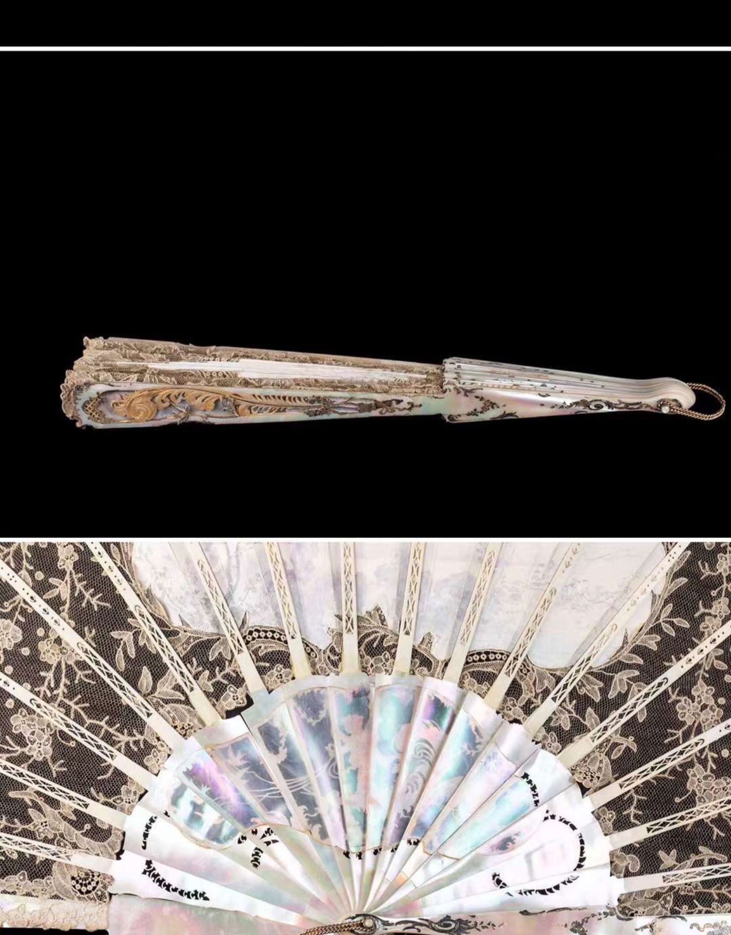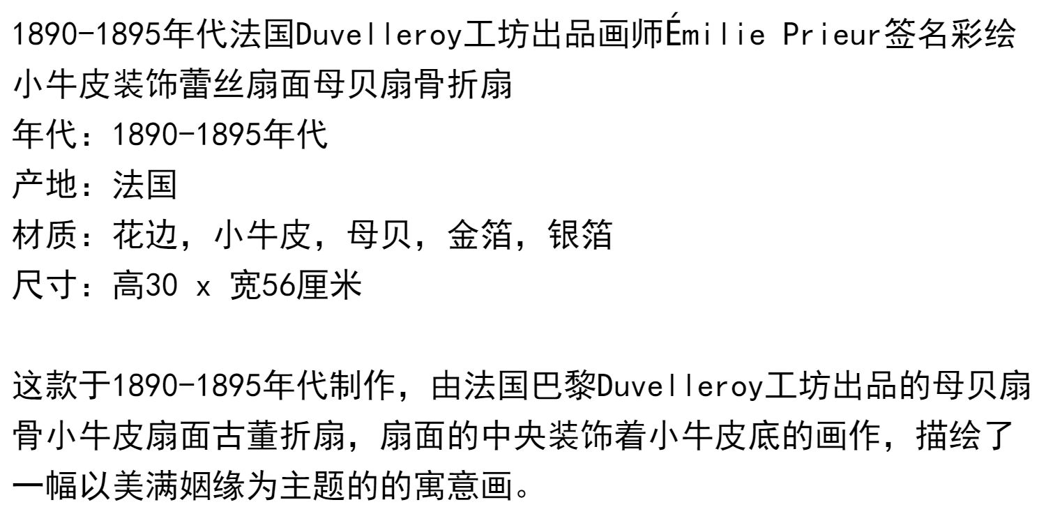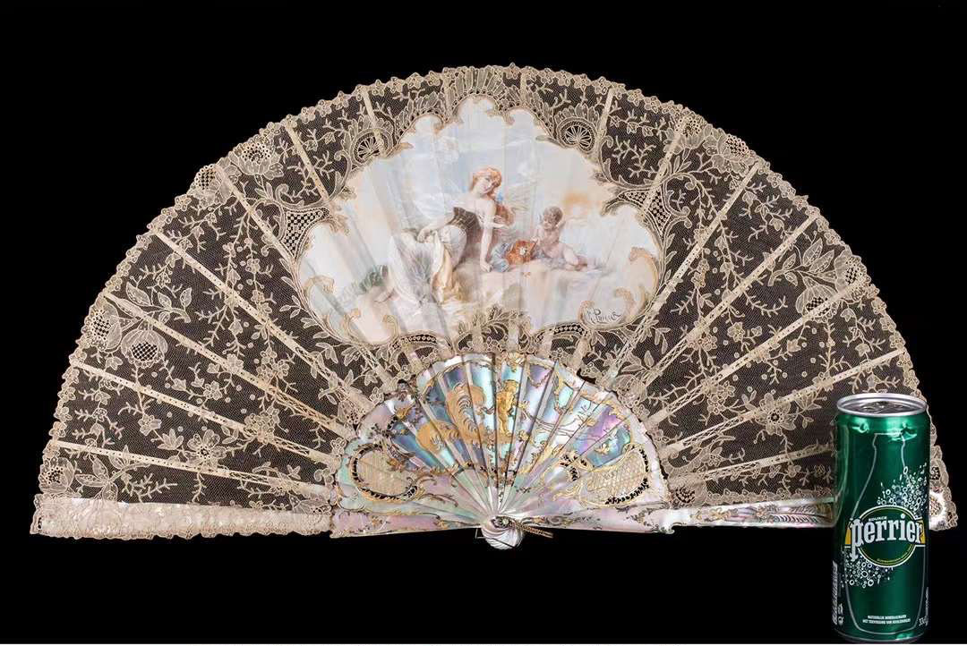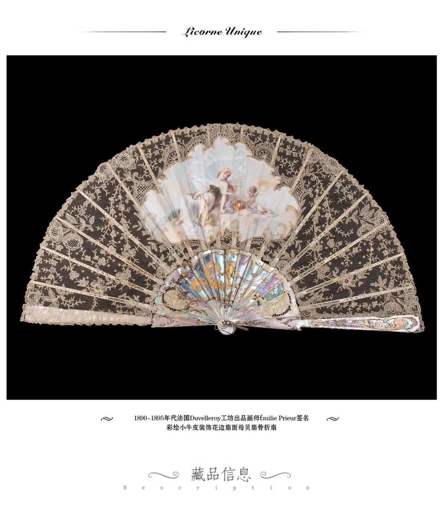独角鹿西洋古董法国duvelleroy小牛皮蕾丝画师彩绘母贝扇骨折扇