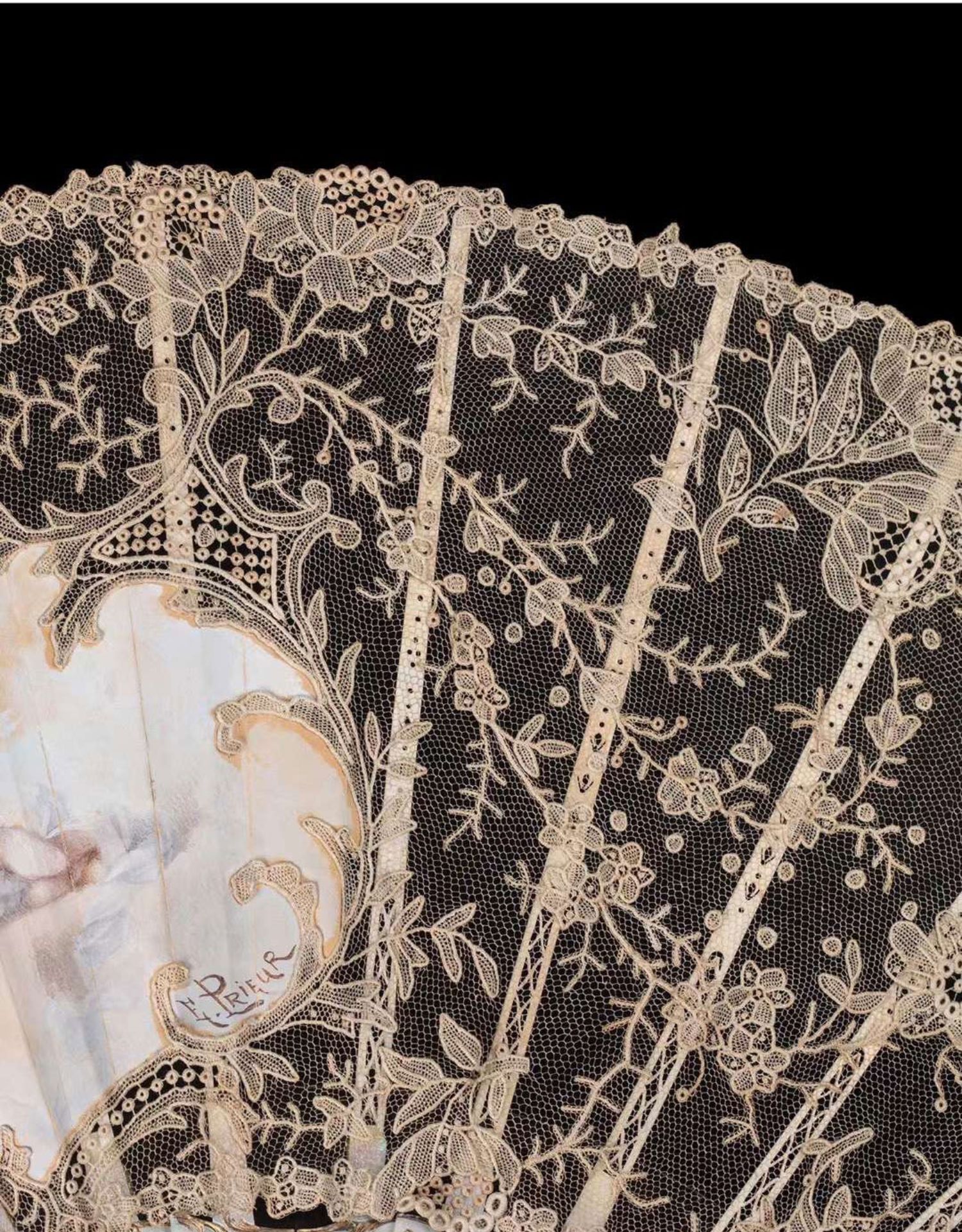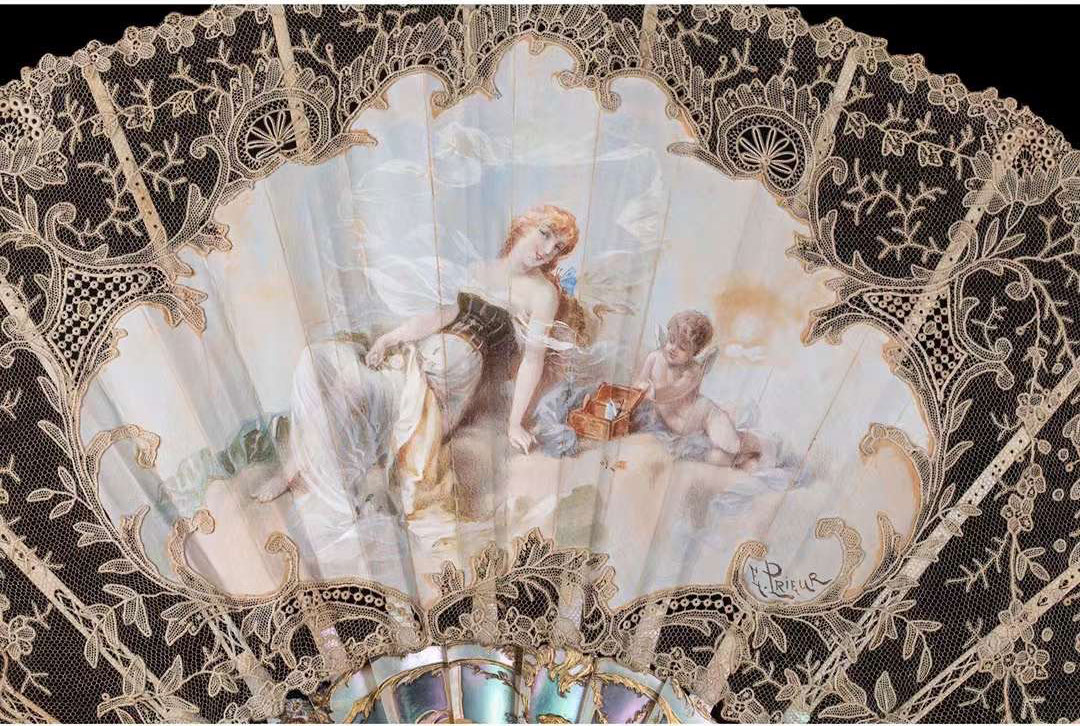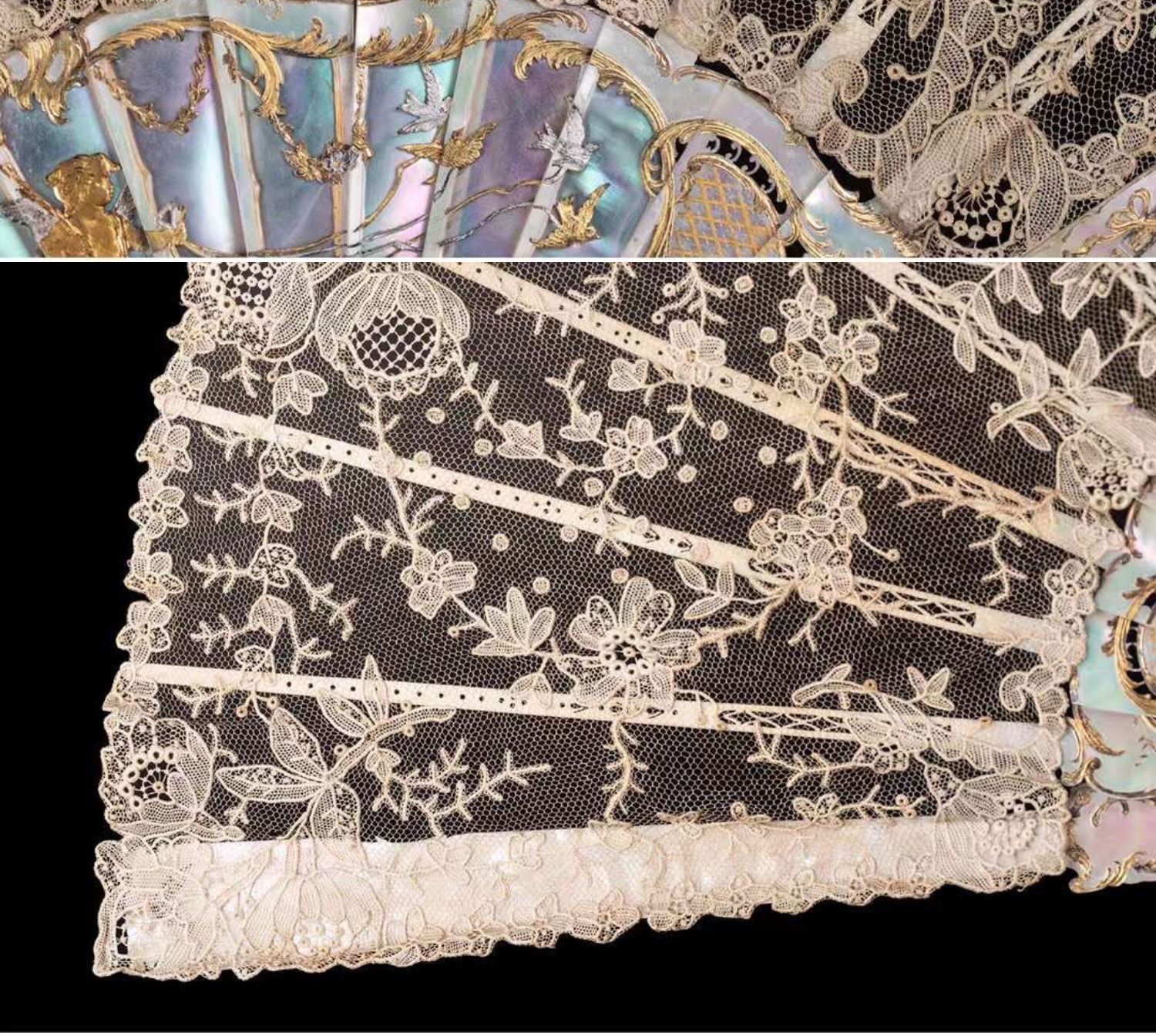 独角鹿西洋古董法国duvelleroy小牛皮蕾丝画师彩绘母贝扇骨折扇