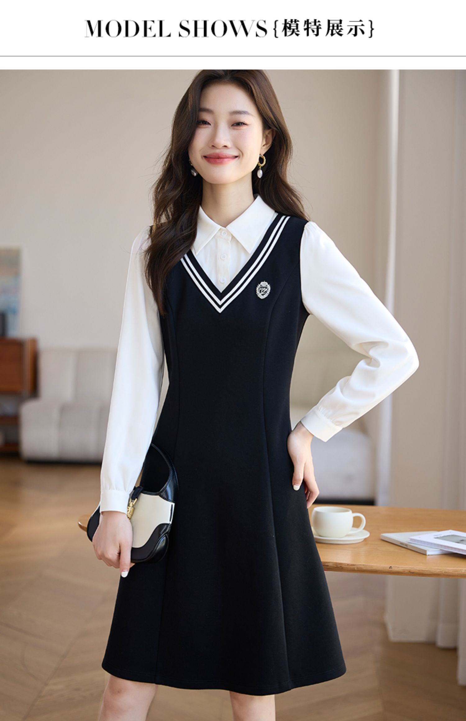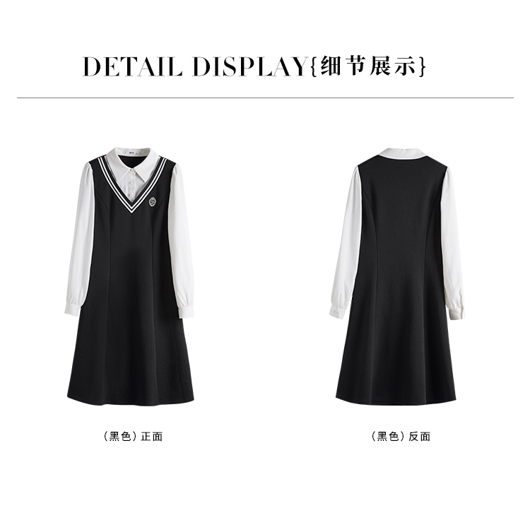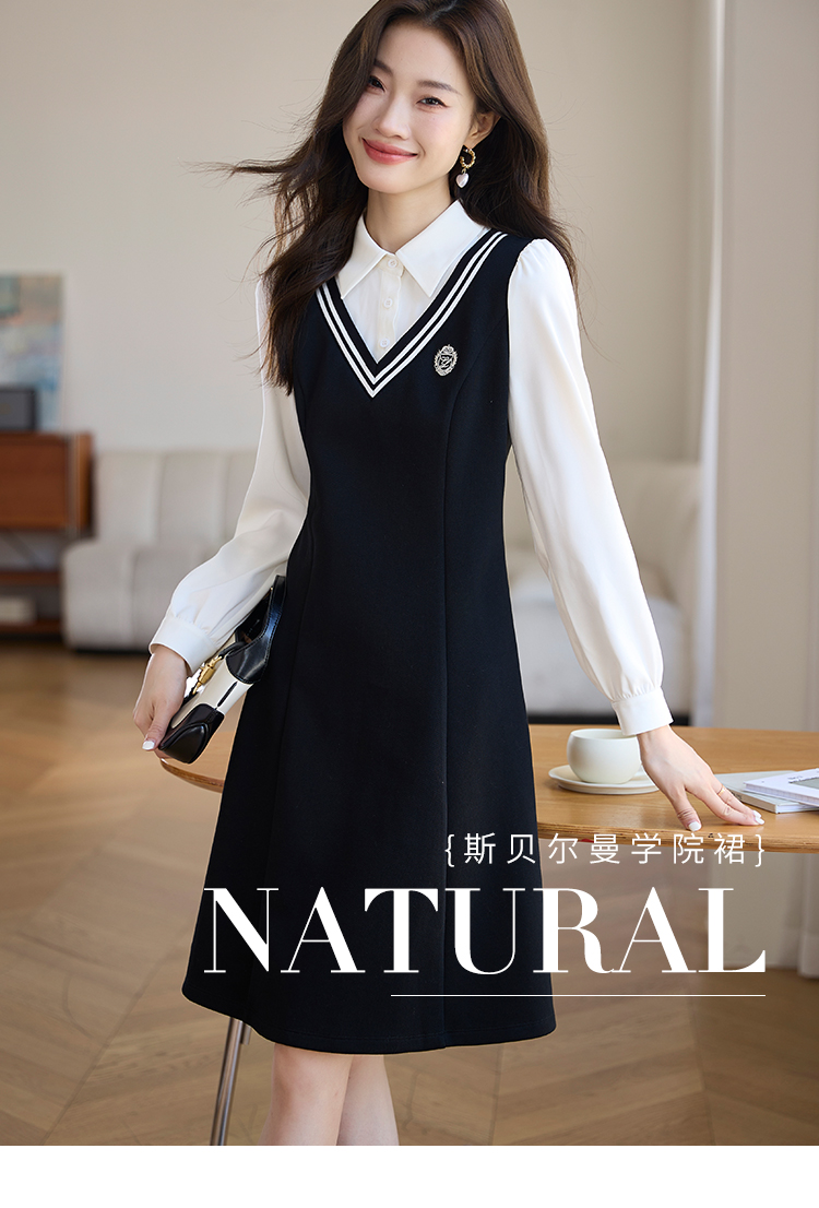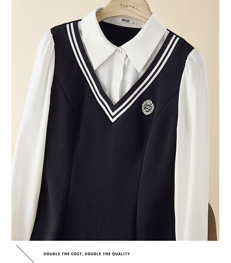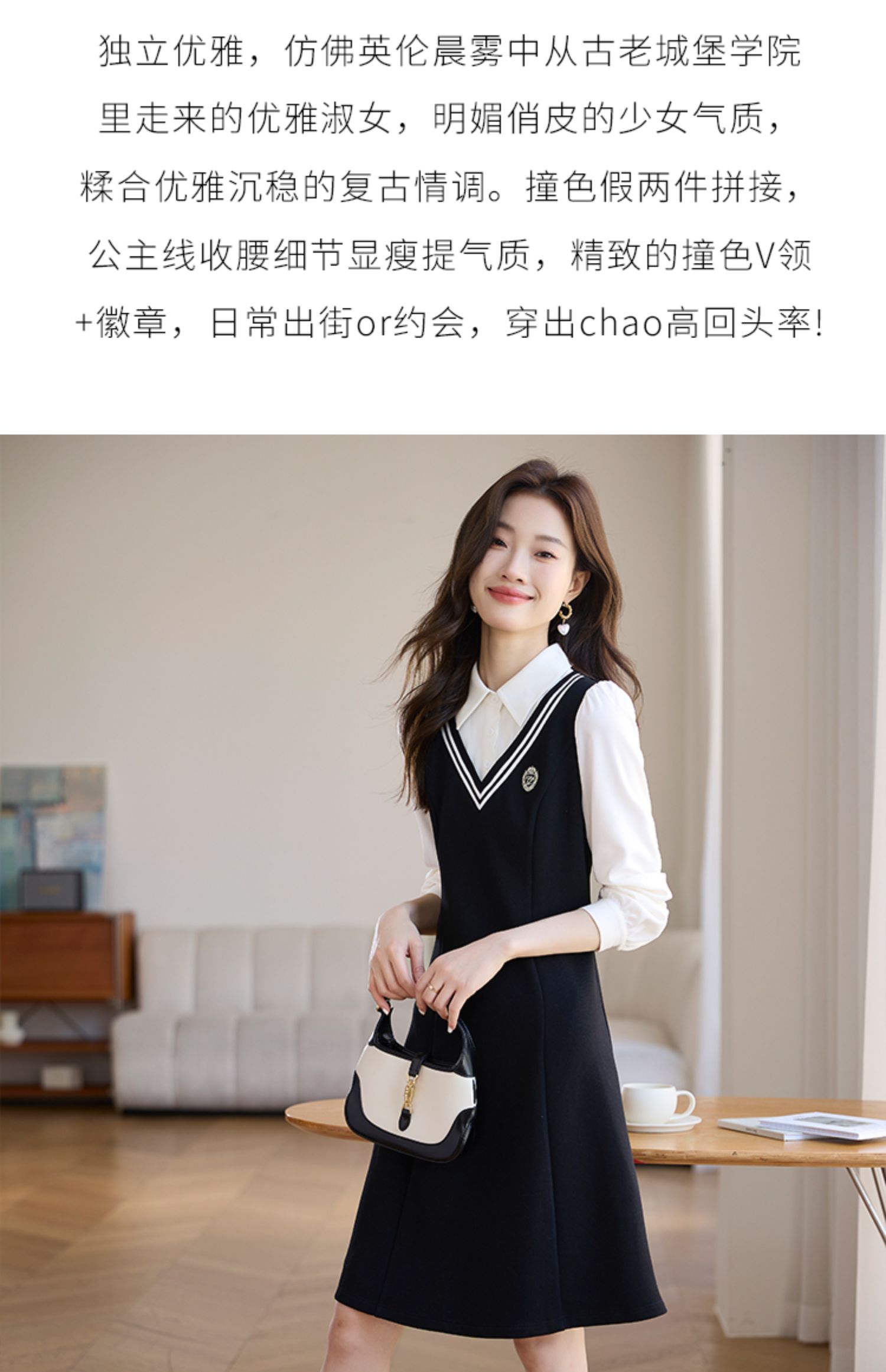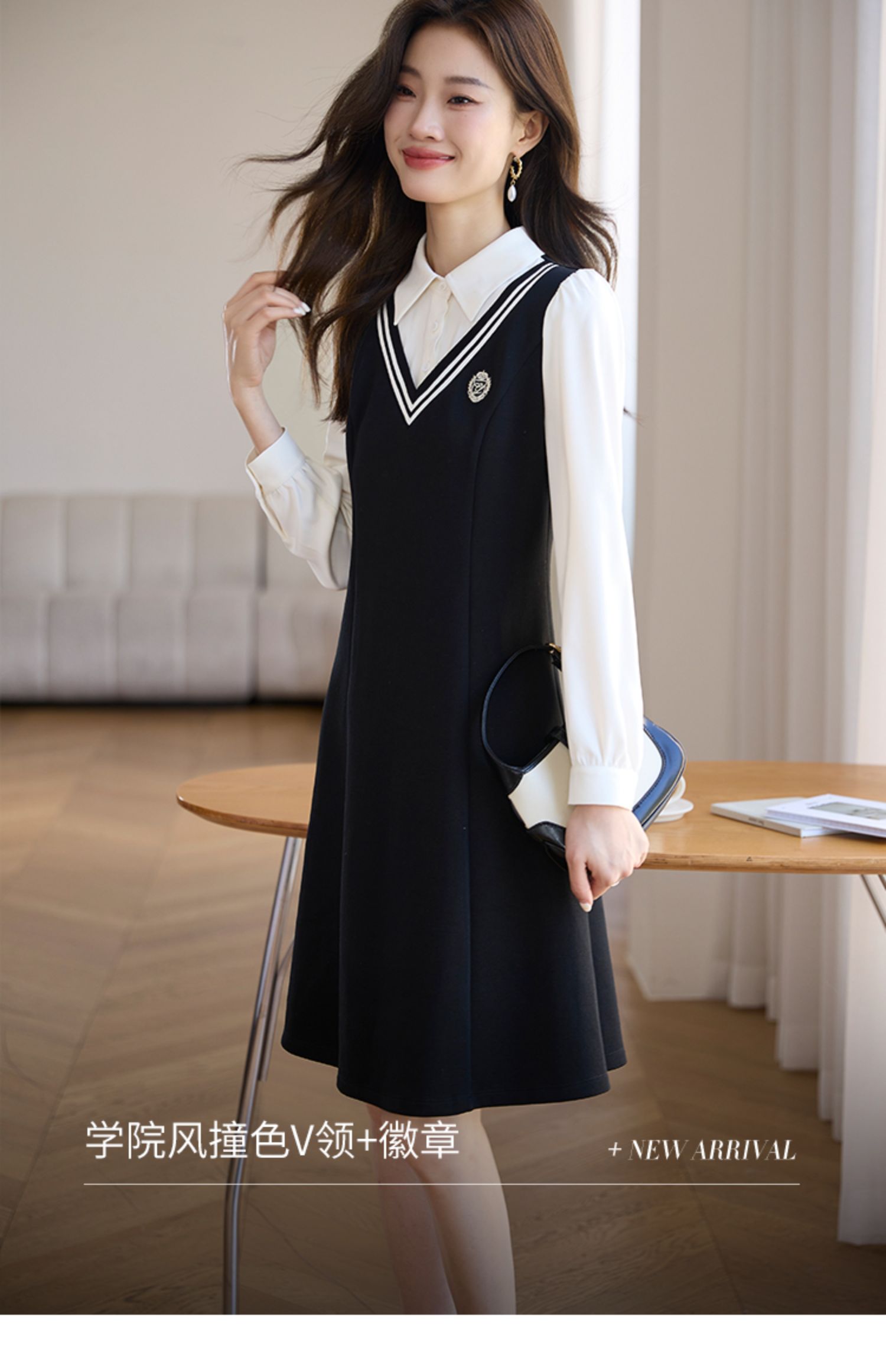 【开门红】熙世界学院风撞色V领徽章衬衫领长袖假两件连衣裙女2024秋季新款