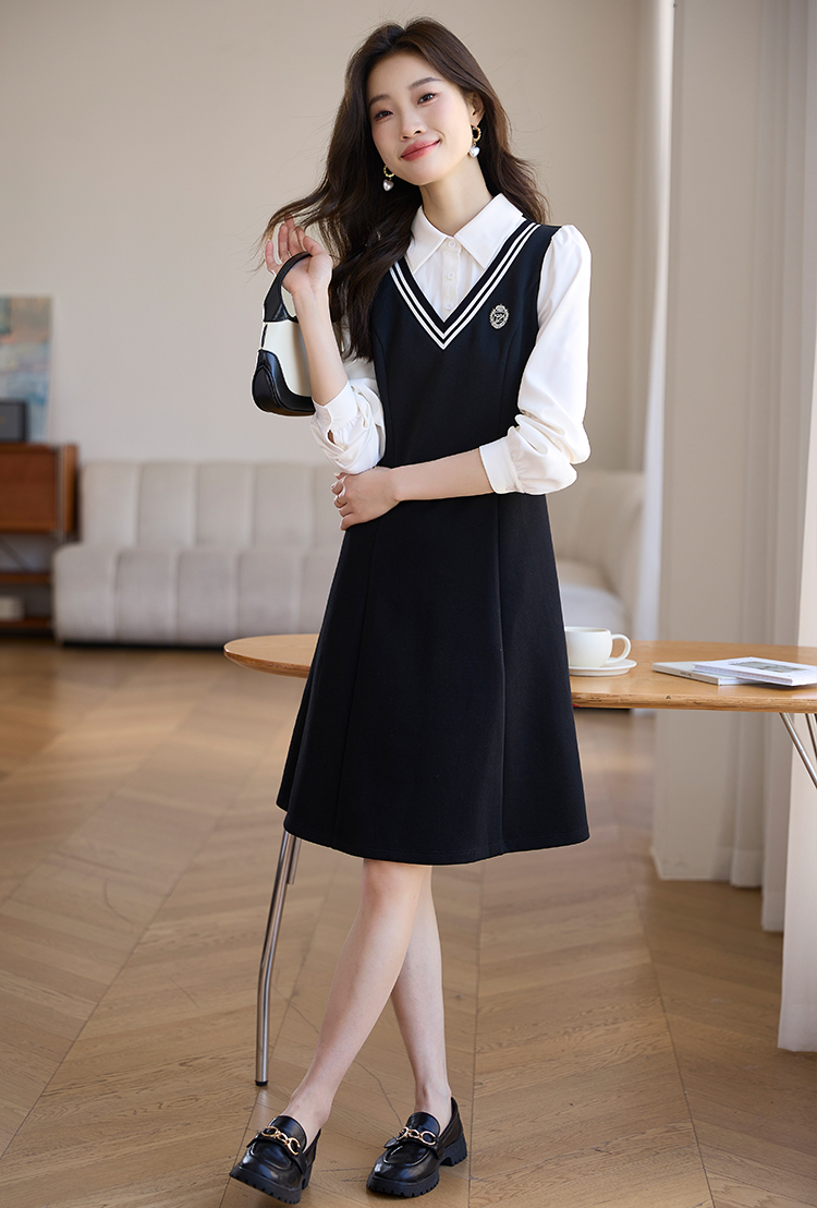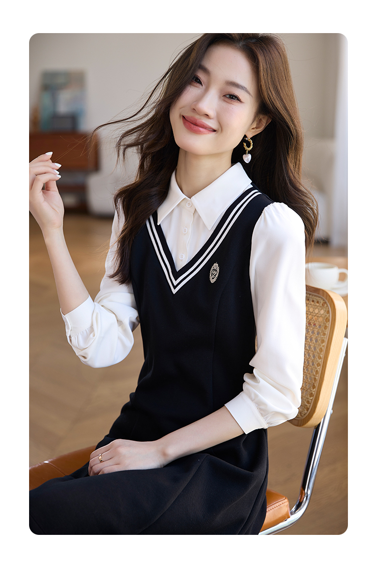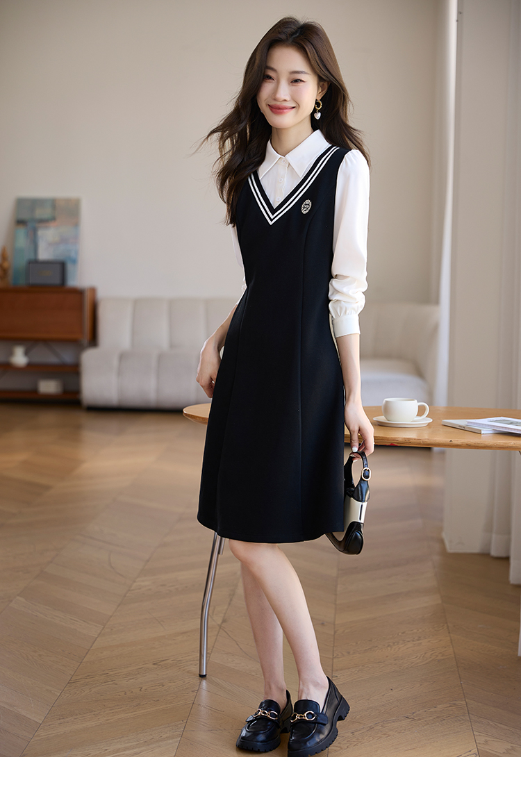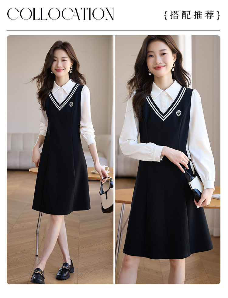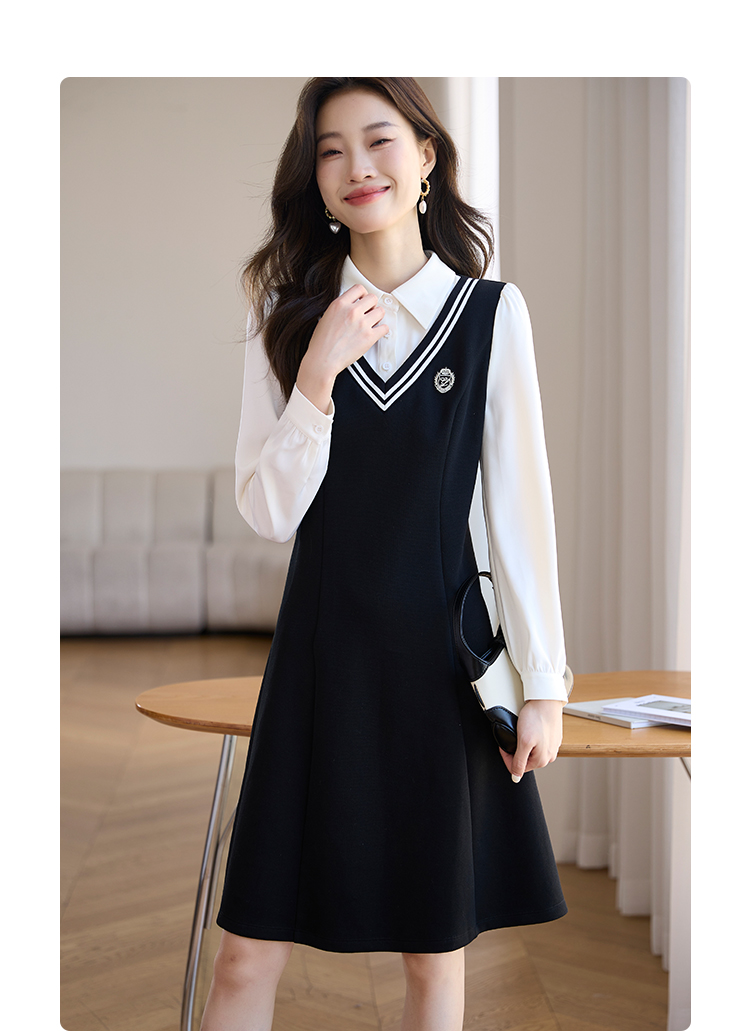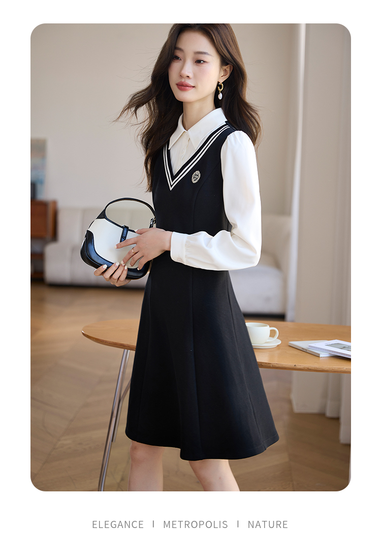 【开门红】熙世界学院风撞色V领徽章衬衫领长袖假两件连衣裙女2024秋季新款