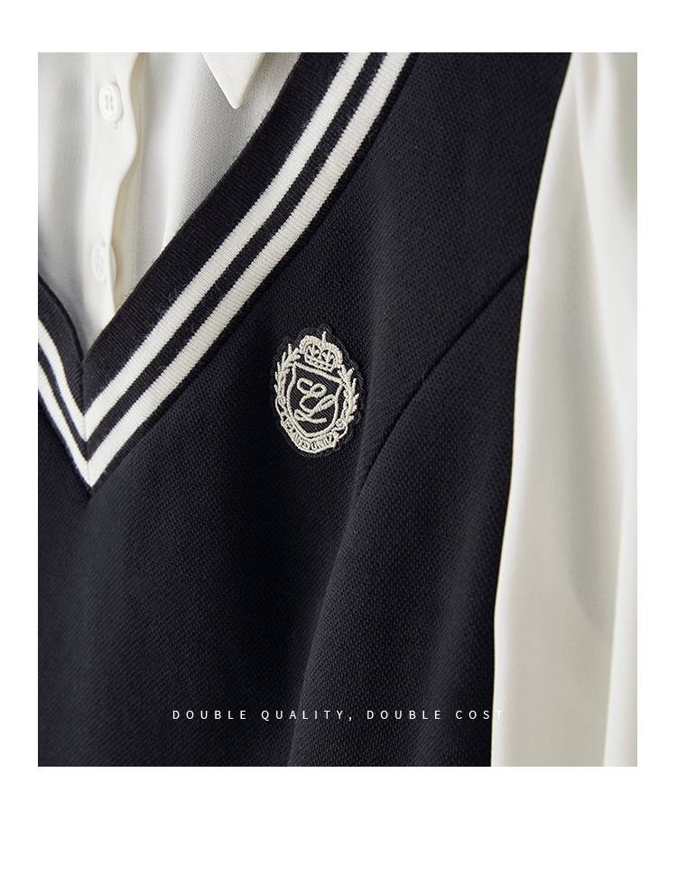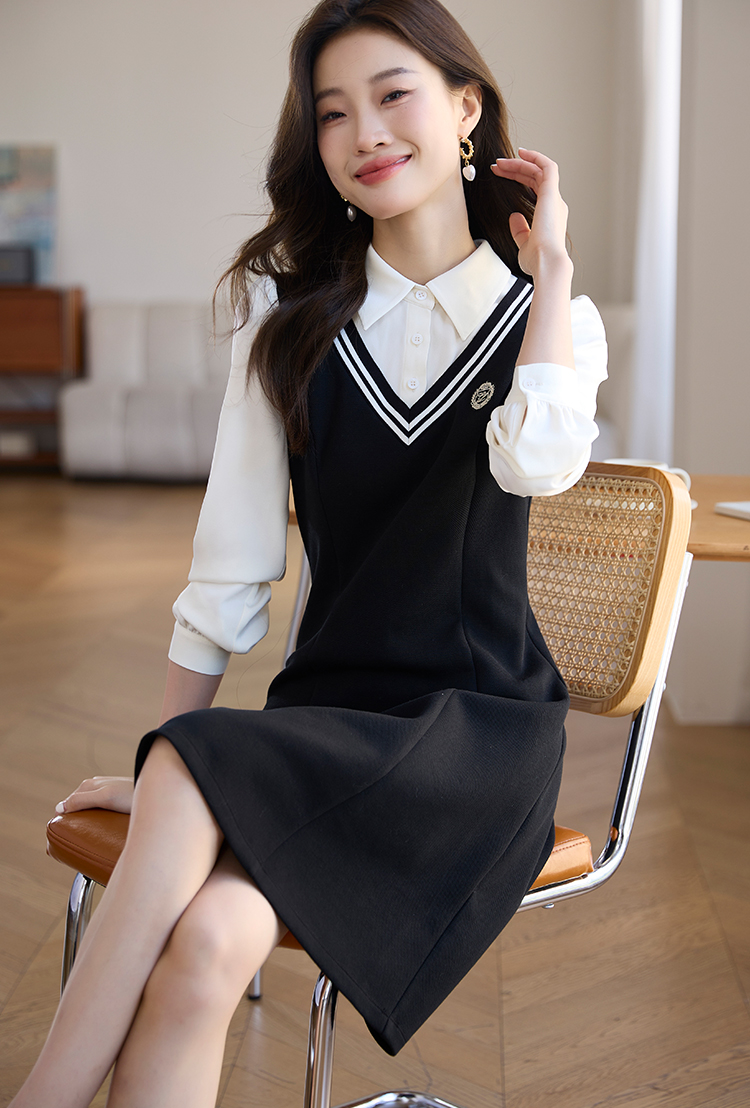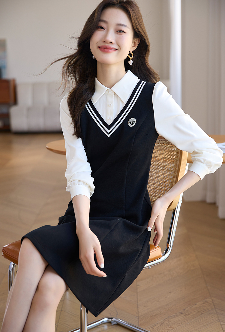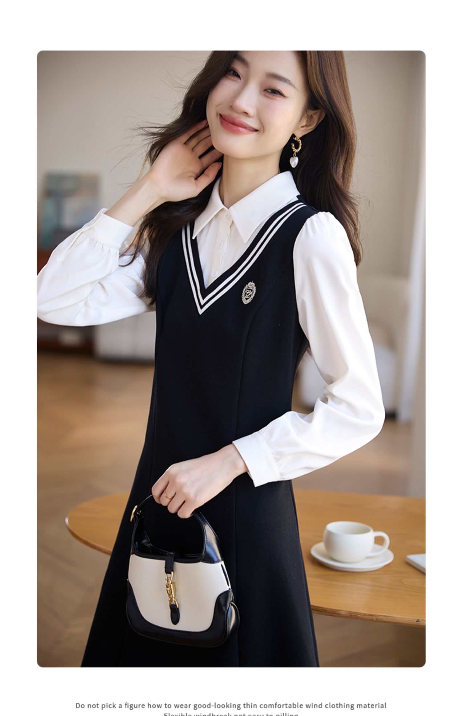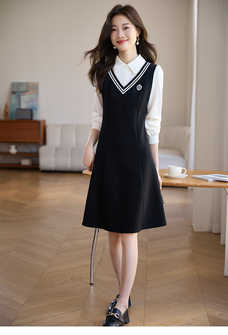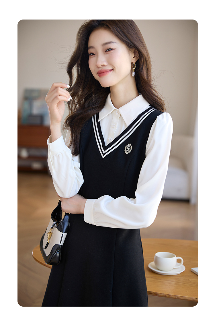 【开门红】熙世界学院风撞色V领徽章衬衫领长袖假两件连衣裙女2024秋季新款