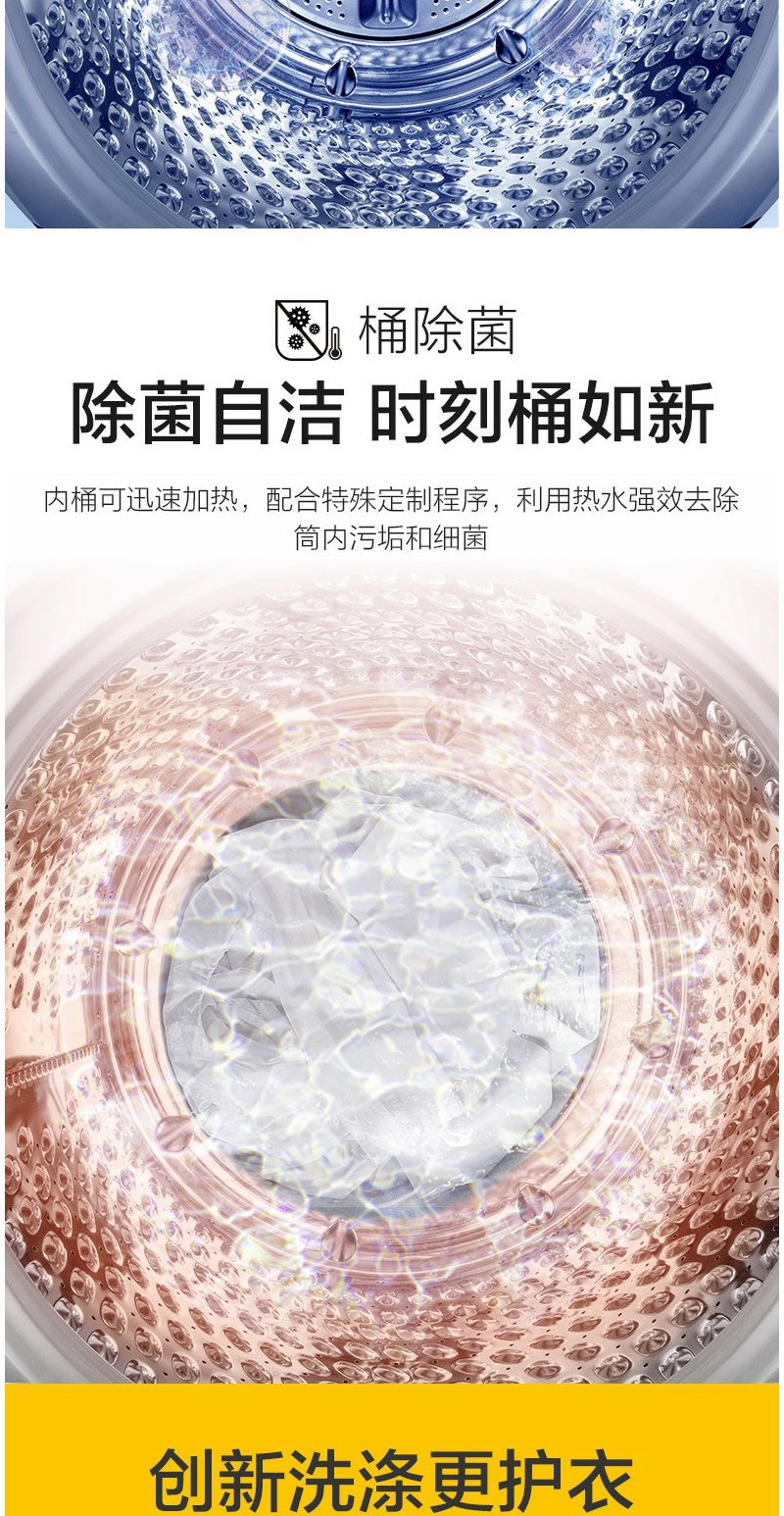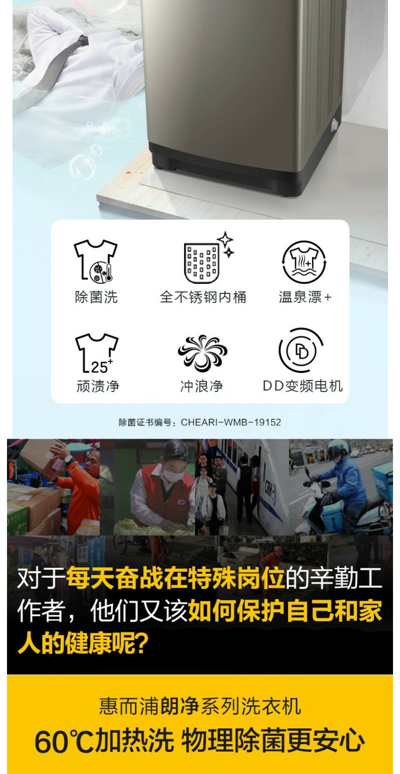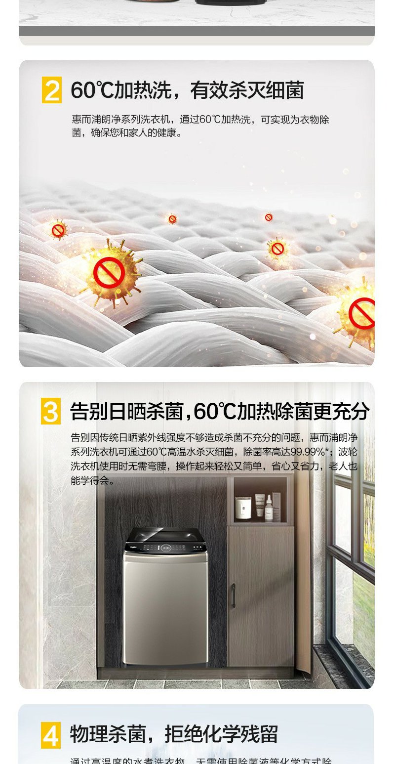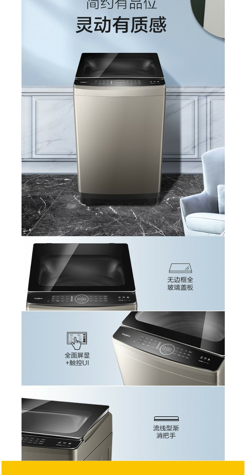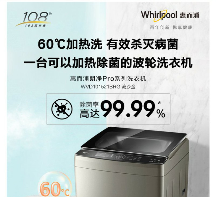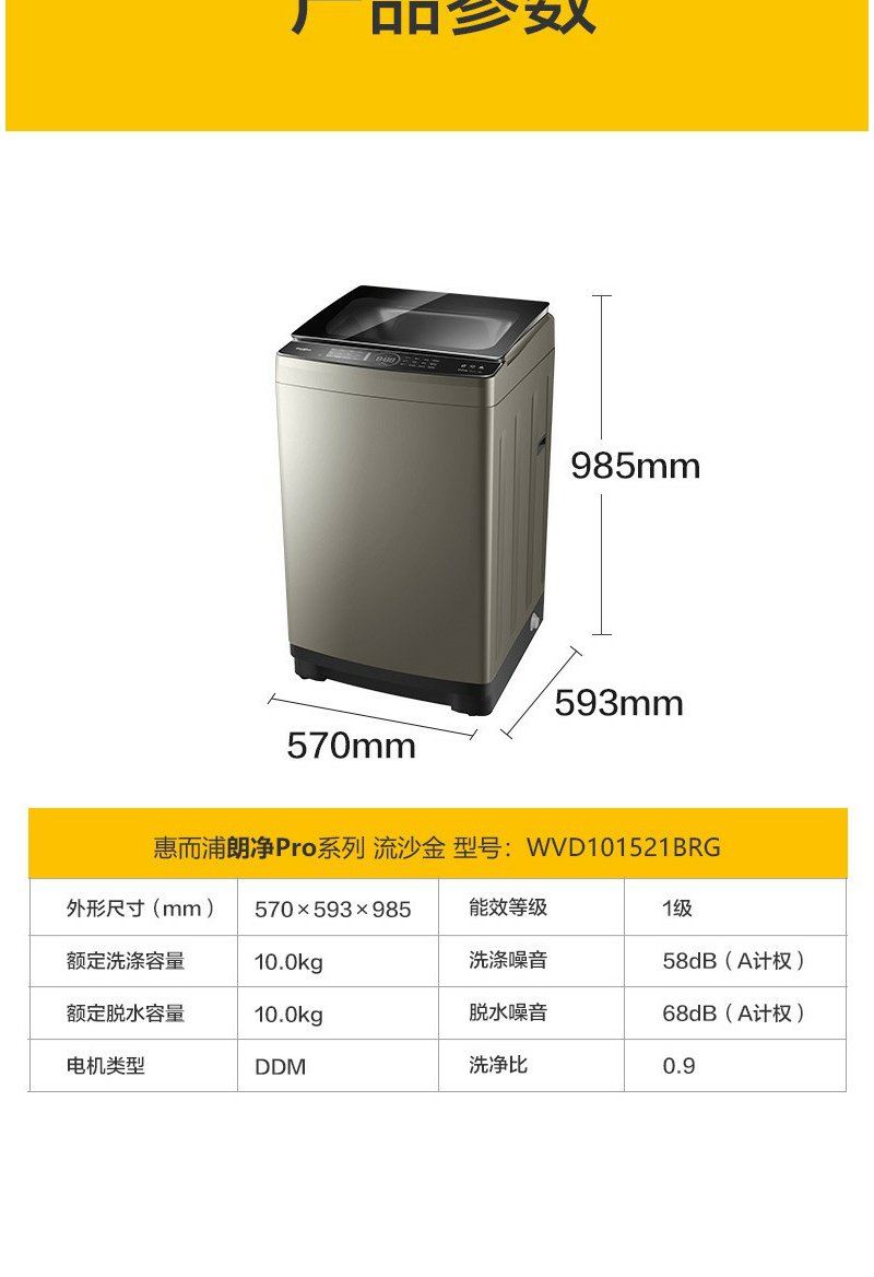 惠而浦 朗净系列10公斤 全自动波轮家用洗衣机 高温加热洗桶除菌DD变频电机WVD101521BRG流沙金