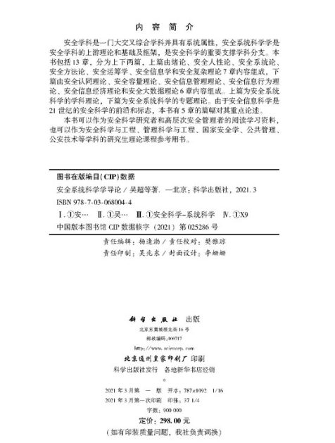 (仓发) 安全系统科学学导论/科学出版社/吴超等/9787030680044