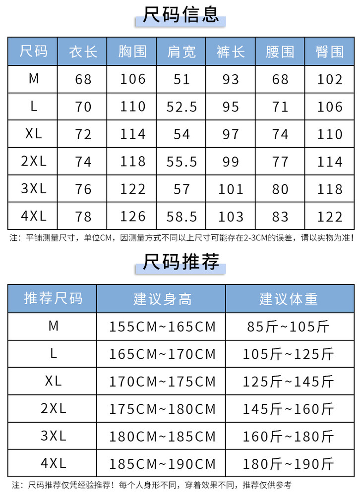 尺码:M(建议85-105斤),L(建议105-125斤),XL(建议125-145斤),2XL(建议145-160斤),3XL(建议160-180斤),4XL(建议180-190斤)