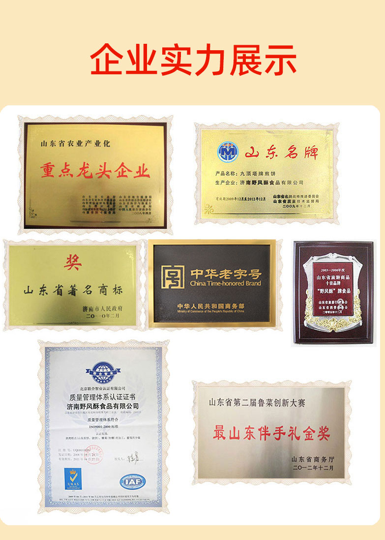 - 济南野风酥食品有限公司是一家从事绿色无公害农产品深加工,生产山东特产食品的企业。职工总人数586人,其中高中级技术人员56人。2007年济南野风酥食品有限公司被山东省人民政府授予省级农业产业化经营重点龙头企业。我公司生产的糖酥煎饼等系列产品曾连续获农业部、山东省优质产品奖,被人民大会堂定为国宴用品。“九顶塔”牌商标获得“省优”“部优”商标称号。全国著名的营养学家于若木曾来厂视察并亲笔题词,姜春云、苏毅然等国家、省级领导先后来厂视察。“野风酥”被中国食品协会评为“优秀民族食品”,获得“中华名吃”称号。产品连续获得国家级食品展销会的畅销产品奖,成为山东省的特色食品,省、市旅游局的十佳旅游商品。“山东煎饼”和“山东烧饼” 被认证为绿色食品。