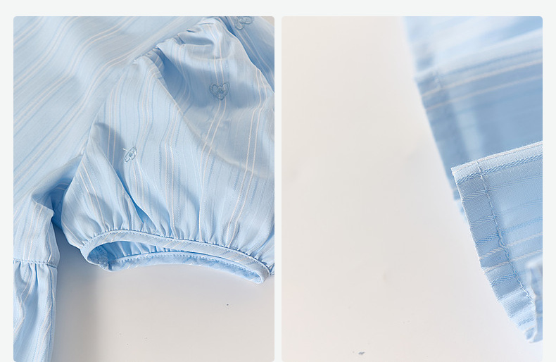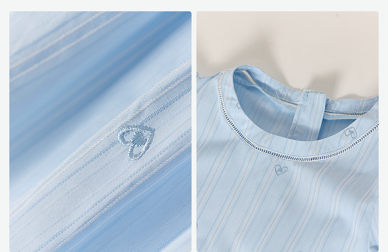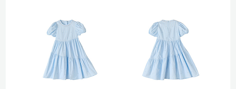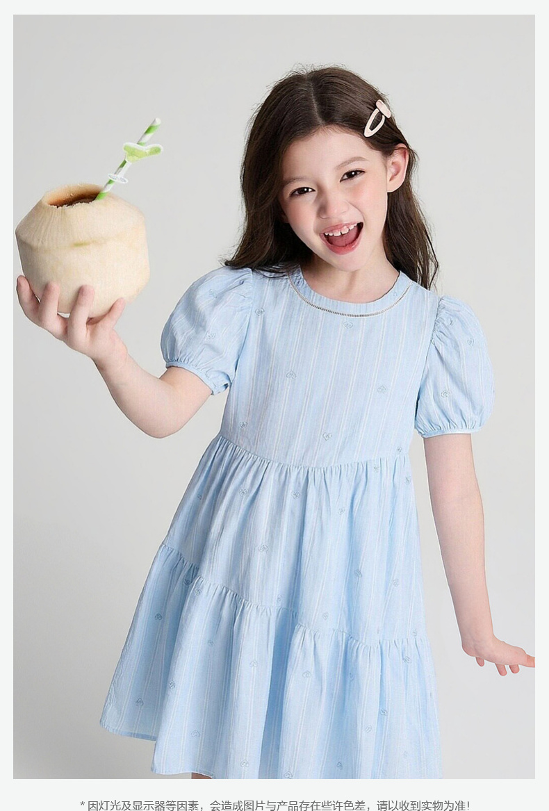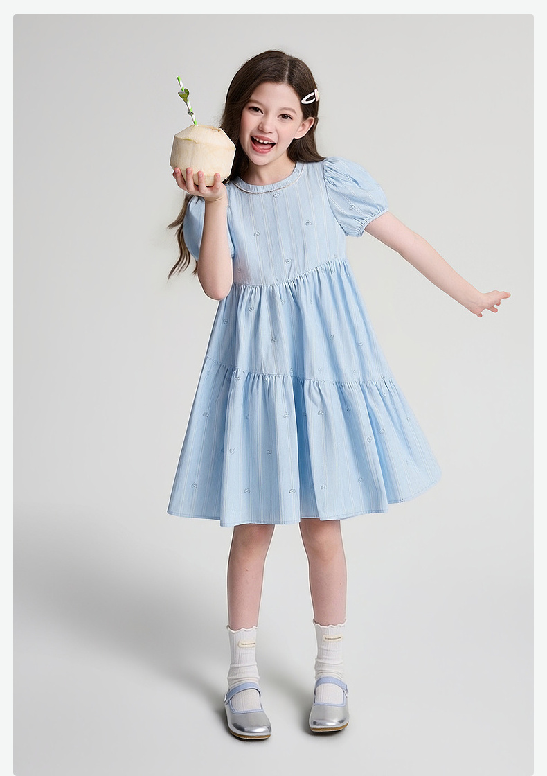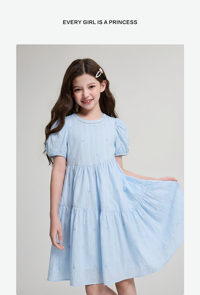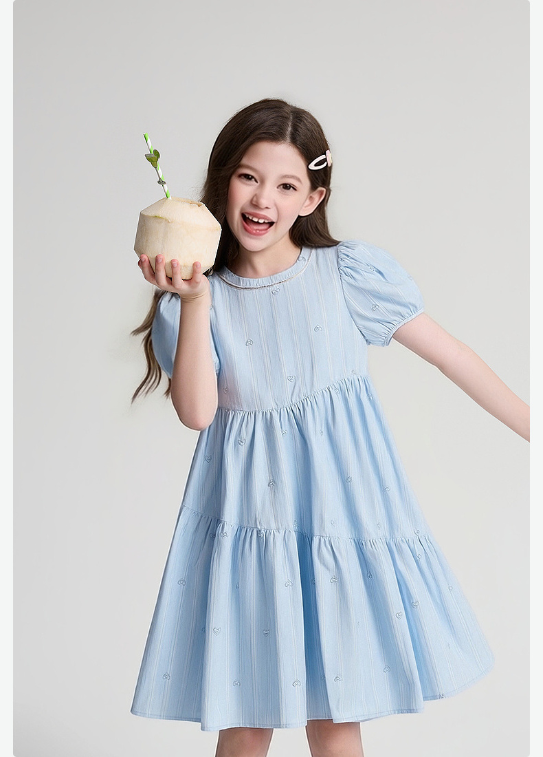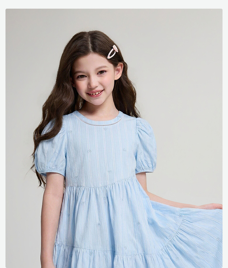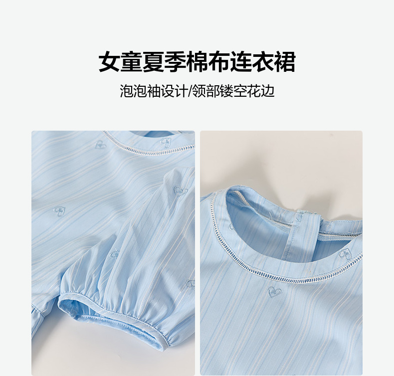 笛莎Deesha 2026年夏季新款中童女童F时尚出街肌理感蓝色条纹棉布精美刺绣泡泡袖连衣裙
