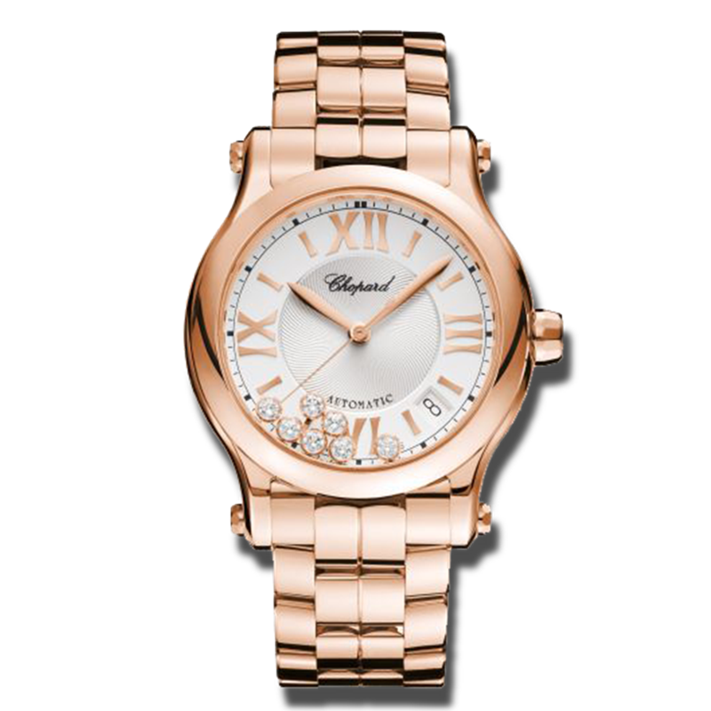 镜面材质 | 蓝宝石水晶玻璃 | 表盘 | 18K玫瑰金表壳 银色表盘 罗马文及条形时标,7钻钻石 日期显示 背透,透明蓝宝石水晶底盖 |