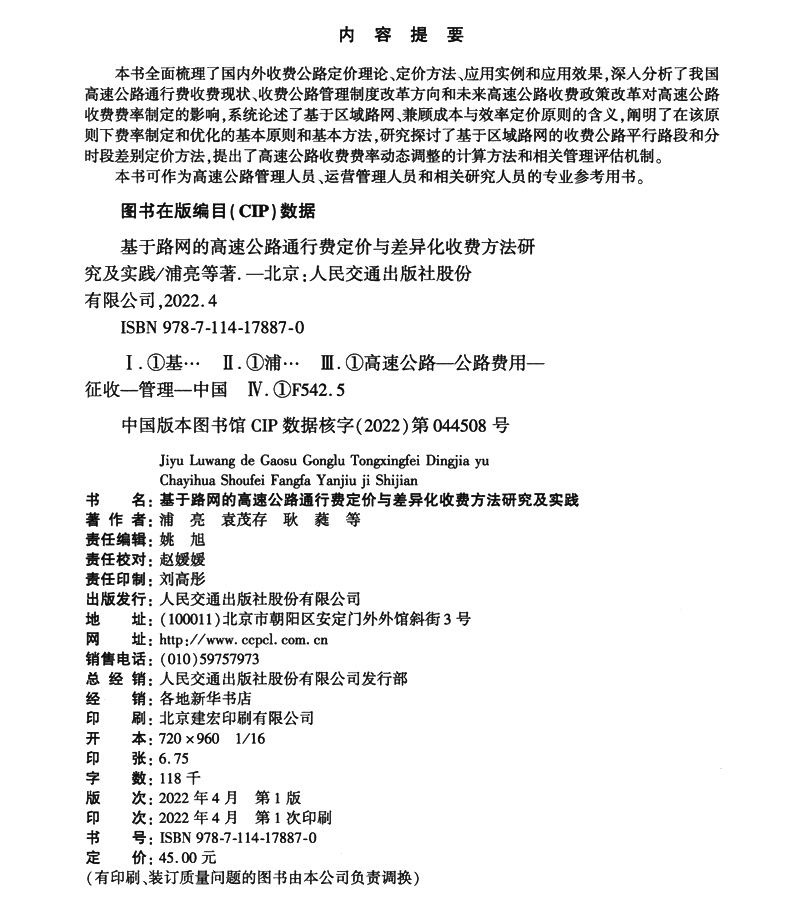 书名:基于路网的高速公路通行费定价与差异化收费方法研究及实践