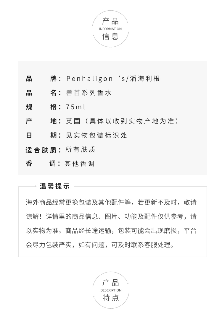 Penhaligon's潘海利根兽首家族系列香水75ml狐狸麋鹿男女香水【CDF】