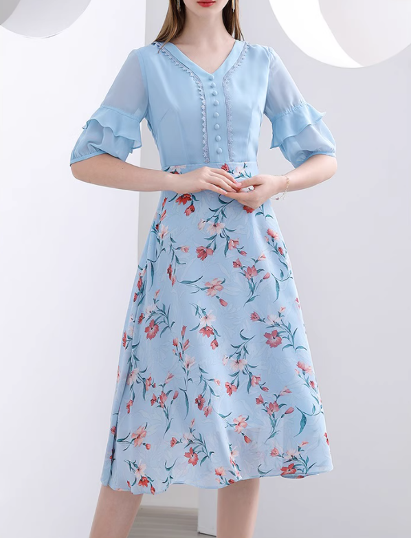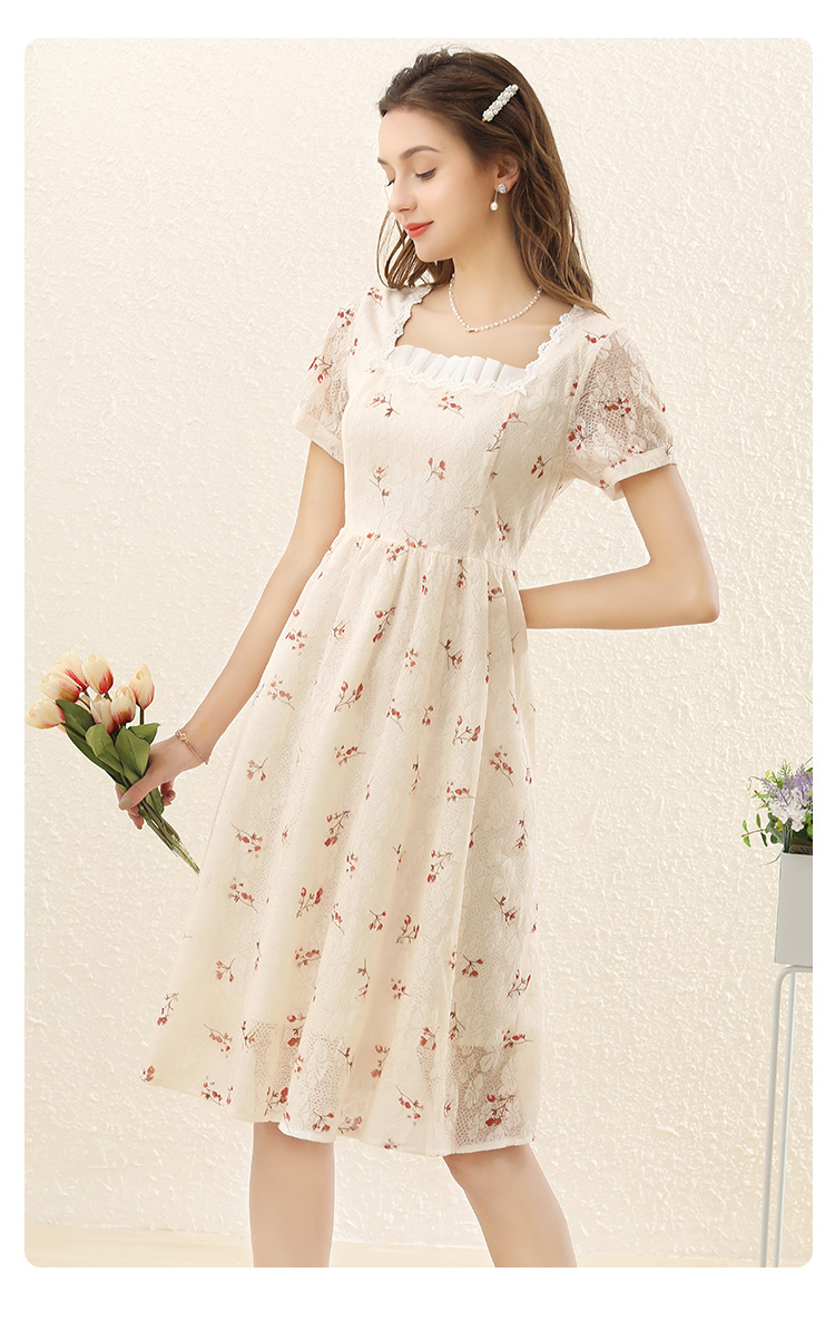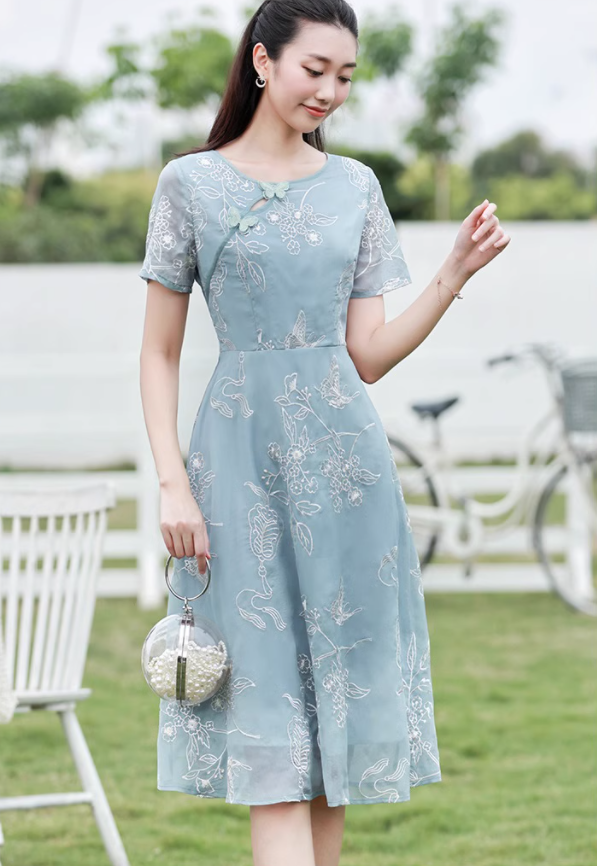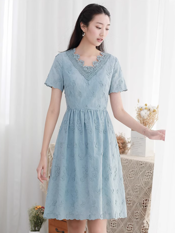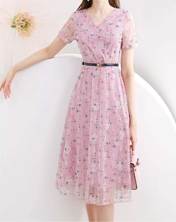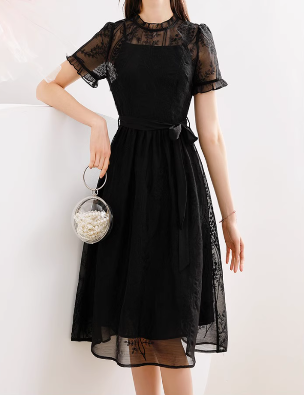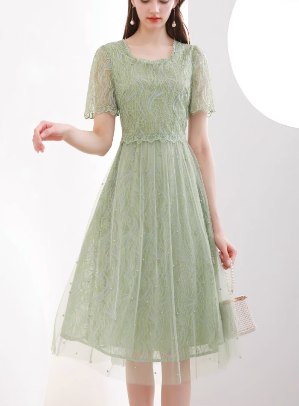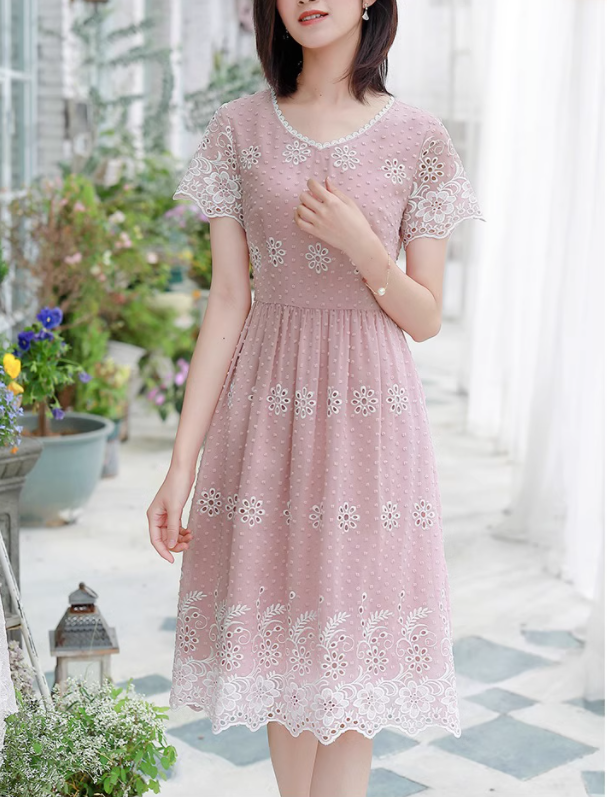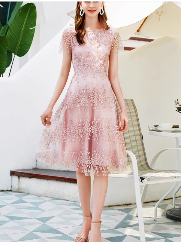 未风网纱刺绣连衣裙女春2024春季新款女装气质淑女七分袖显瘦裙子