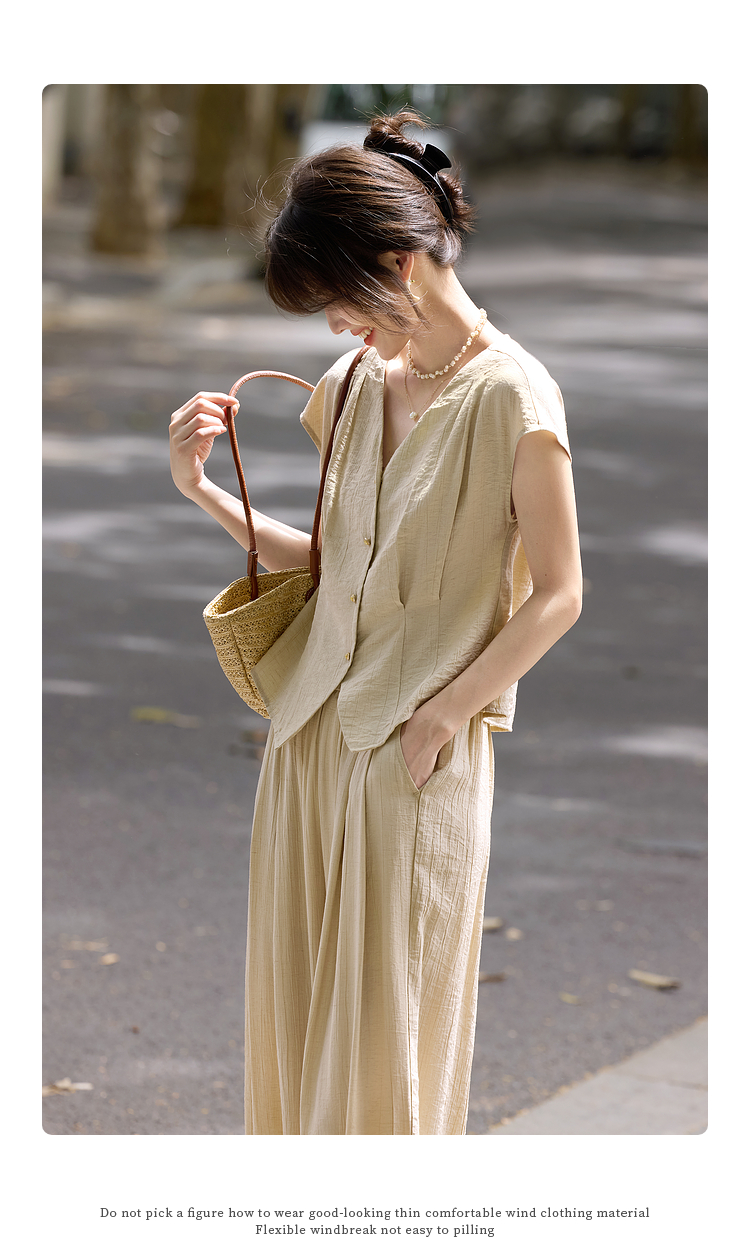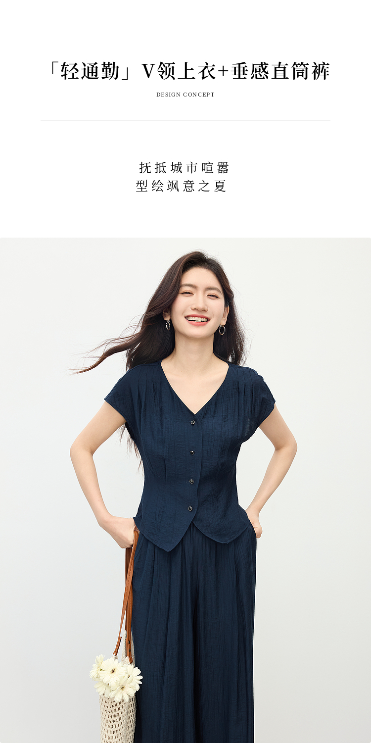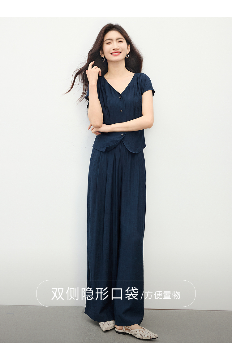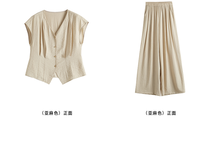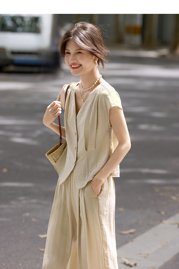 【周末秒杀】熙世界通勤仿亚麻V领上衣阔腿长裤两件套女2025夏季知识分子套装