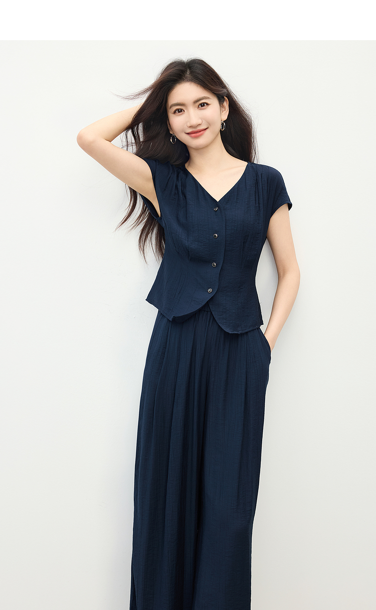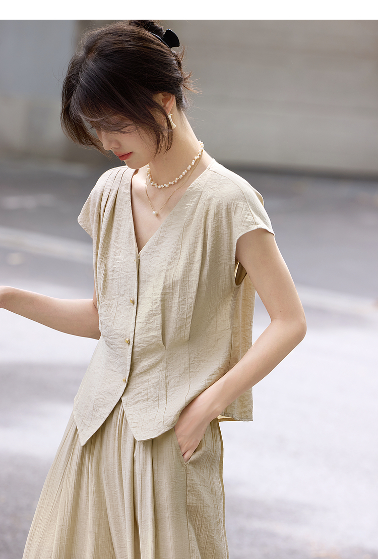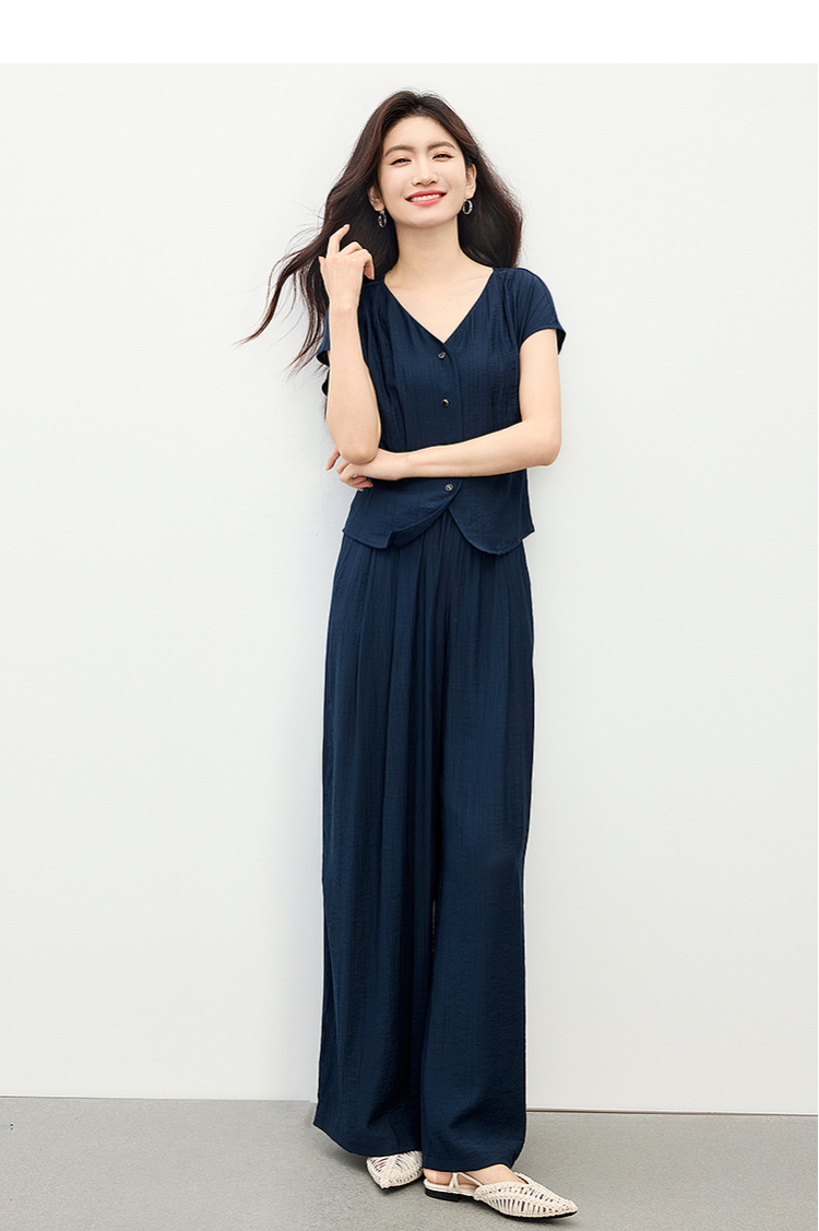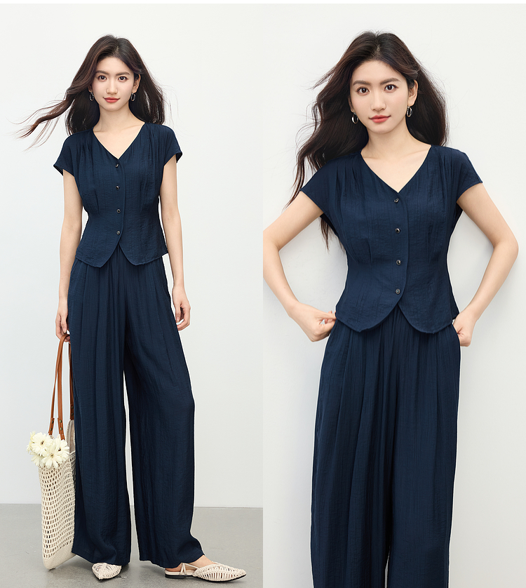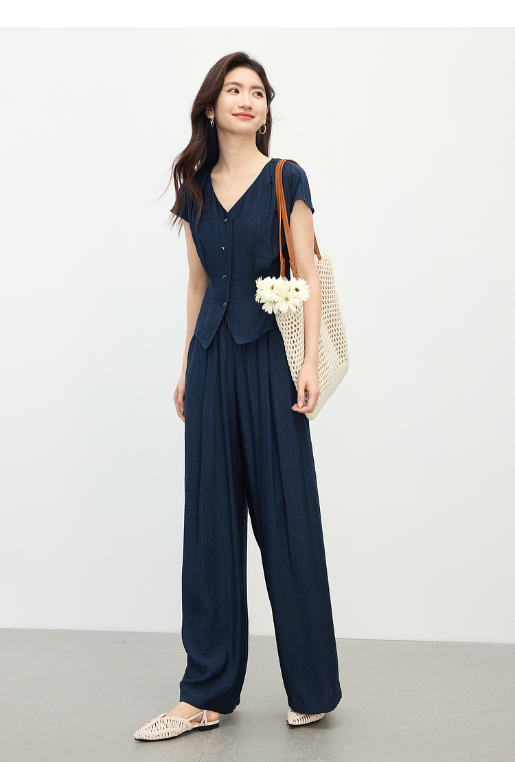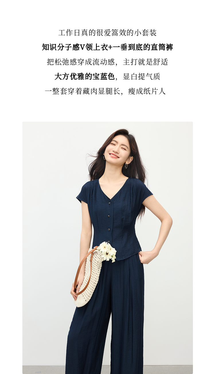 【周末秒杀】熙世界通勤仿亚麻V领上衣阔腿长裤两件套女2025夏季知识分子套装
