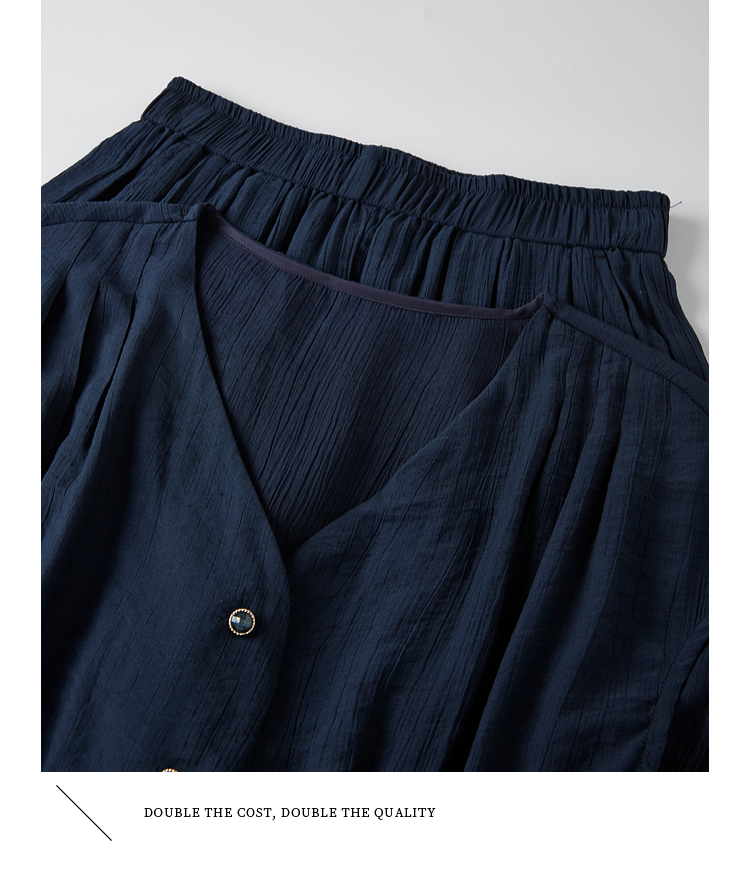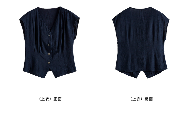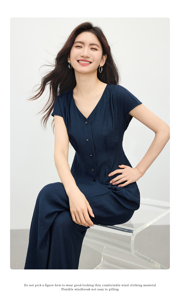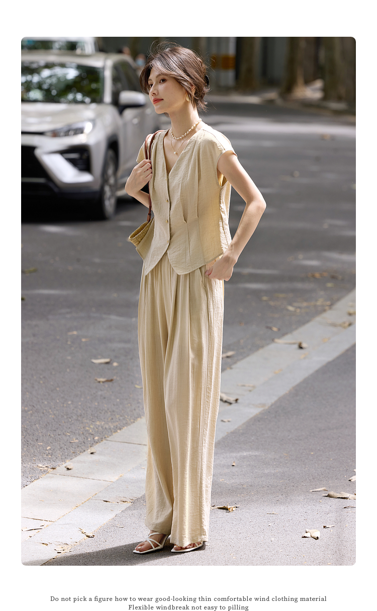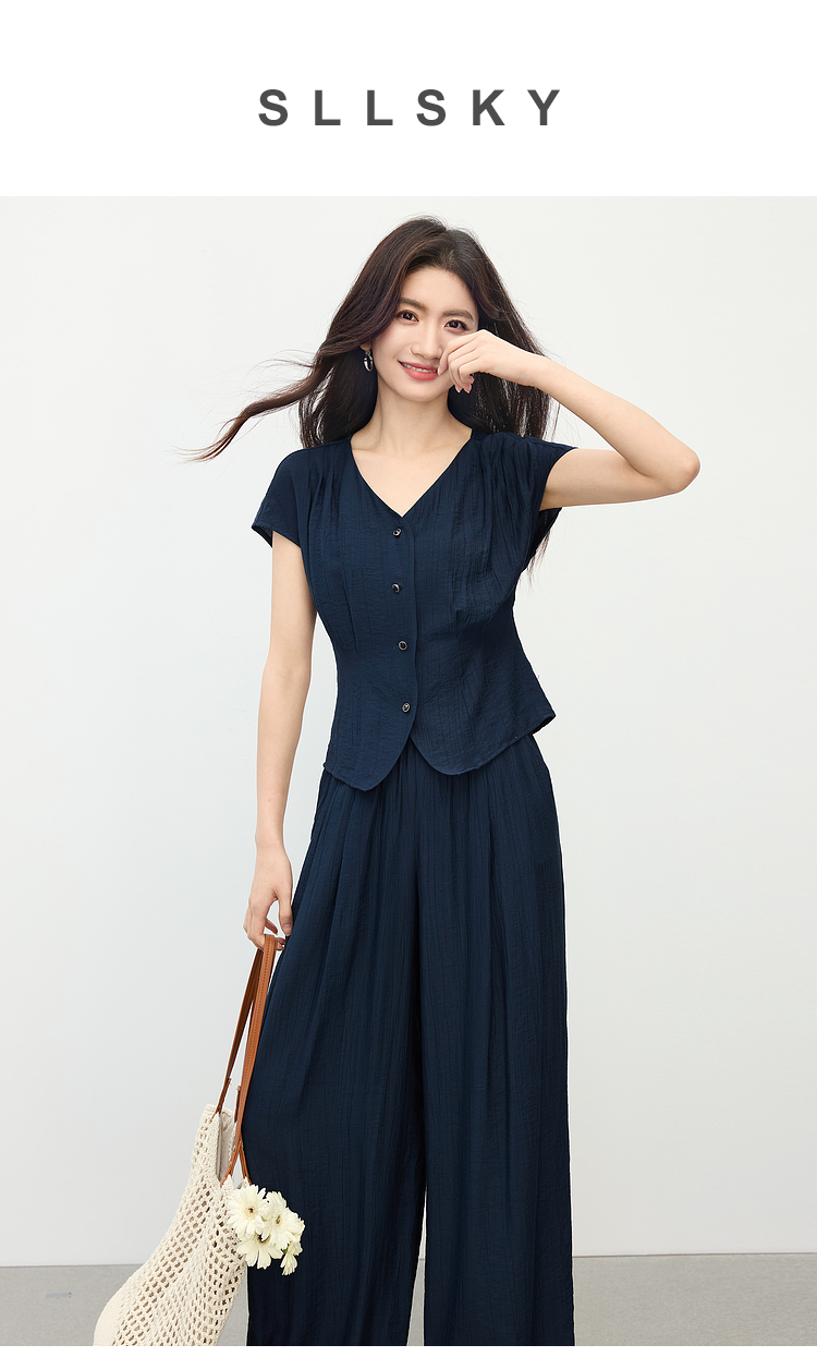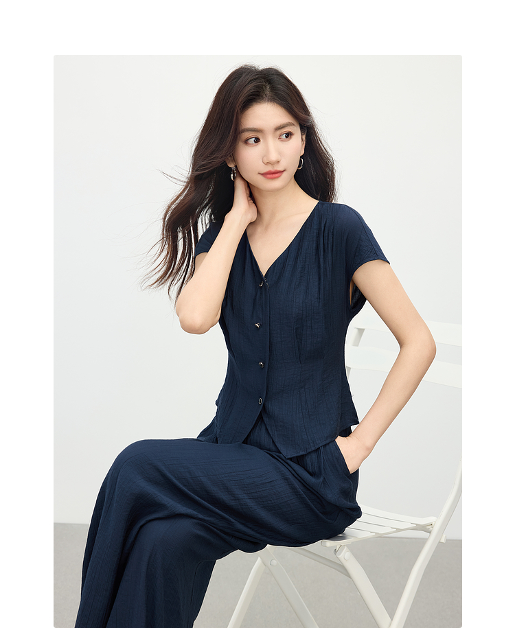 【周末秒杀】熙世界通勤仿亚麻V领上衣阔腿长裤两件套女2025夏季知识分子套装