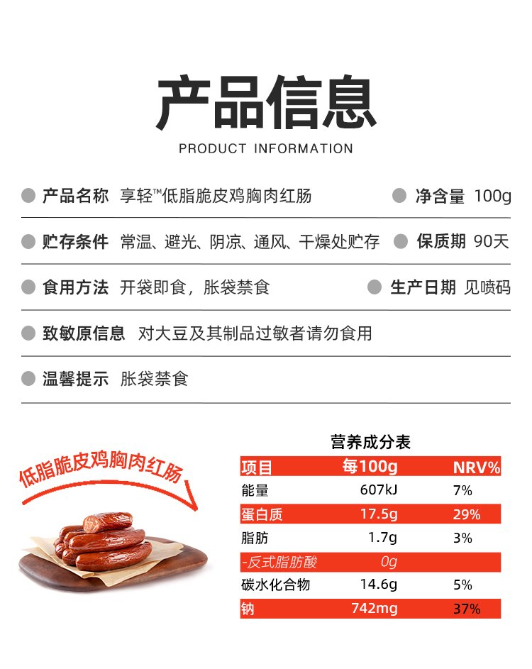 【退酮过渡】【生酮不可】享轻™低脂脆皮鸡胸肉红肠100g/袋