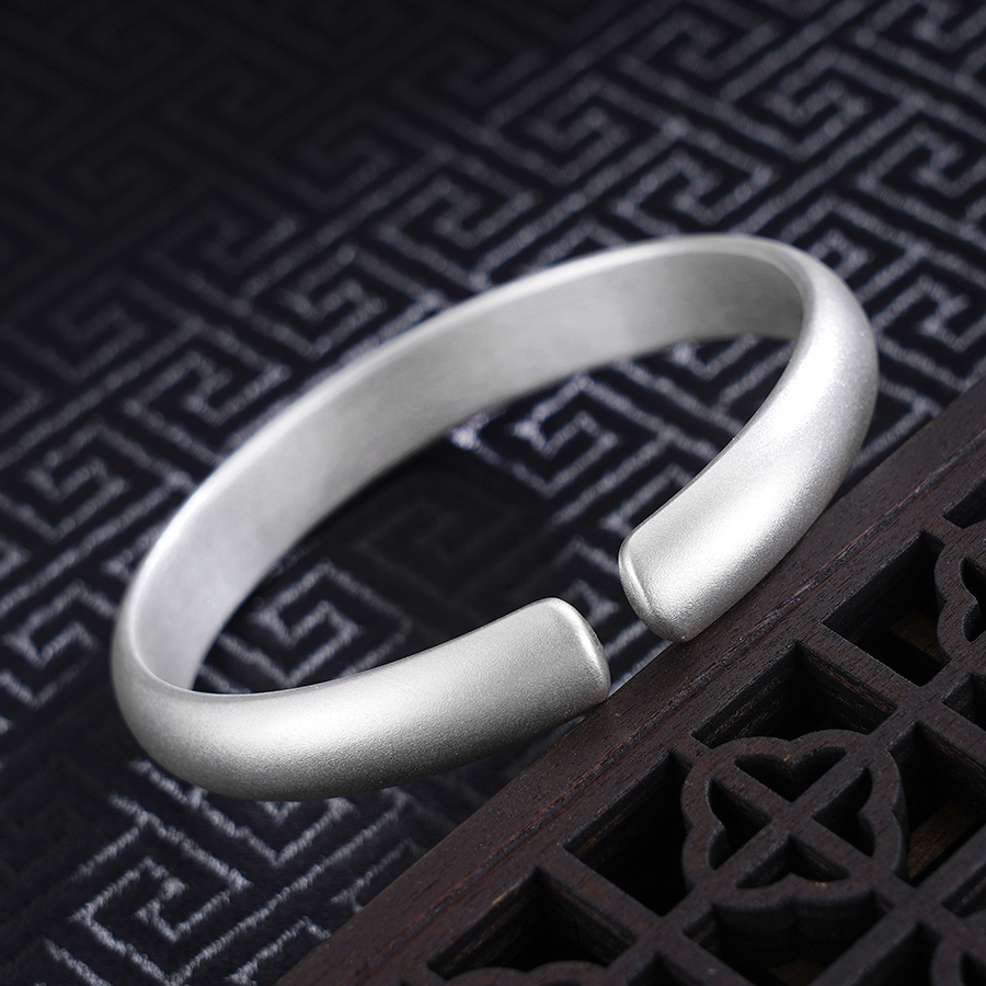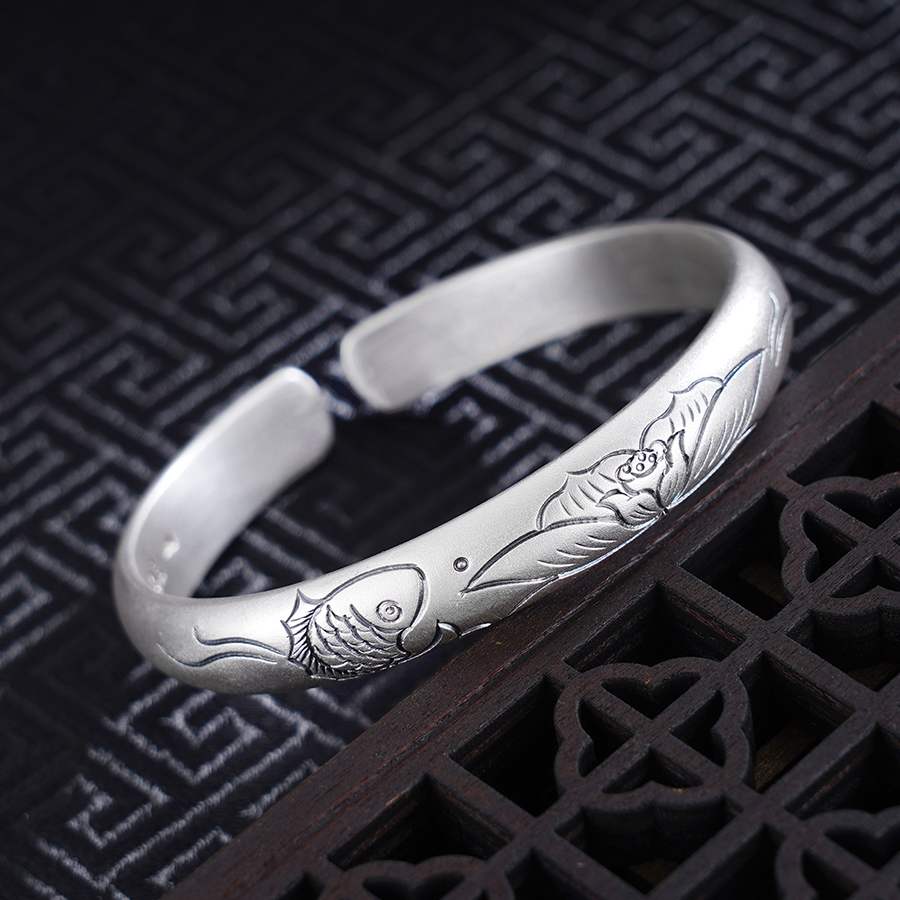 【寓意】:纯银开口手镯,镯面錾刻游鱼戏莲之景,莲鲤相映,恰似天赐良缘,寓意清涟为证,缘定今生。