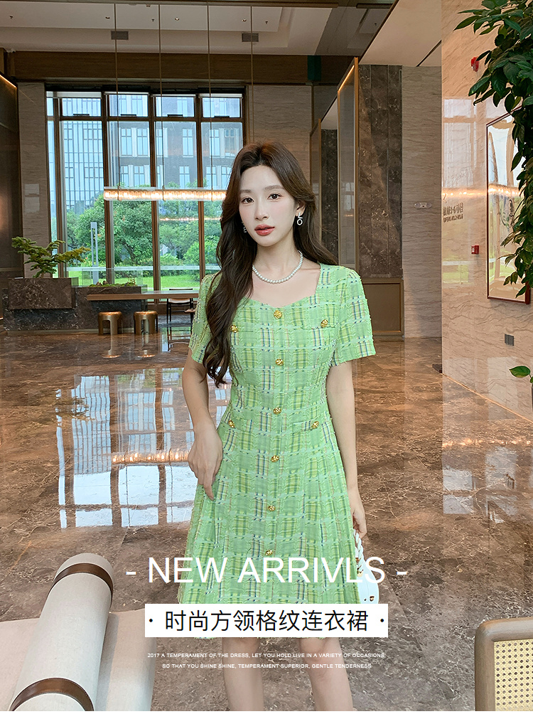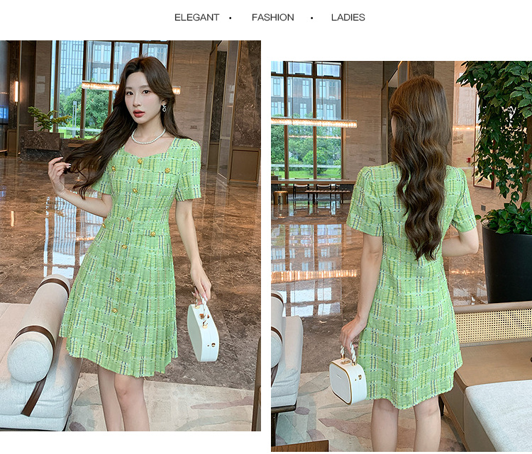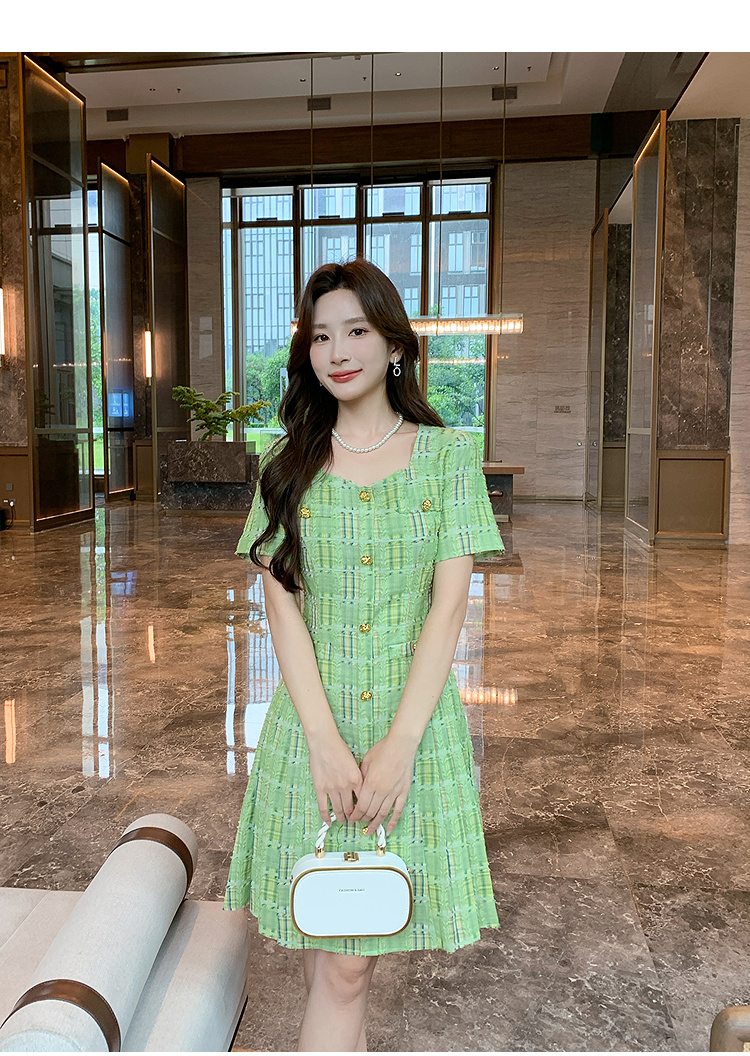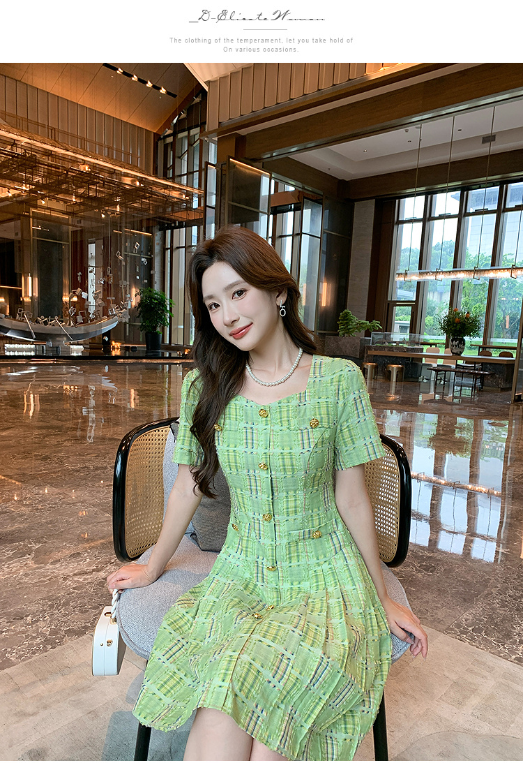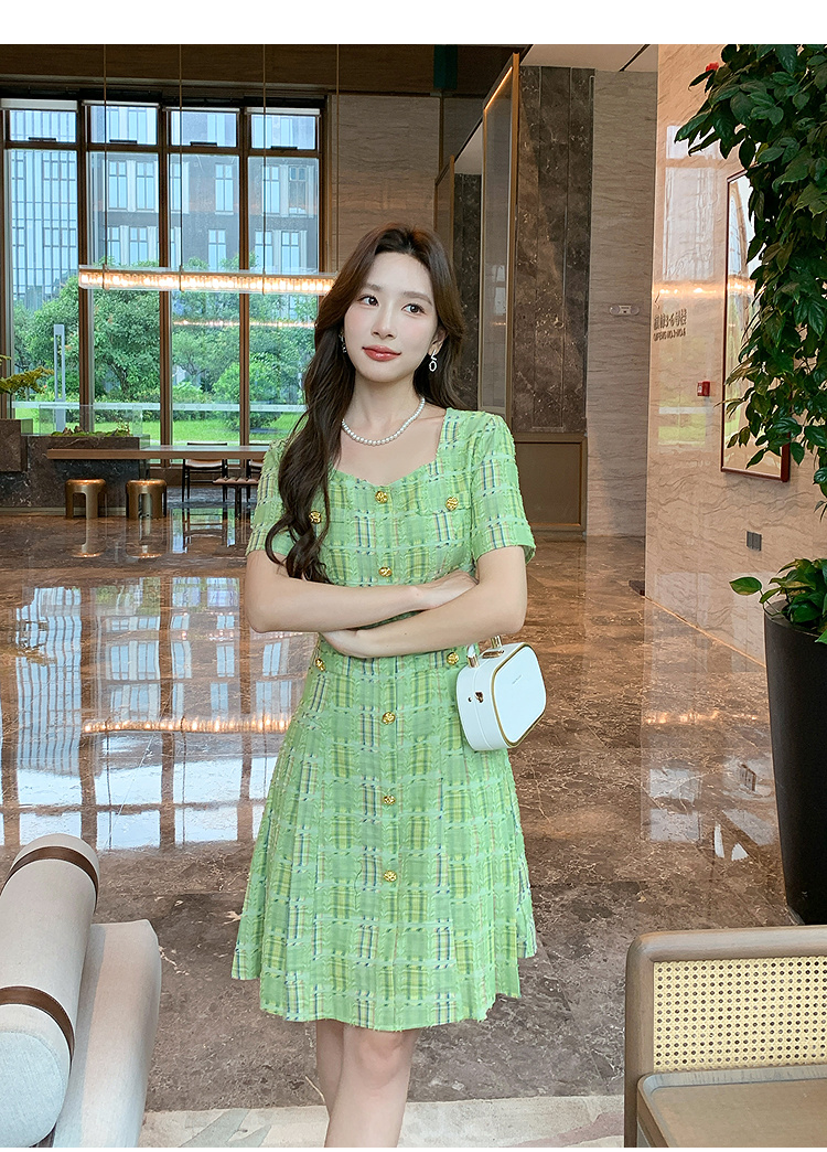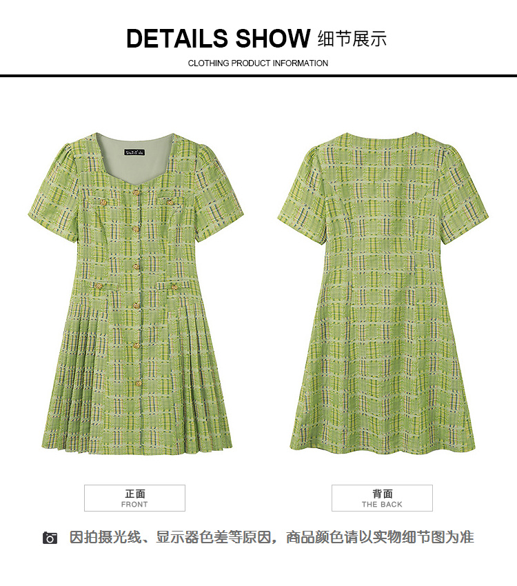 奢姿大码女装2025年夏季新款时尚复古方领格纹短袖百褶连衣裙子9952869830