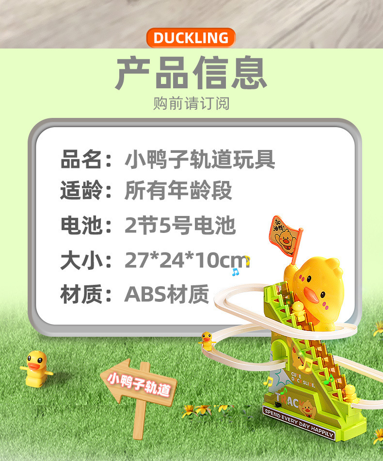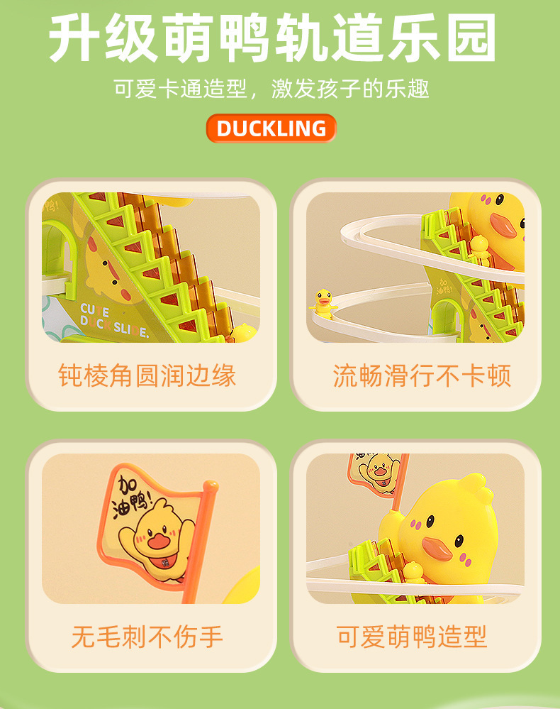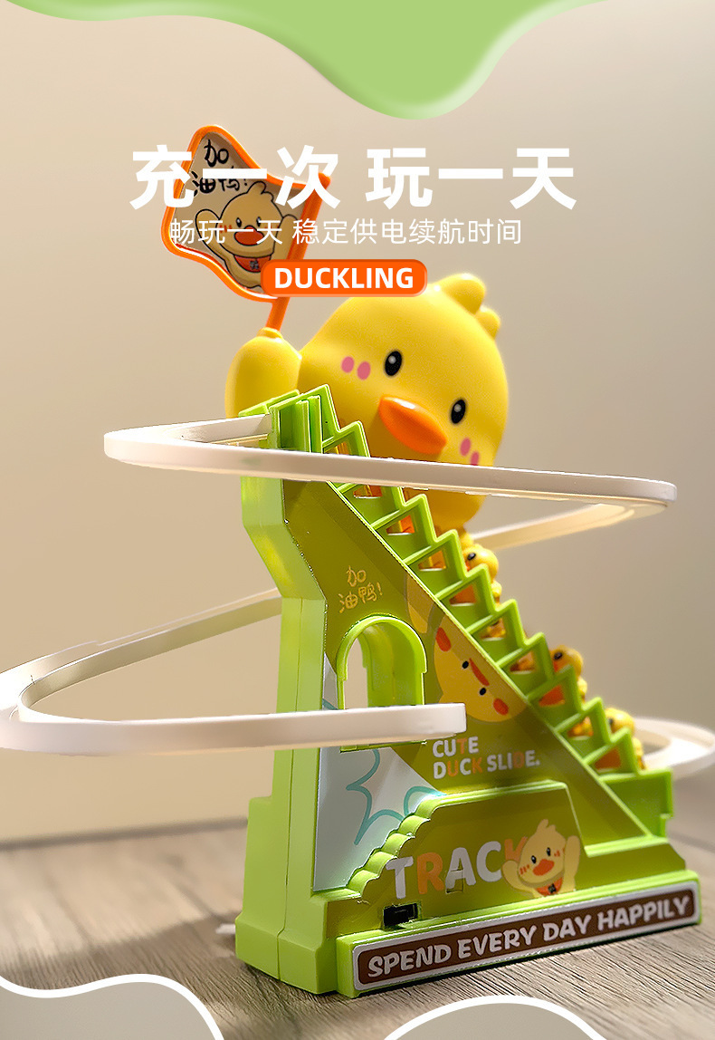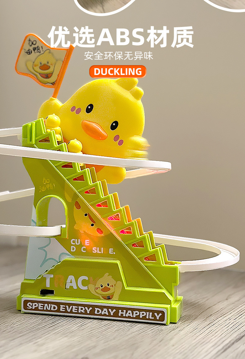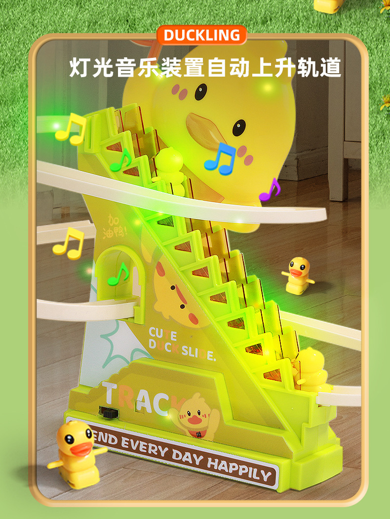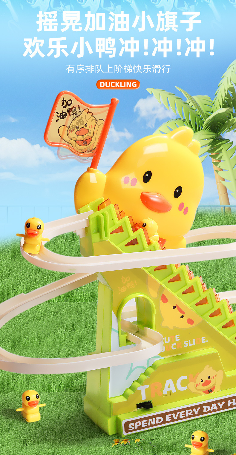 【萌鸭爬楼梯❗️灯光音乐装置】摇旗子小鸭子自动爬楼梯灯光音乐儿童玩具抬头训练益智拼装滑滑梯。jd