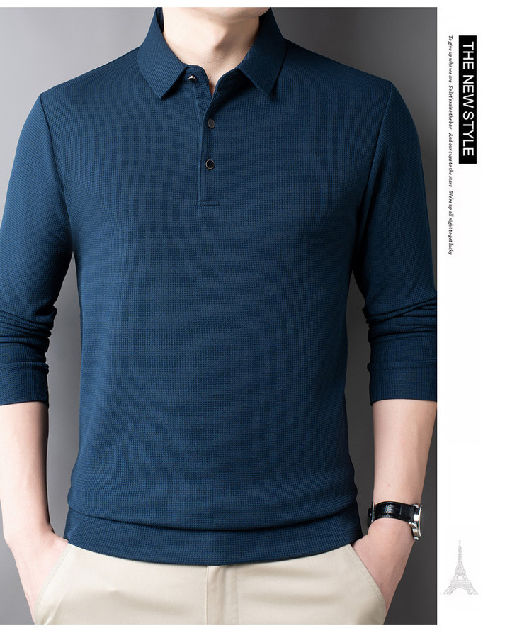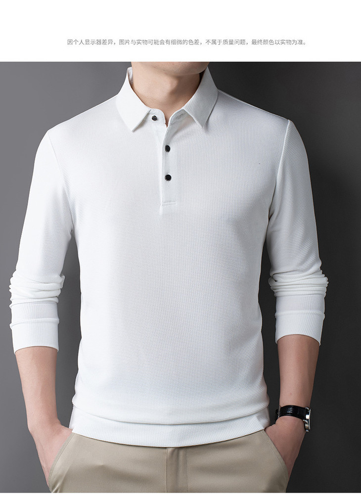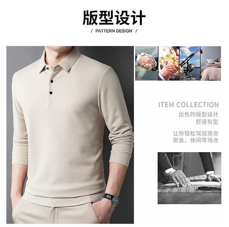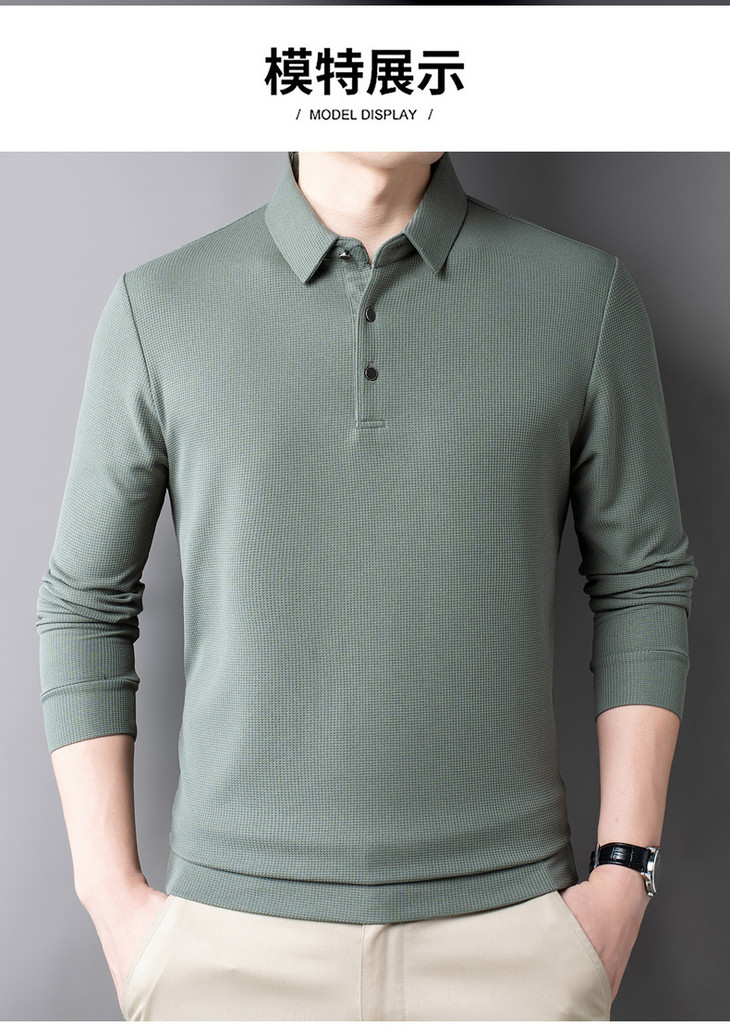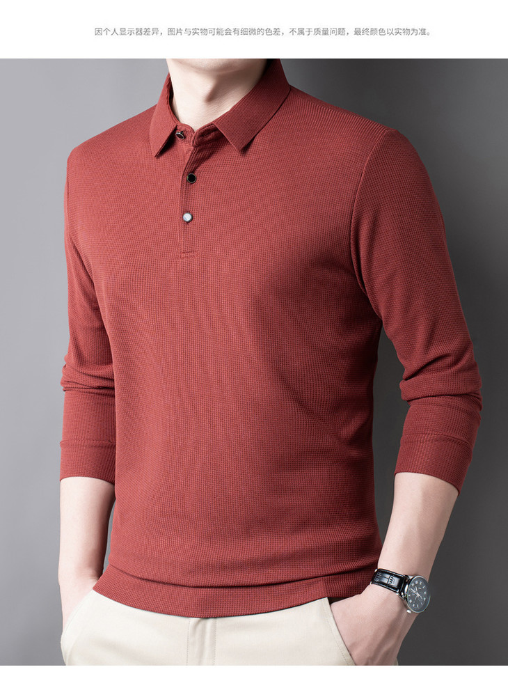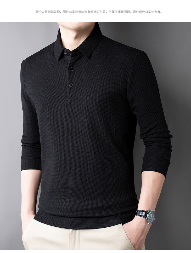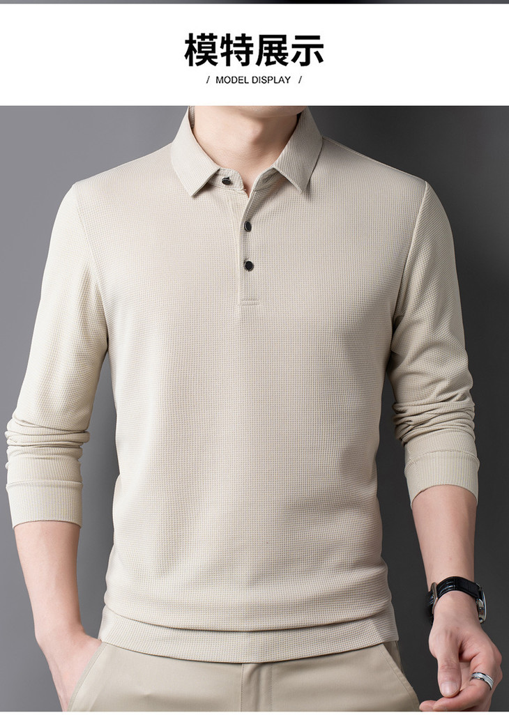 男士长袖t恤秋季新款纯色翻领华夫格POLO衫中青年休闲体恤