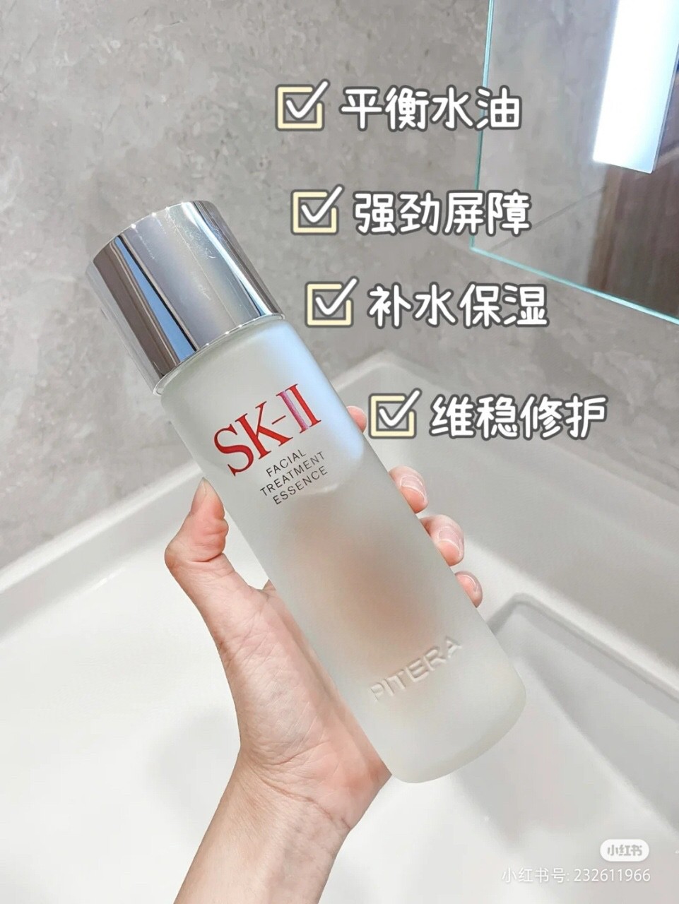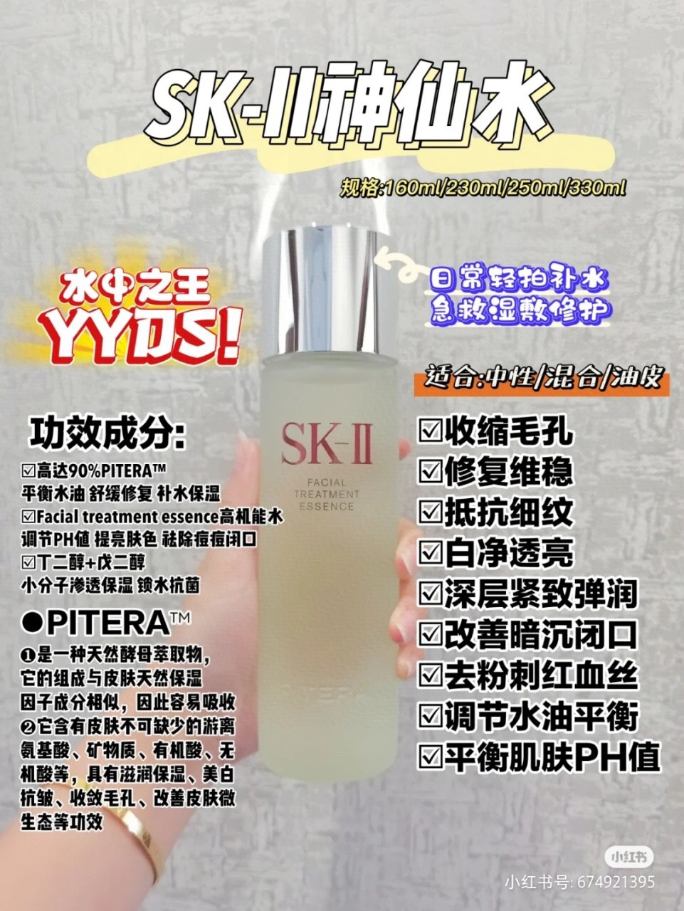 不用介绍了吧,相信集美们都了解,只有20来瓶230Ml,可以囤哦,sk神仙水它不是普通的爽肤水或者化妆水!是一瓶水状精华!也就是精华水!一瓶神仙水里蕴含超过90%PITERA !帮助补充皮肤所需要的各种营养,超级亲肤好吸收~可以很好的渗透到皮肤里,补水保湿!质地也是清爽不黏腻!可以让肌肤状况更加稳定, 维持水油平衡也是优秀!一边给干燥肌肤来补充水分,一边维持容易出油部位的细腻清爽~ 皮肤状况 差 鼻翼毛孔粗大,各种暗沉! 都靠他来拯救,坚持用是能感受到皮肤变得弹润紧致,细腻有光泽! 而且神仙水中的PITERA结构和肌肤天然保湿因子非常相似,所以可以轻松的被皮肤给吸收~让皮肤越来越健康!皮肤状态真的肉眼可见的能变好!日常使用的时候,早晚都可以用,在洁面和爽肤水之后,先倒3~5滴精华水在手心,两手压在一起湿润手掌,再用手轻拍脸部和脖子疼,帮助吸收像秋冬皮肤干燥粗糙的时候,还可以多拍几次精华水,或者湿敷一下~皮肤感觉会喝饱了水!