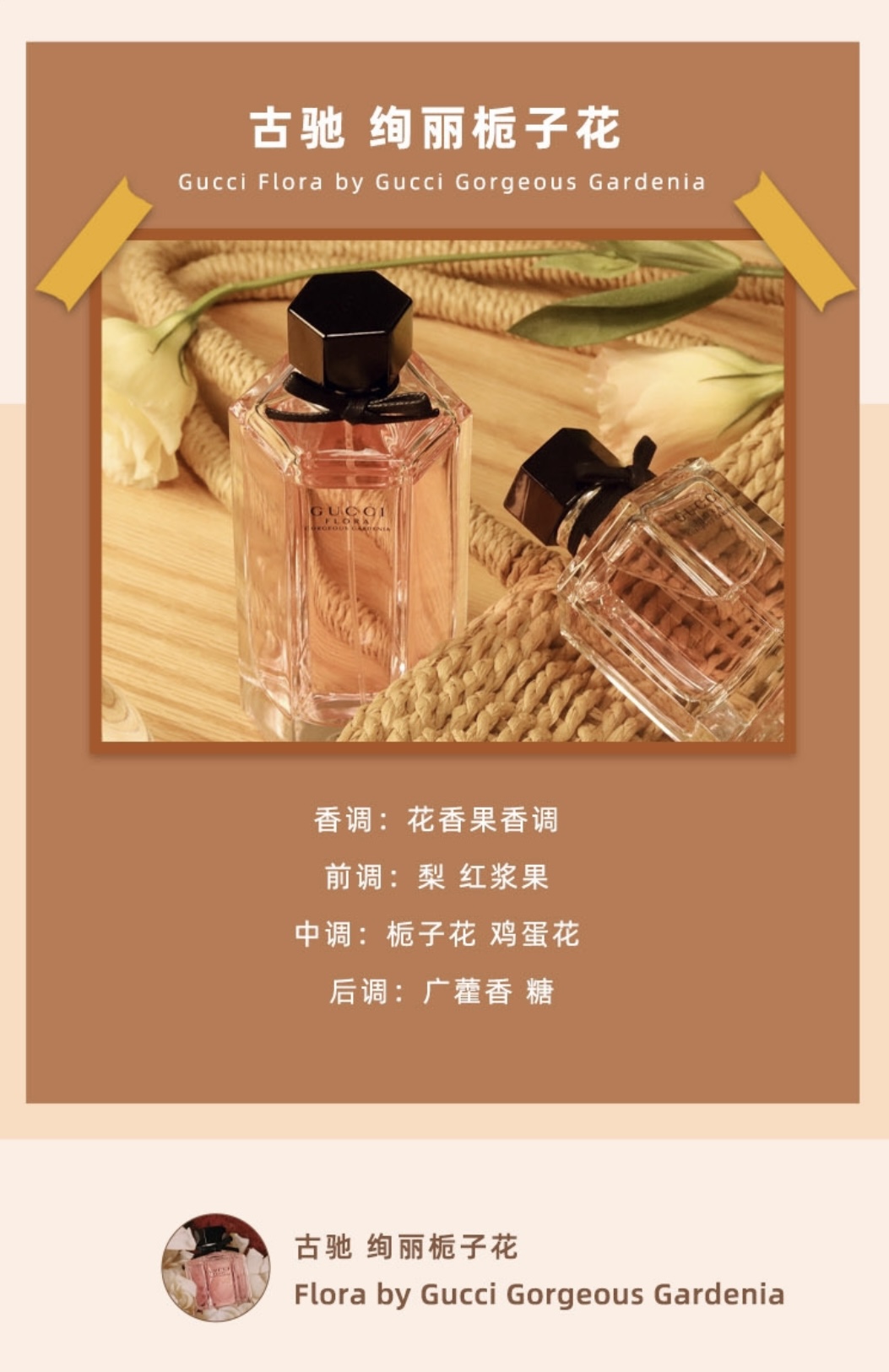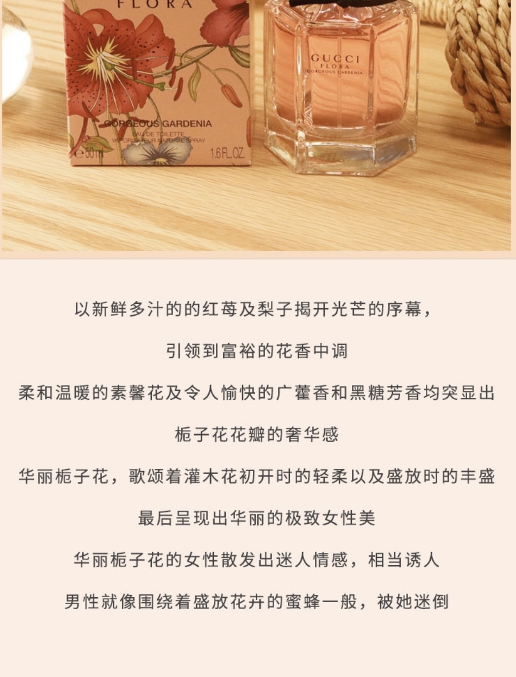 这瓶Gucci的栀子花香水真的打破了我对花香调的本有想法! 这瓶香水是生日的时候朋友送的,味道非常少女,虽然是花香调但却甜而不腻!很清新的甜,真的很好闻!喷上你就是那个翩翩起舞的花之少女了!