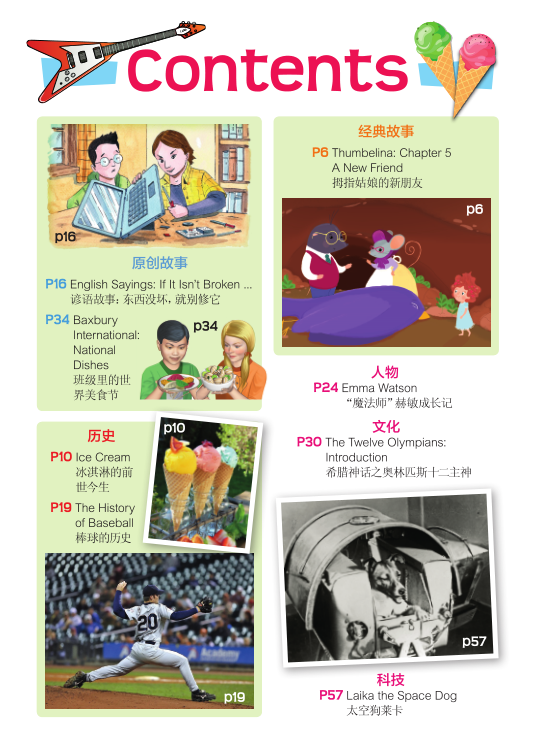 冰淇淋不仅好吃,还会说话,让我们一起听听它们的前世与今生吧;棒球作为受全世界人民喜爱的球类运动,早已不是一年半载的事情了,背后的故事源远流长;钢琴、小提琴、吉他被称为世界三大乐器,吉他的魅力到底在哪呢,请听我们为你娓娓道来。
