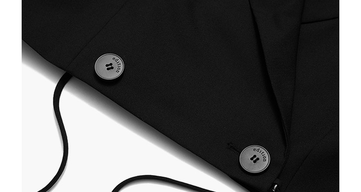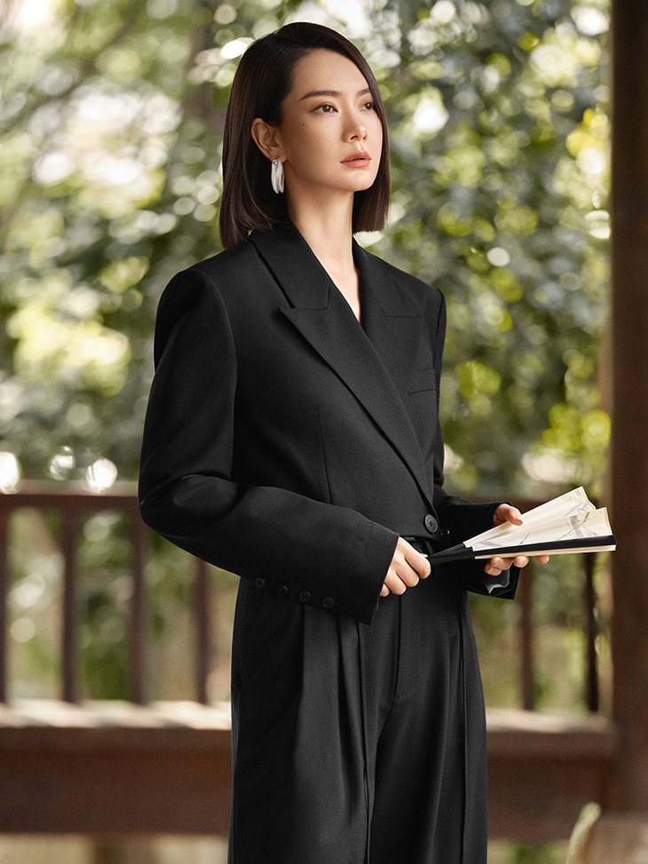 经典西装戗驳领叠门襟,衬显利落帅气。