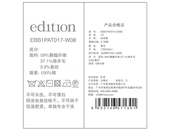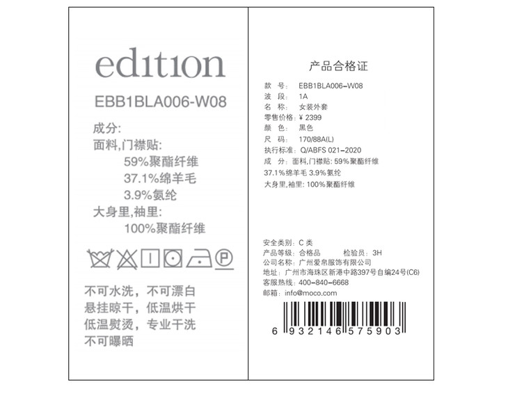 面料,门襟贴:59%聚酯纤维 37.1%绵羊毛 3.9%氨纶