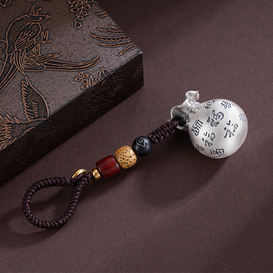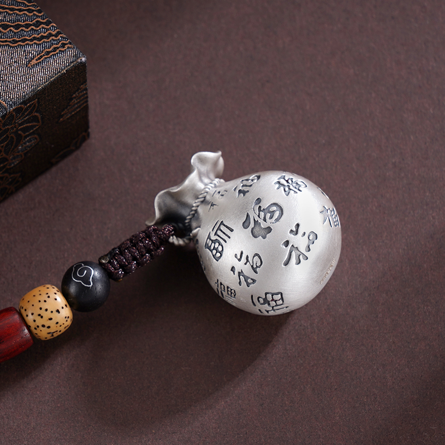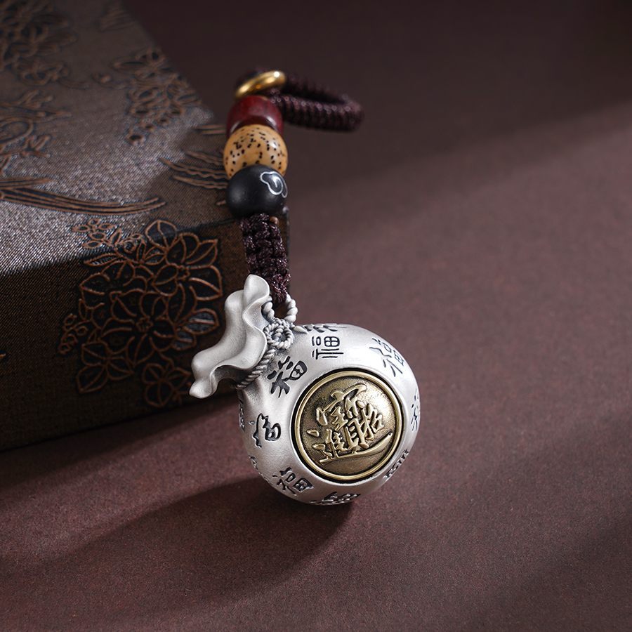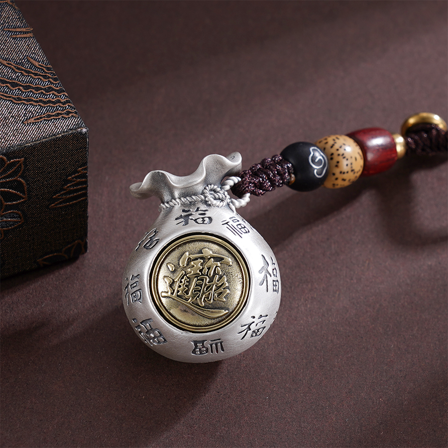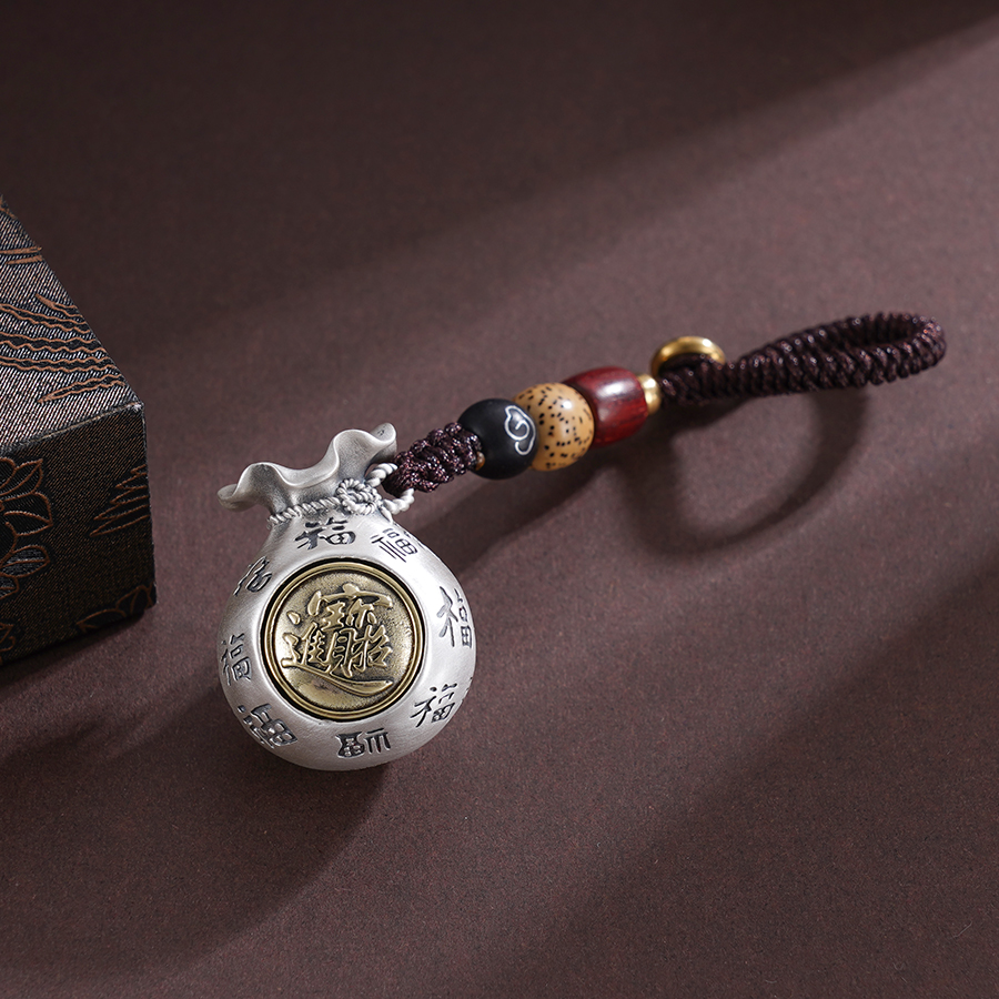【寓意】:一双抓钱手,还需配个聚钱斗。钱袋造型钥匙扣,助力主人打开财富之门。钱袋外侧錾刻“百福”,寓意八方来财,福气生财。