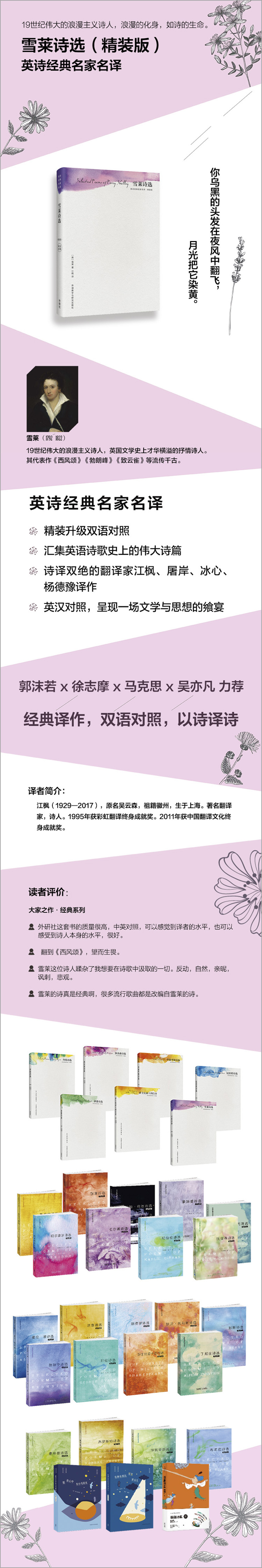 《雪莱诗选:精装版》从雪莱的诗集中精选若干名篇,充分地展现了雪莱作品丰富的想象力和高超的诗歌技巧。其中,《西风颂》更是读者熟悉的外国浪漫主义诗歌之一。本书的中文部分选用了大获好评的江枫译本,译者江枫获彩虹翻译终身成就奖,译文浪漫动人,带读者领略雪莱诗中的浪漫与美。