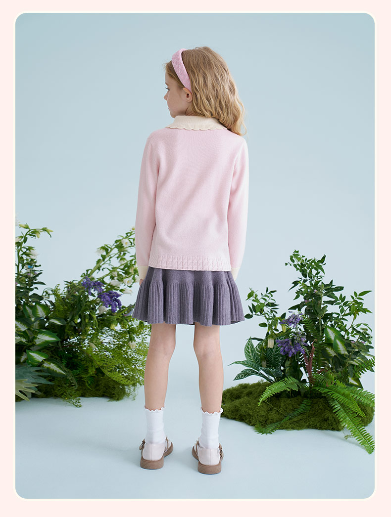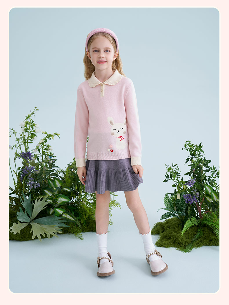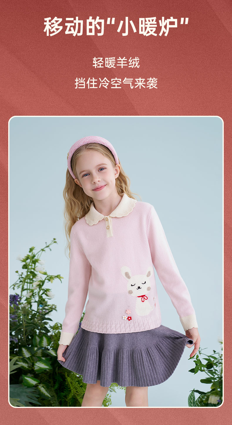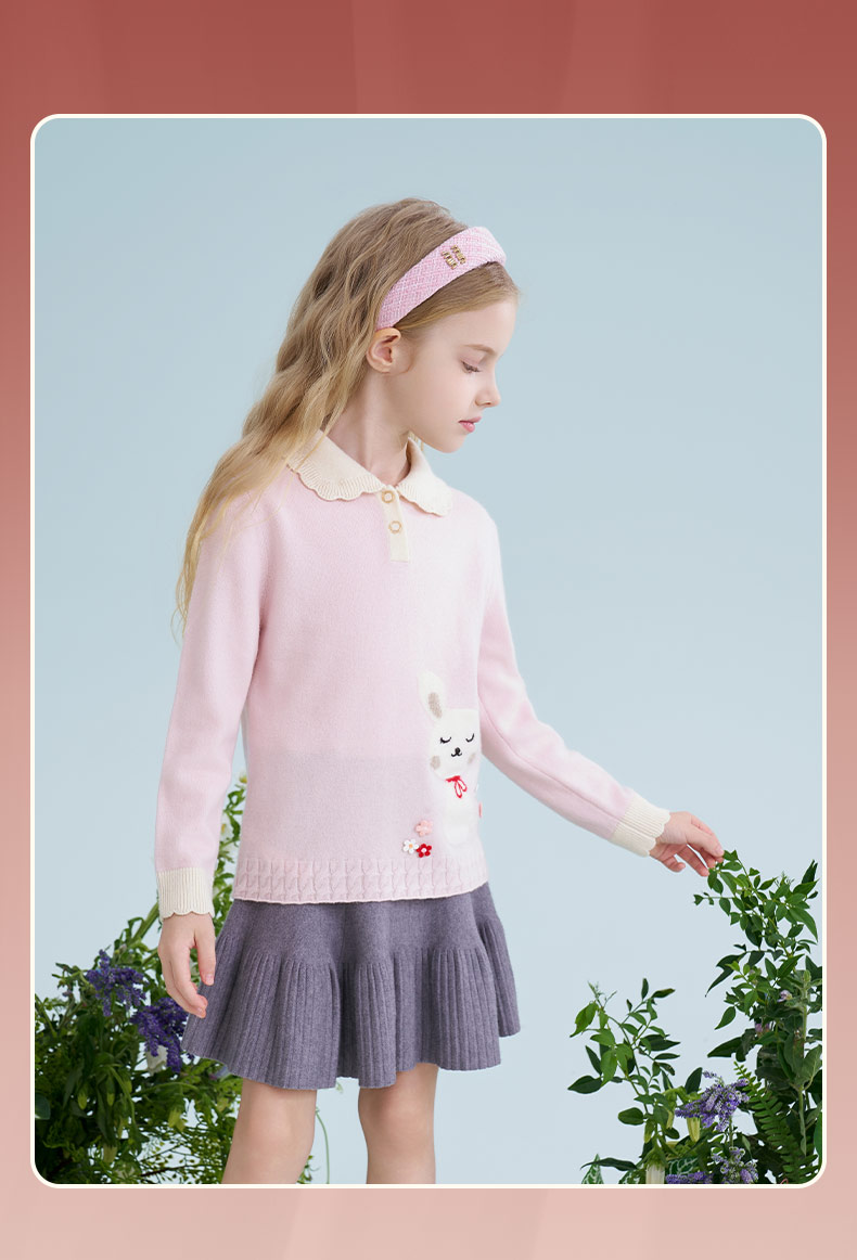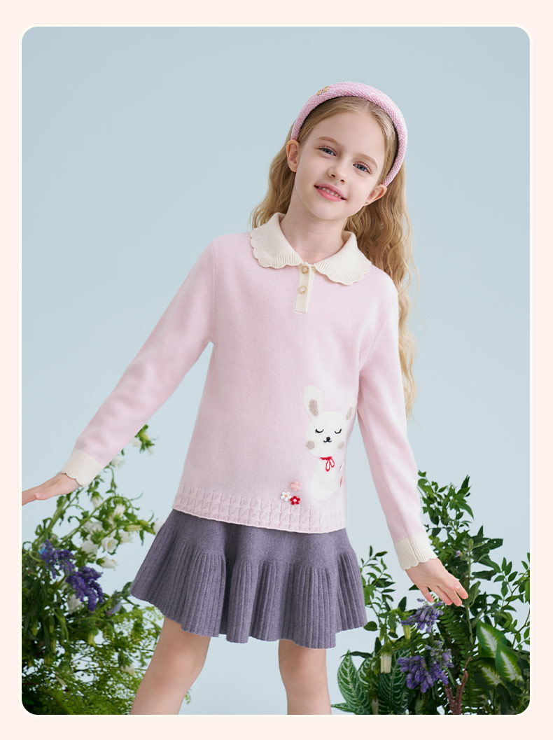 mettekids儿童100%羊绒衫2025春季新款女童粉色甜美翻领针织毛衣