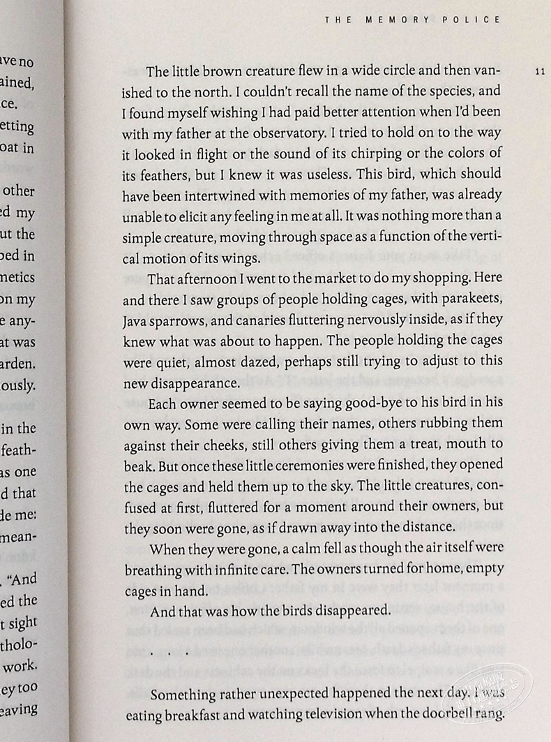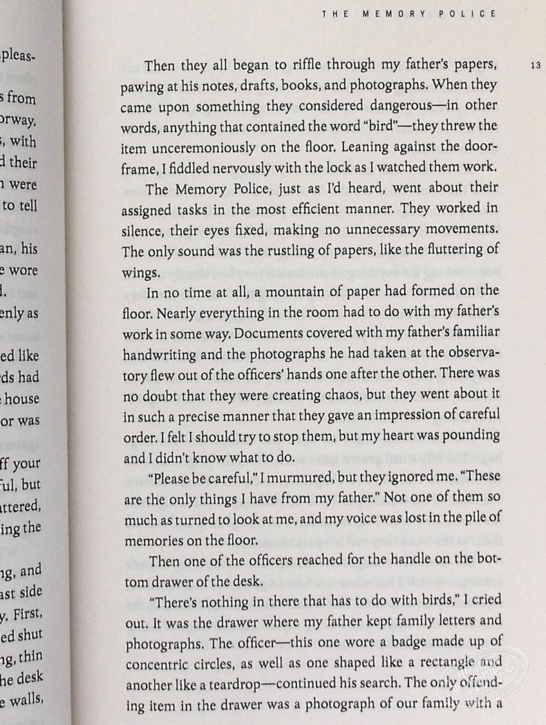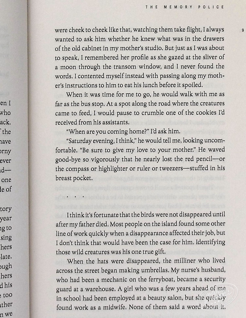 Hat, ribbon, bird, rose. To the people on the island, a disappeared thing no longer has any meaning. It can be burned in the garden, thrown in the river or handed over to the Memory Police. Soon enough, the island forgets it ever existed.
