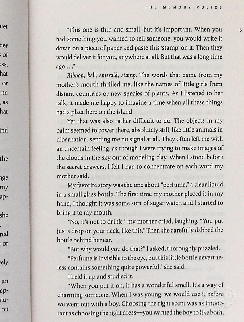 我们居住的小岛上,事物陆续消灭。缎带、铃铛、邮票、绿宝石、香水……这些东西消灭的时候,大家的记忆便随之烧毁埋葬,心灵也逐渐干涸枯竭,徒留记忆的空洞。只有母亲把这些遗落的记忆细心收藏在祕密柜子里。然而,我却意外失去了母亲、失去了父亲、失去了双亲的遗物……如今,生命中另一个重要的事物又即将消灭……
