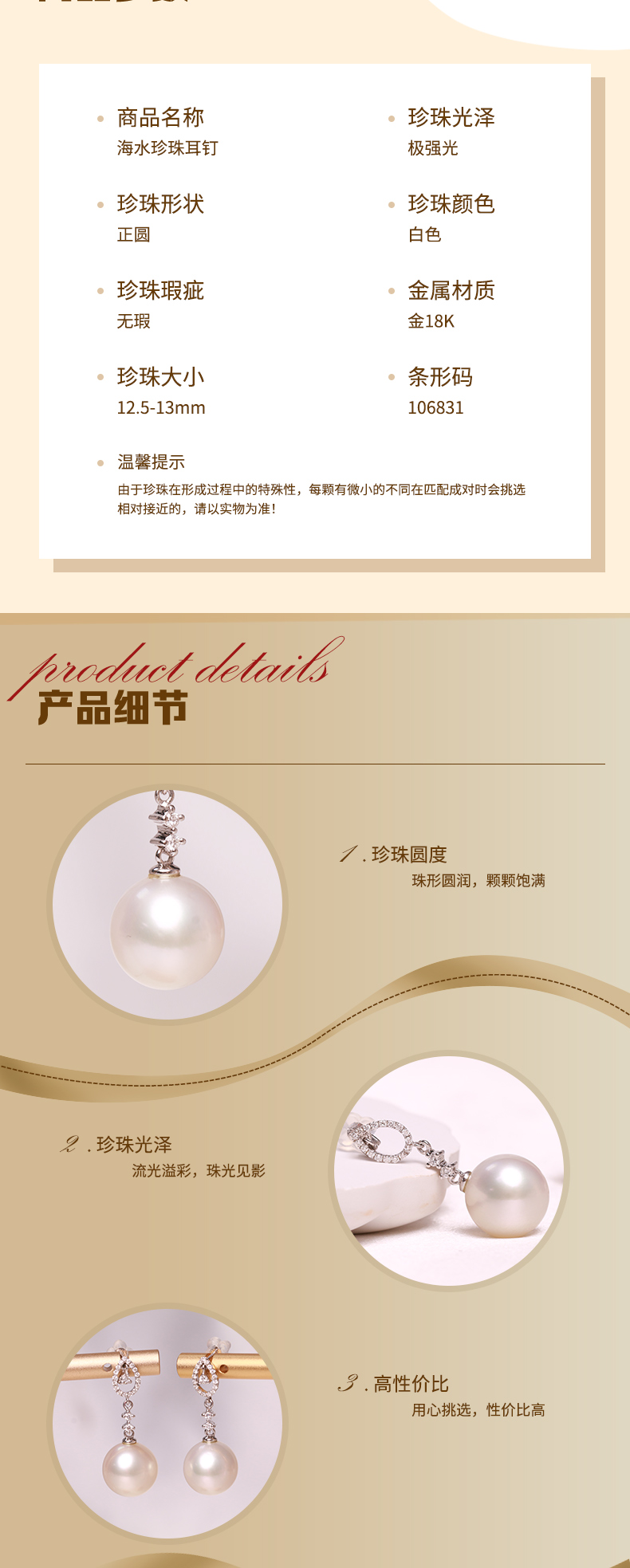 美裕 金18K海水珍珠耳钉 南洋珠 12.5-13mm白 106831
