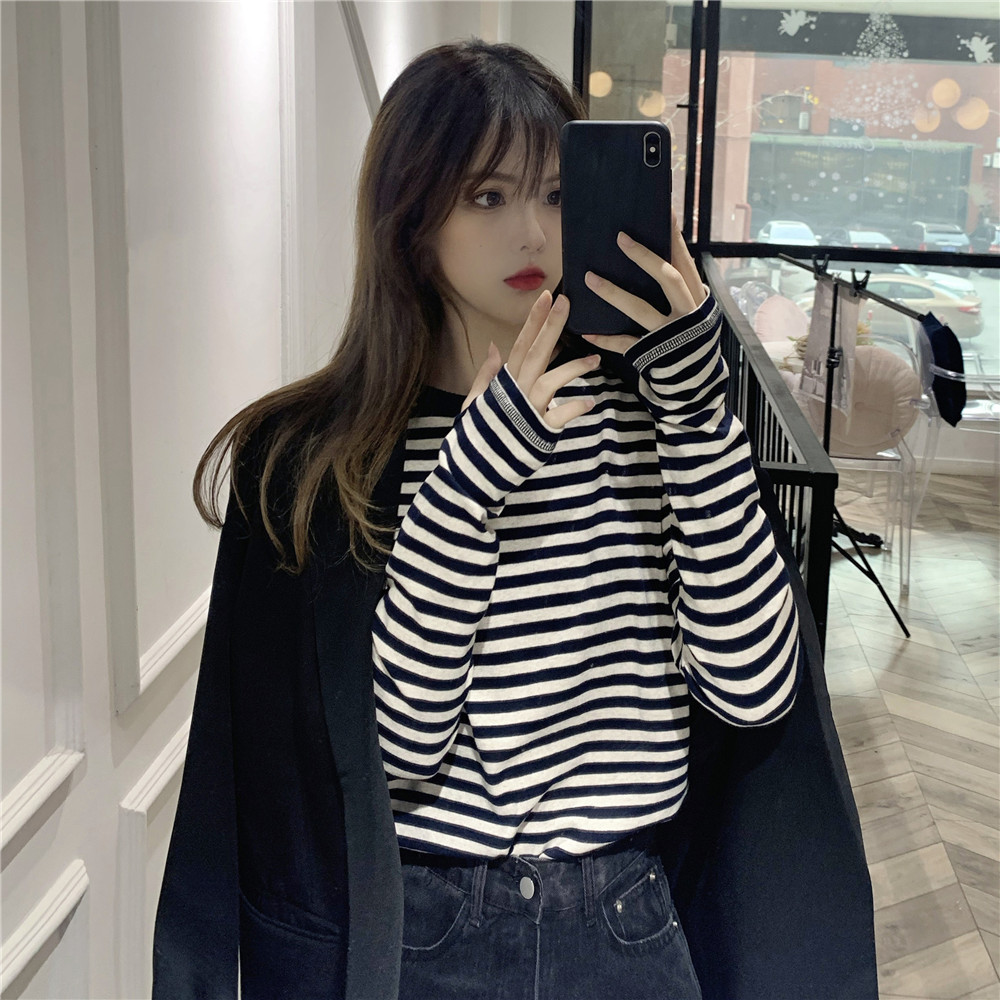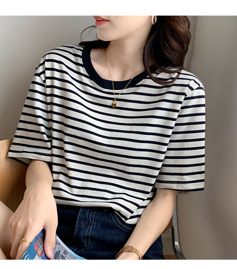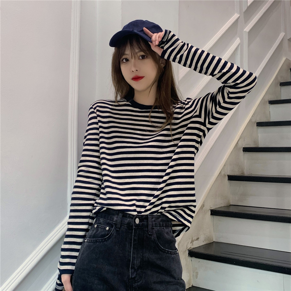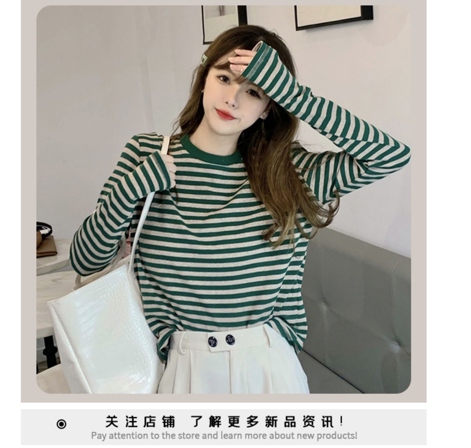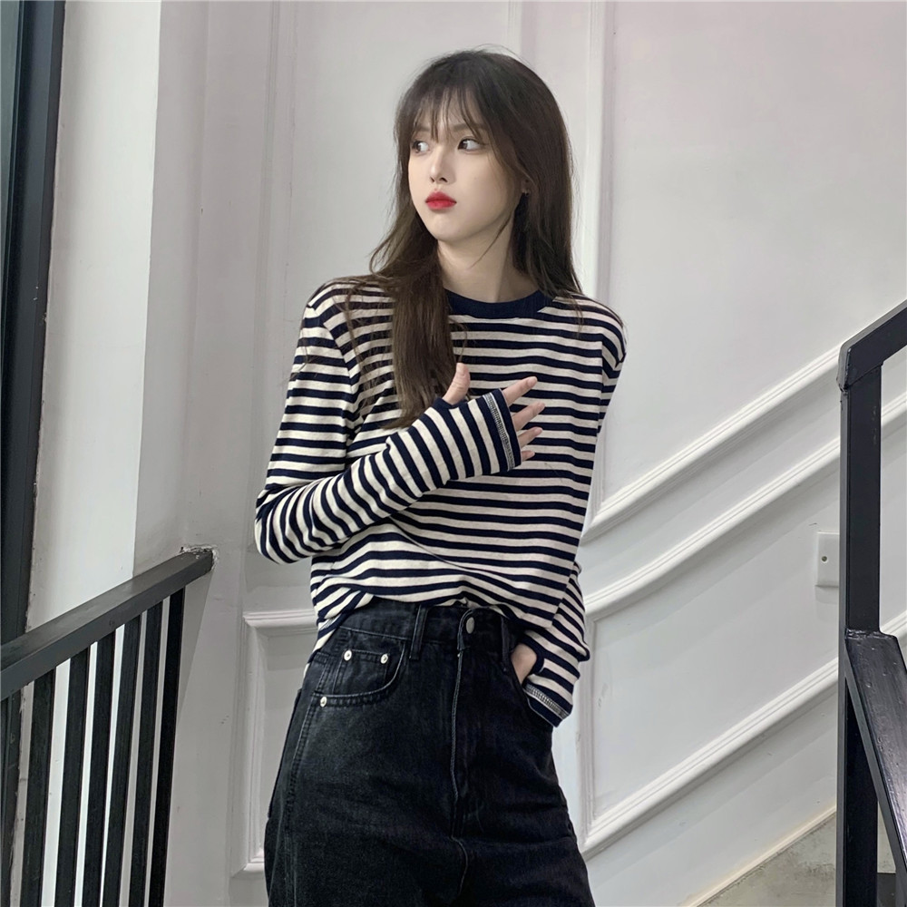 【拉夏贝尔同厂】条纹t恤短袖 长袖宽松显瘦2023年夏新款打底女体恤休闲半袖