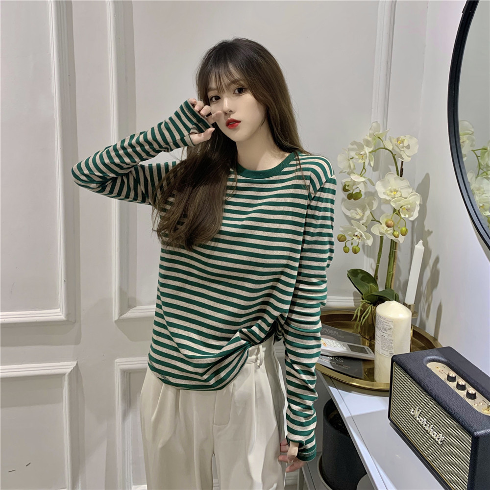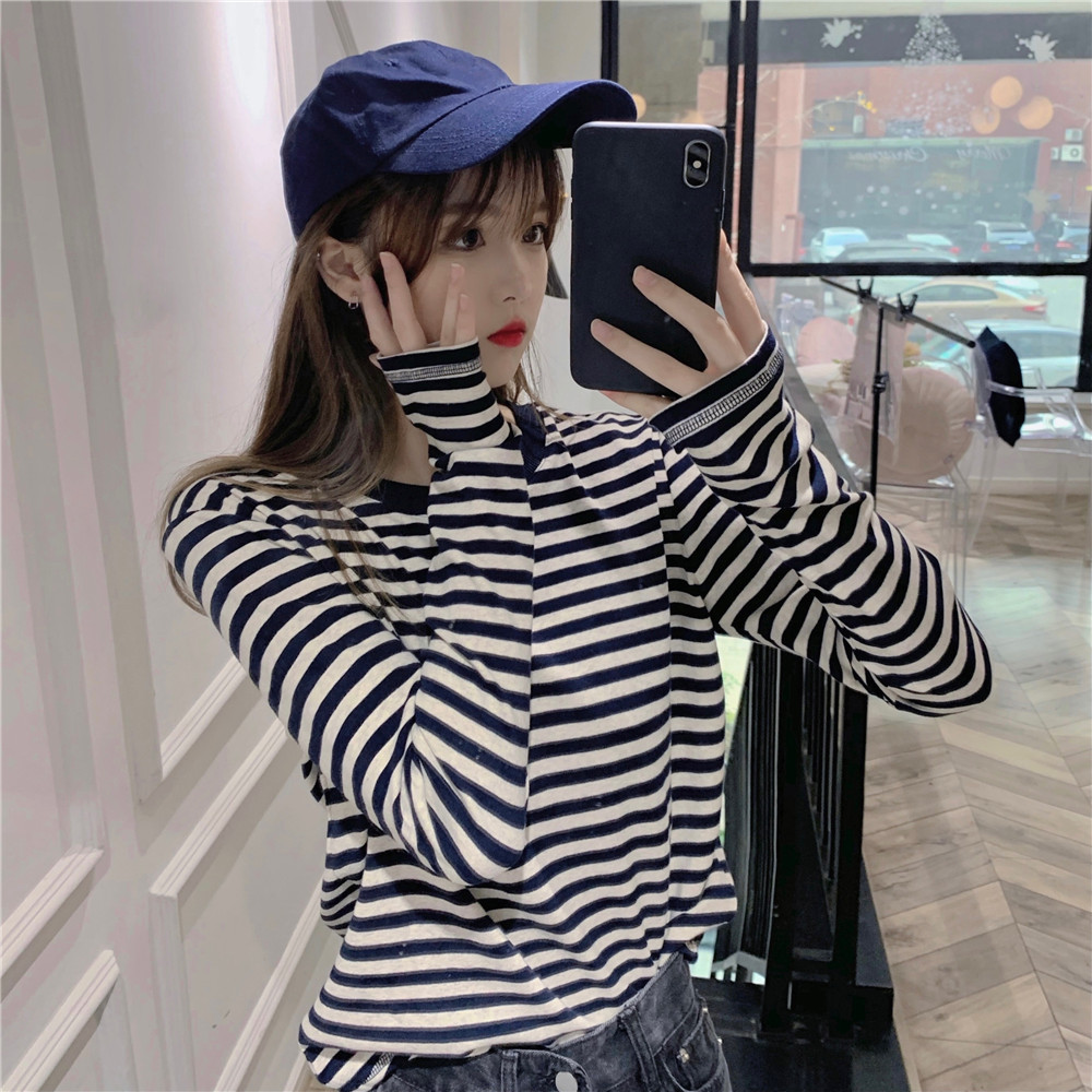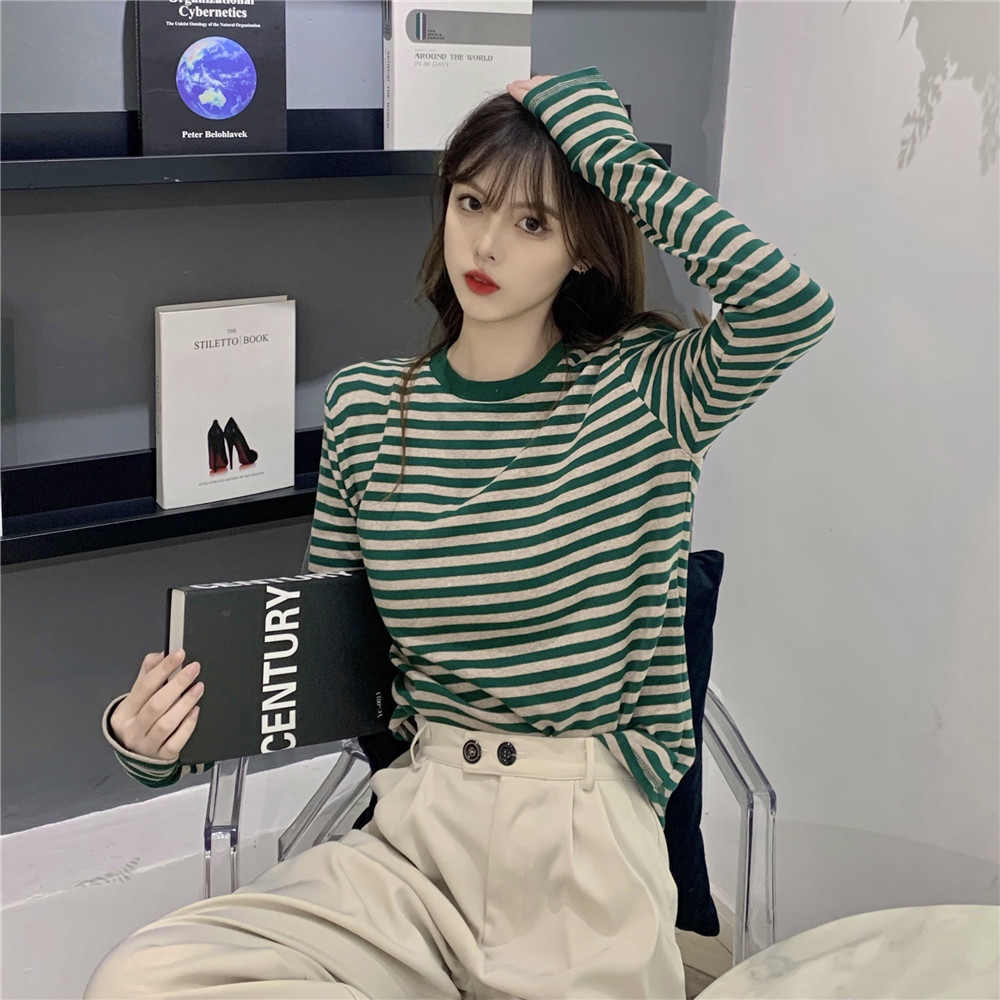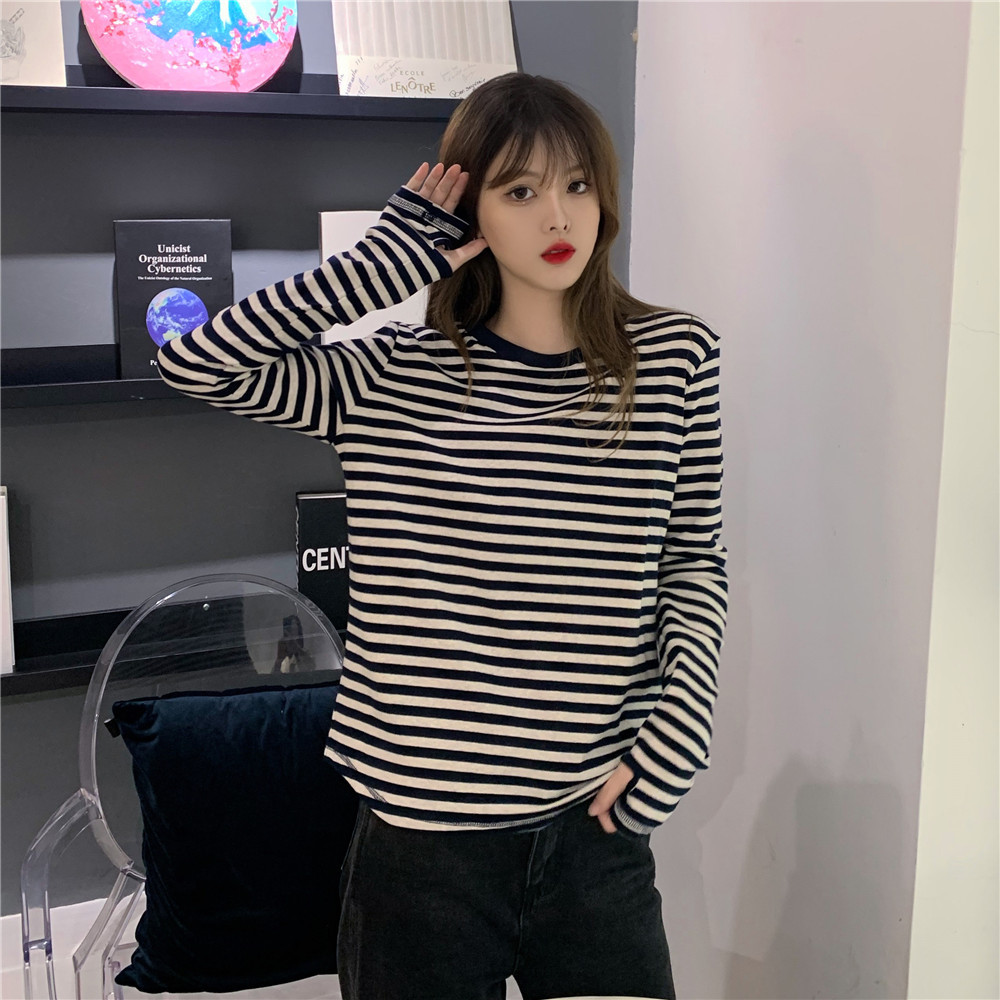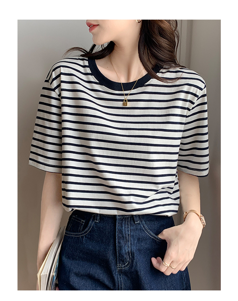 【拉夏贝尔同厂】条纹t恤短袖 长袖宽松显瘦2023年夏新款打底女体恤休闲半袖