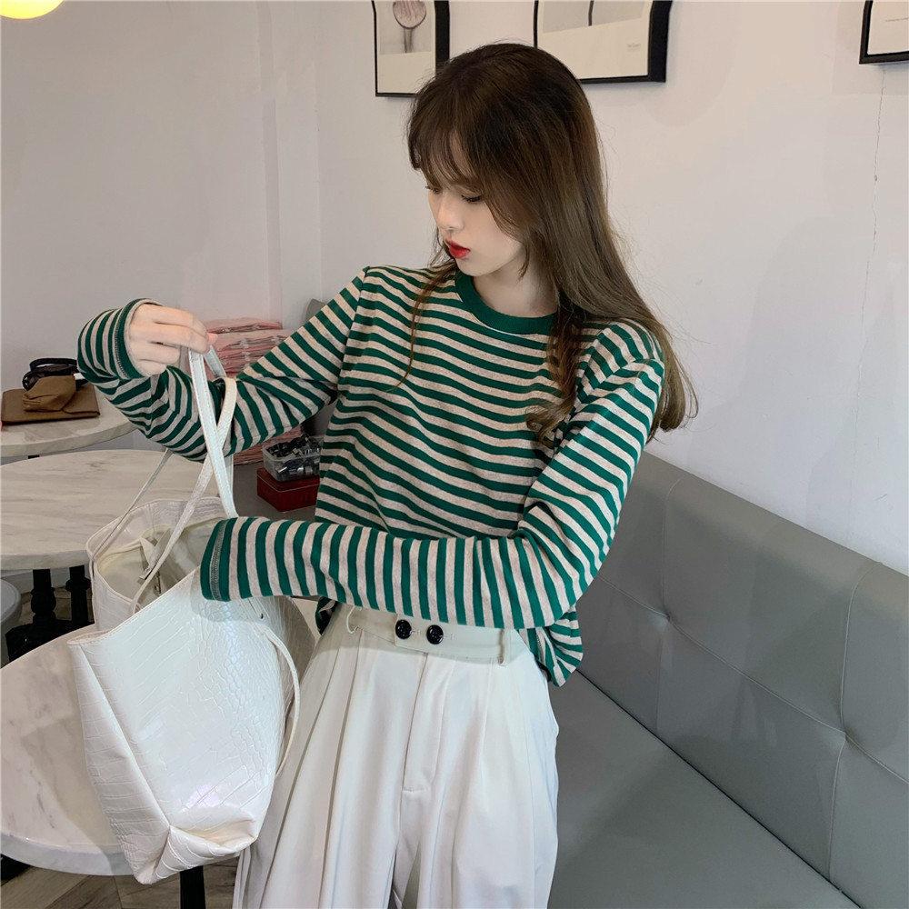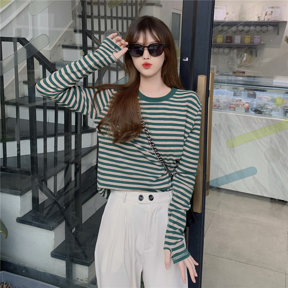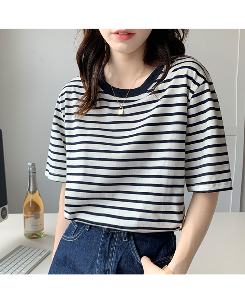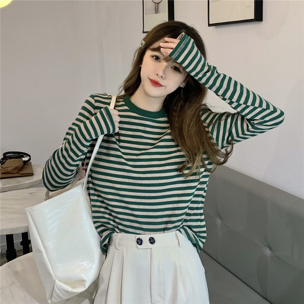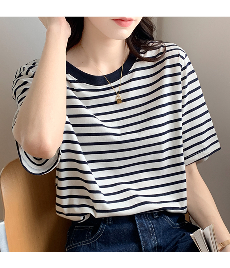 【拉夏贝尔同厂】条纹t恤短袖 长袖宽松显瘦2023年夏新款打底女体恤休闲半袖