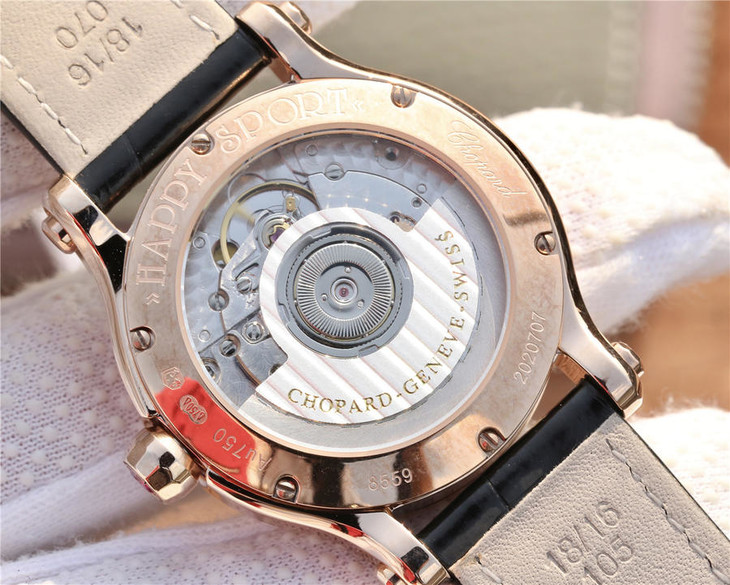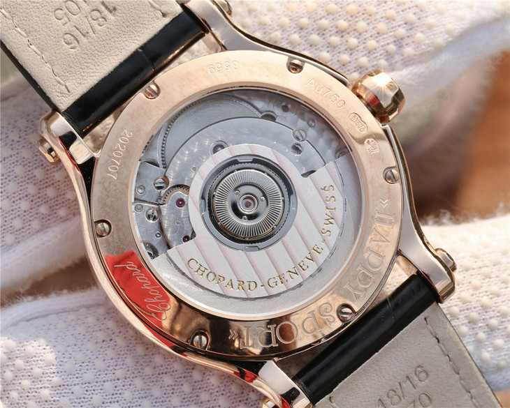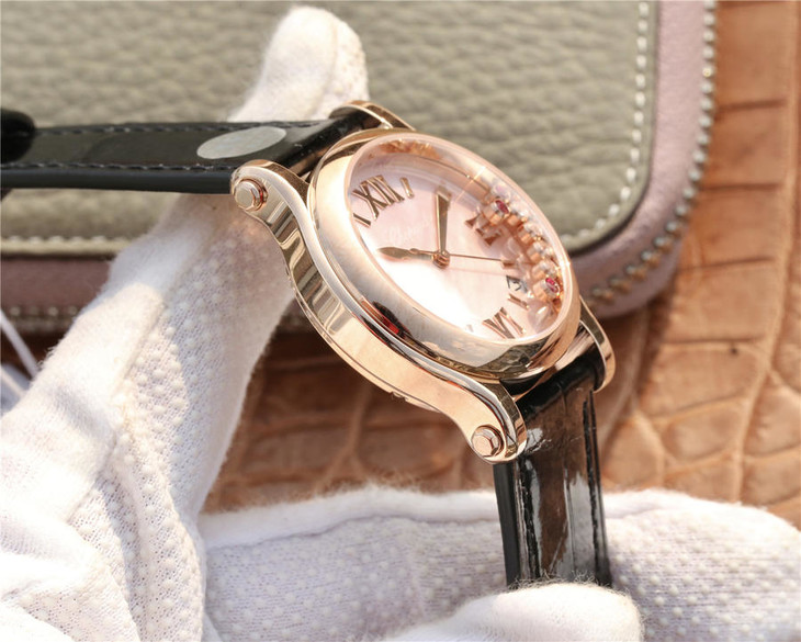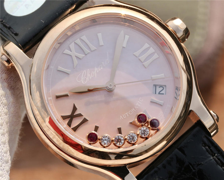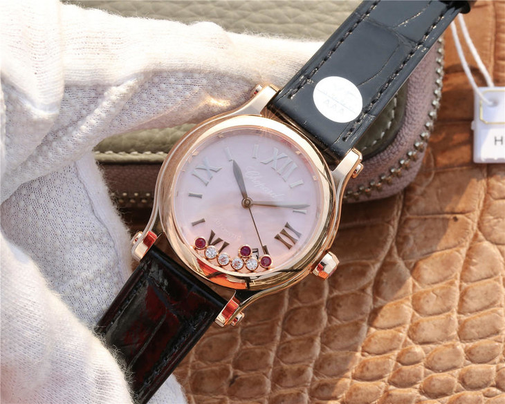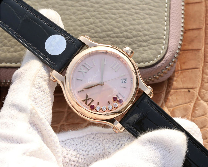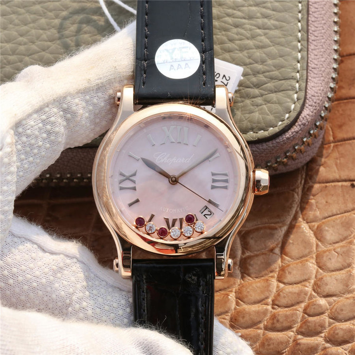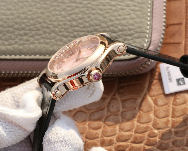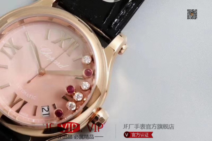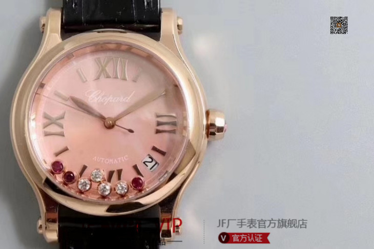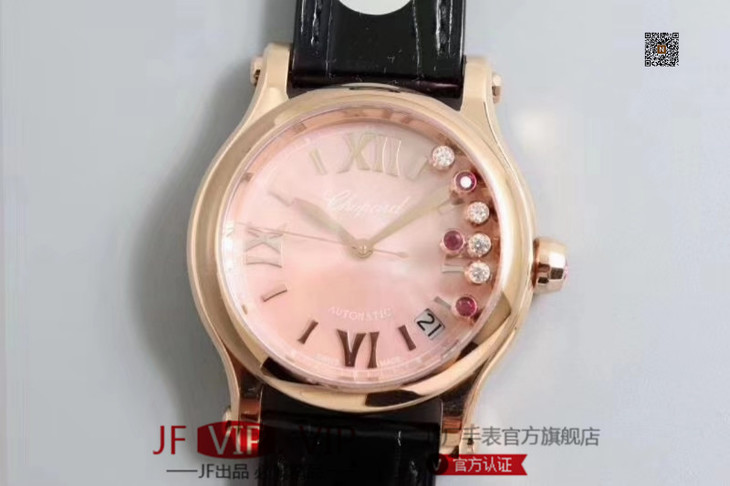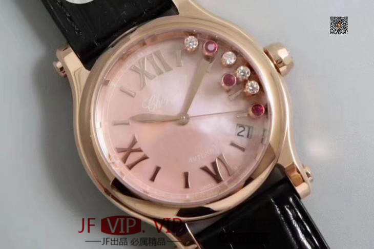 YF萧邦30周年特别款。女士腕表,皮表带,自动机械机芯,透底。与旧款有所不同镜面换了三颗红宝石最特别的是侧面调时把采用了粉色宝石—璀璨宝石灵动飞舞 释放腕间风华 铭记情人间 每一刻的美好悸动。