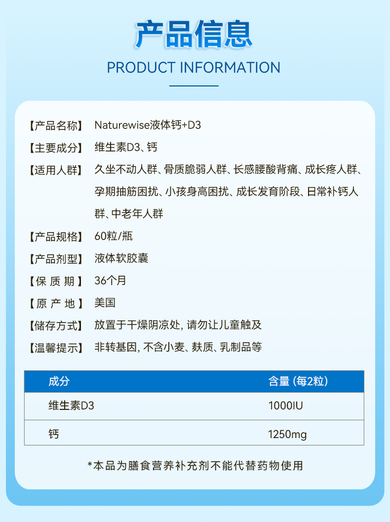 Naturewise牌钙1250mg+D31000IU60粒软胶囊