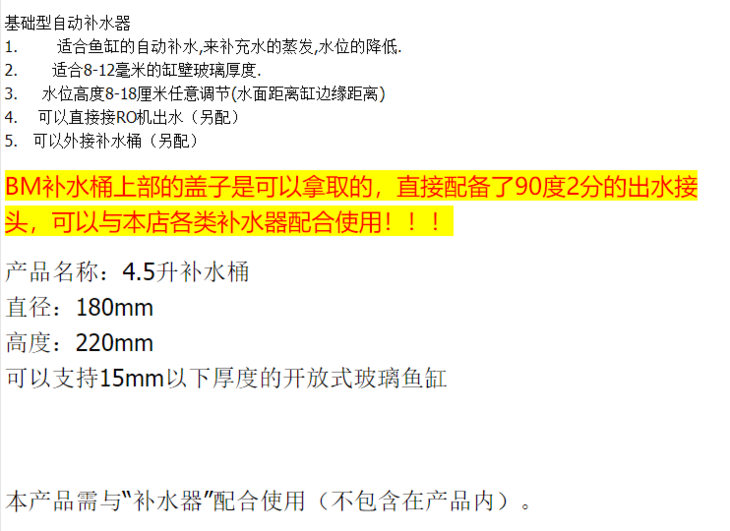 BM 基础版补水器 4.5L补水桶海水鱼缸 水族箱 可以接RO自动补水