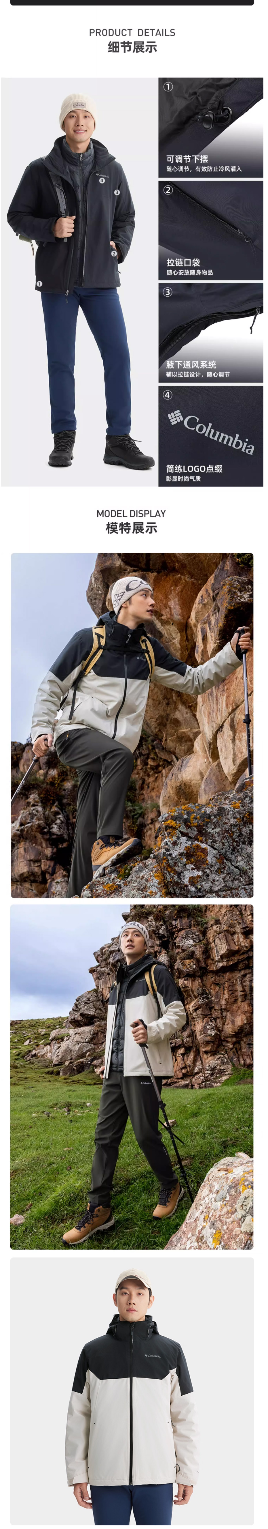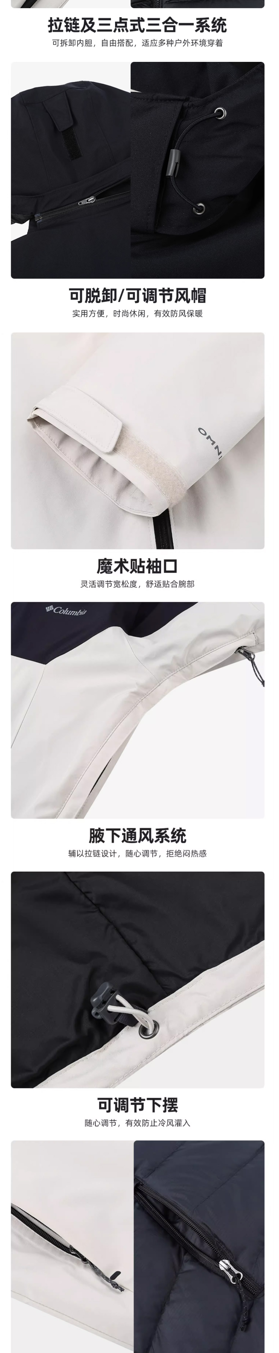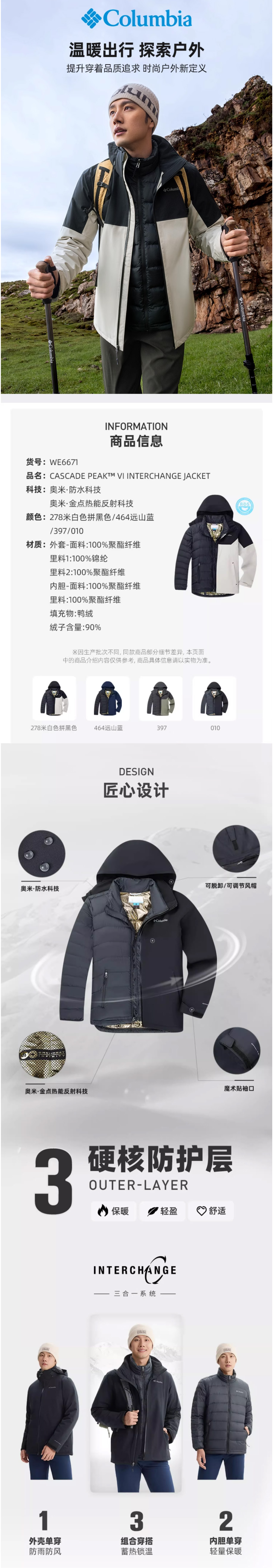 哥伦比亚男装金点防水700蓬鸭绒内胆三合一冲锋衣WE6671278