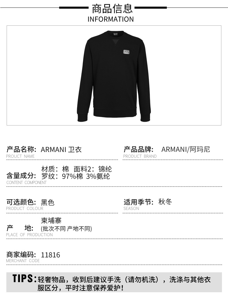 【新品单件特惠秒】ARMANI EA7运动休闲系列 男士百搭潮流弹棉卫衣外套 11816