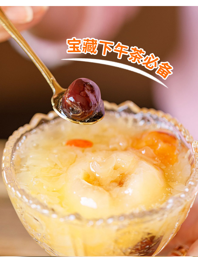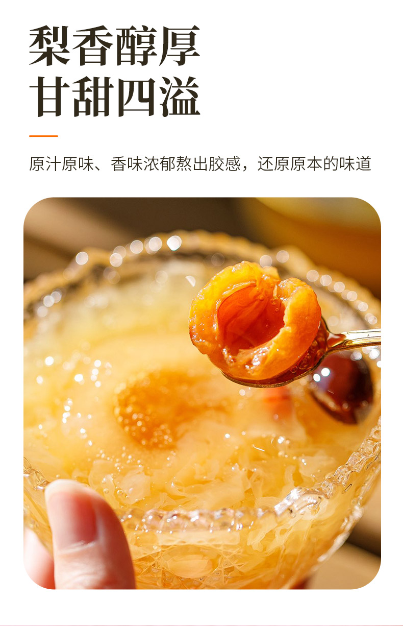 色泽诱人,晶莹剔透,迸发清新果香味,梨肉吸饱枇杷润甜,一抿即化;