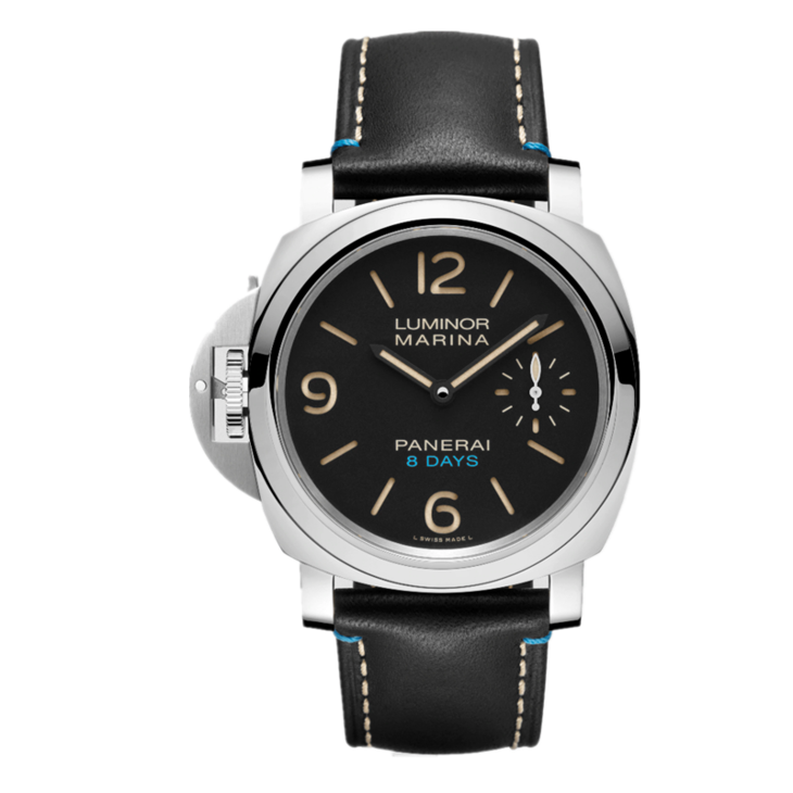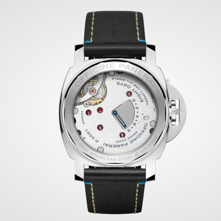 镜面材质 | 蓝宝石水晶玻璃 | 表盘 | AISI 316L抛光精钢表壳 黑色三明治表盘,附夜光阿拉伯数字及小时标示。3点钟位置设小秒盘。 8日动力储备 表背动力储备显示 精钢表冠护桥(沛纳海专利) 透底 |