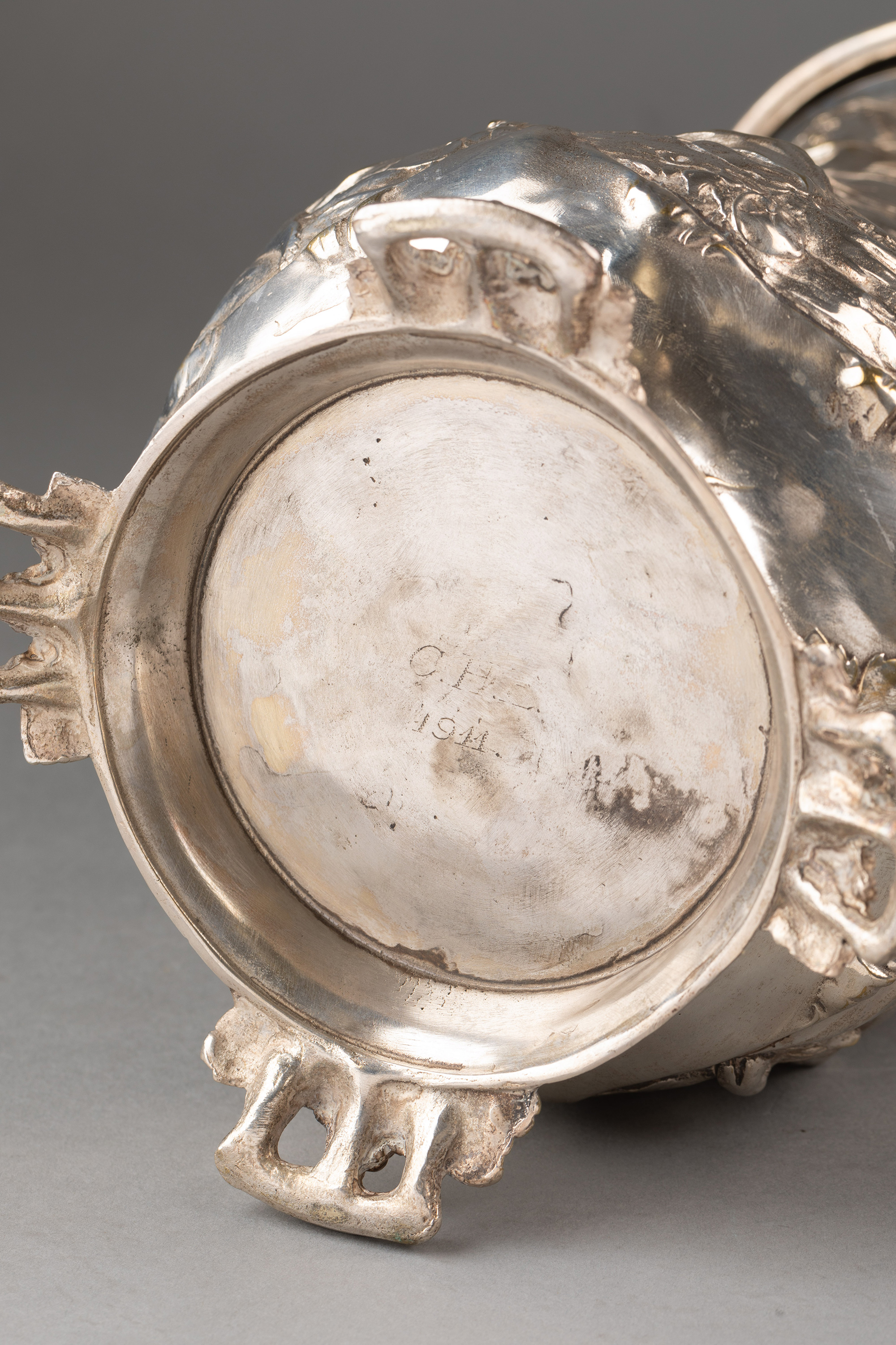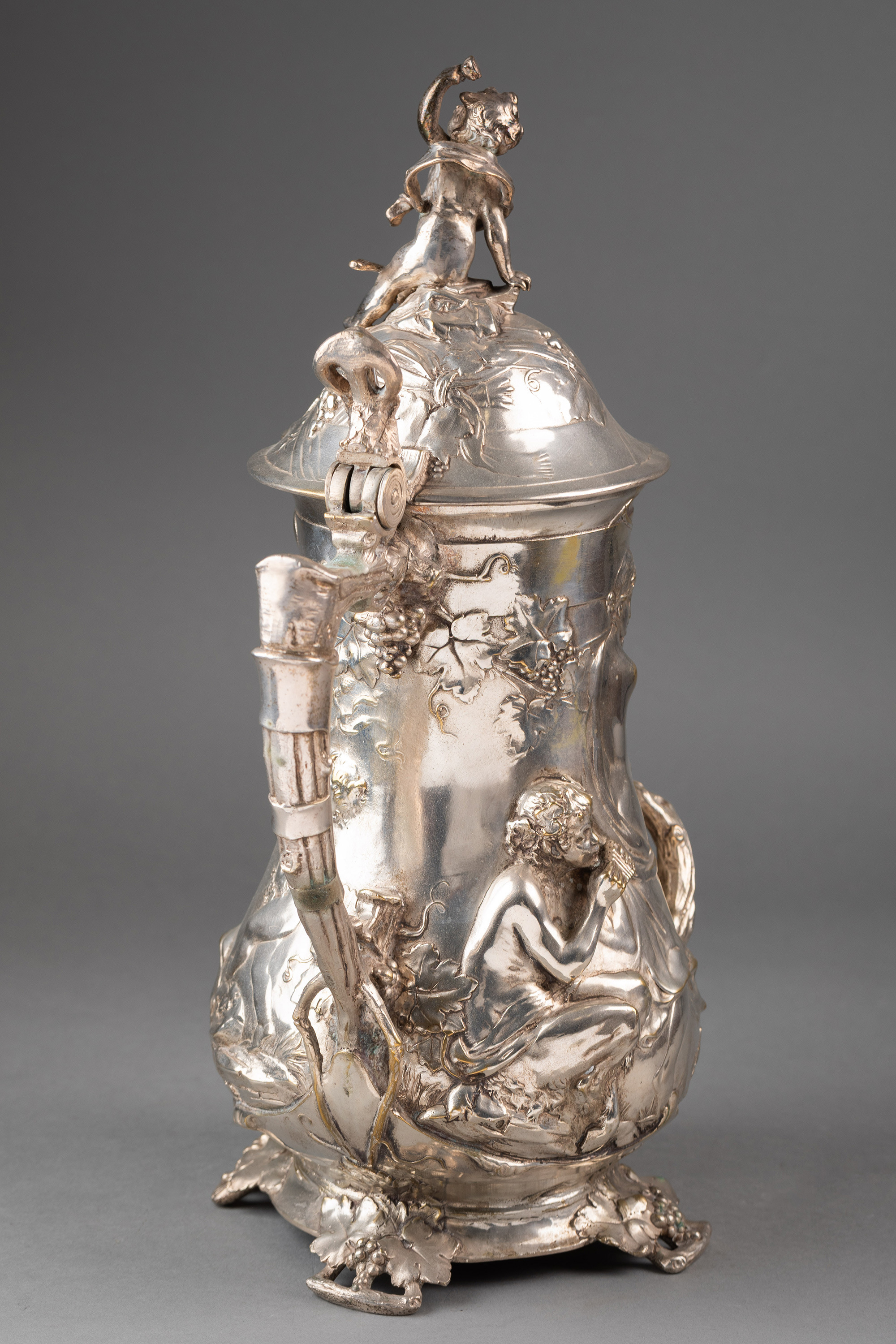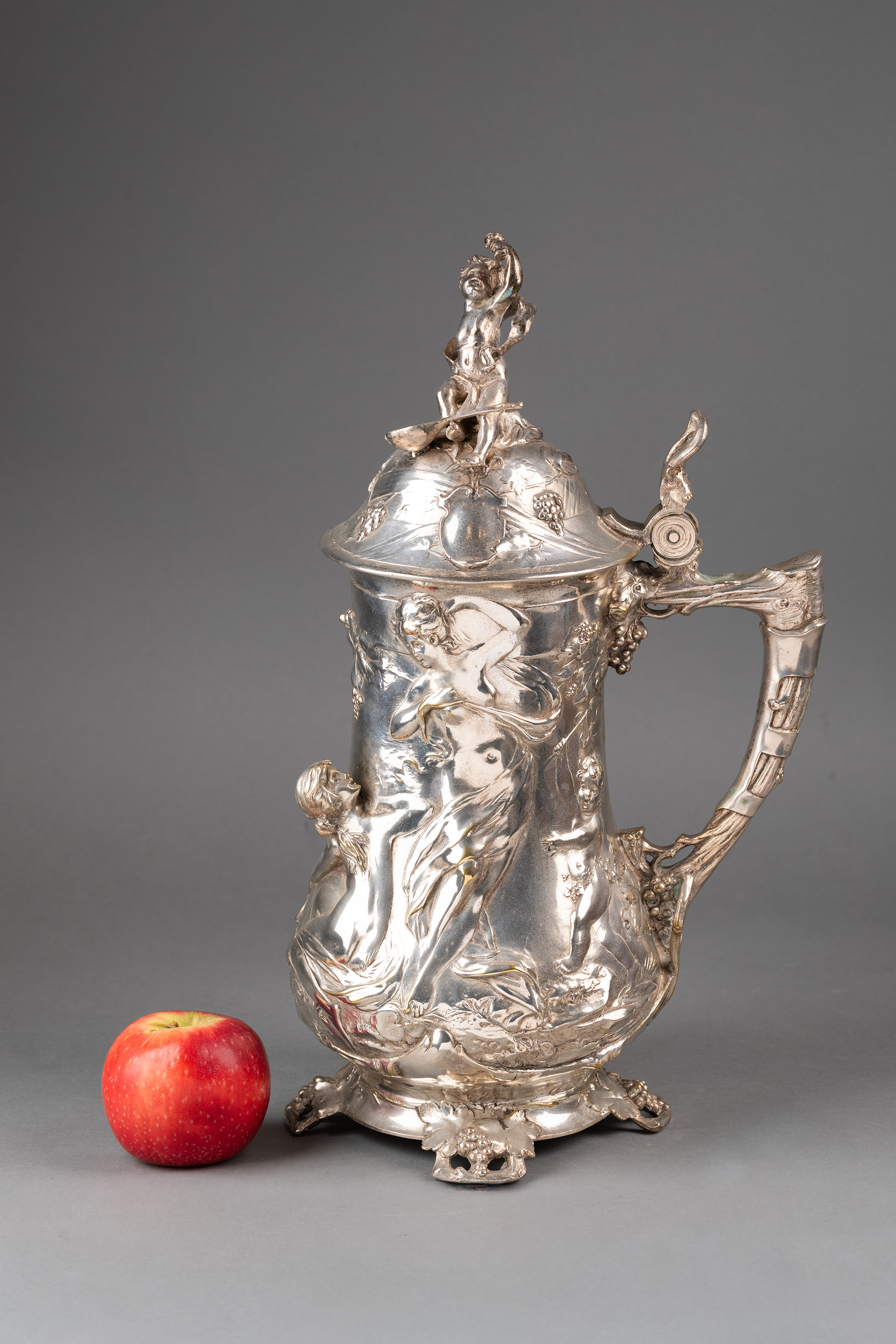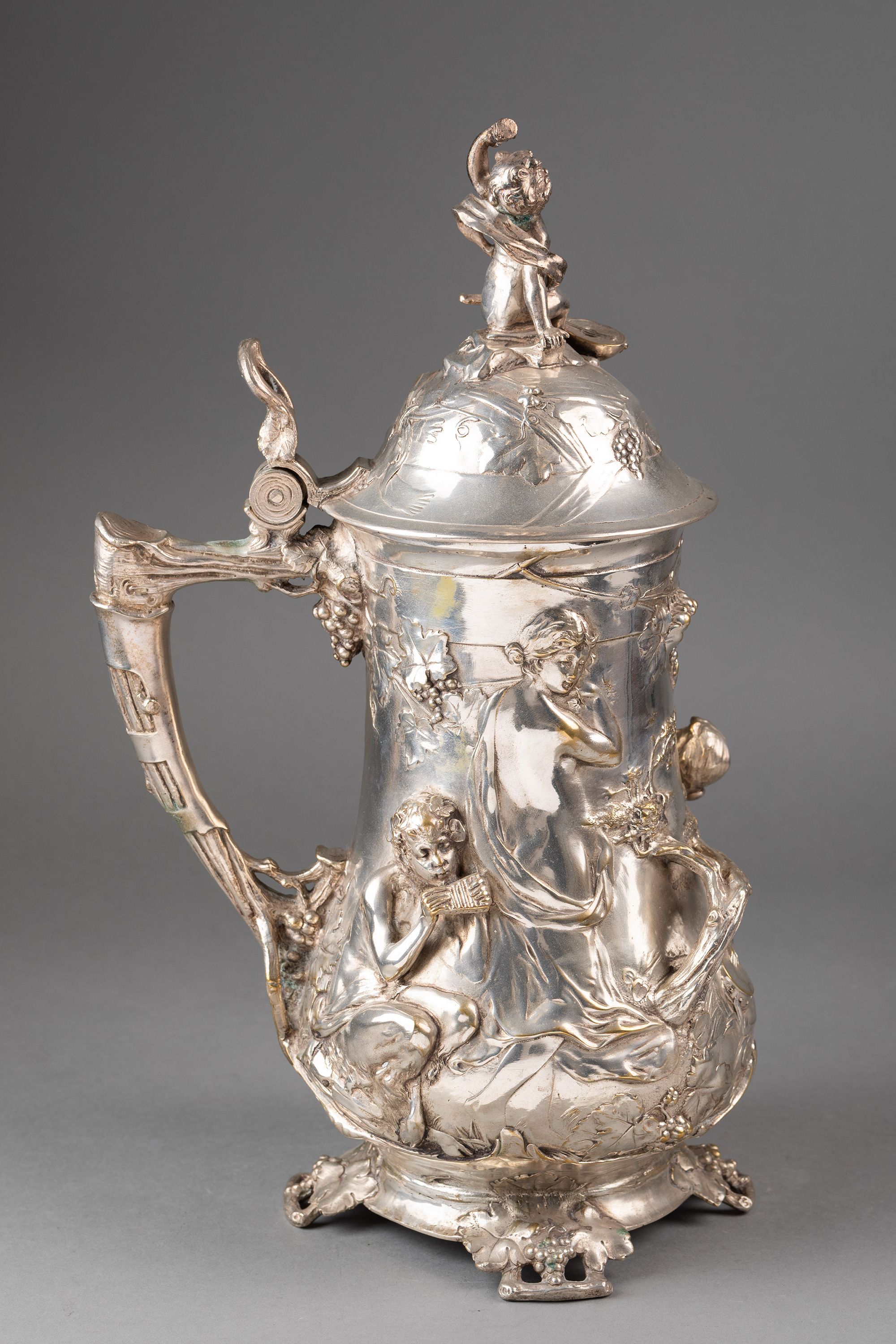 1911年德国银器工坊WMF签名出品新艺术风格小天使造型主题镀银浮雕啤酒杯