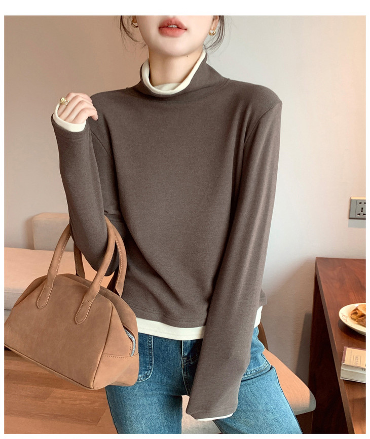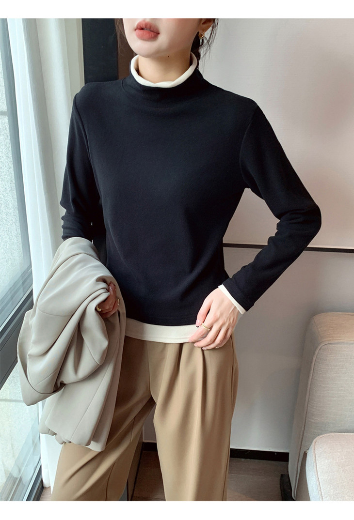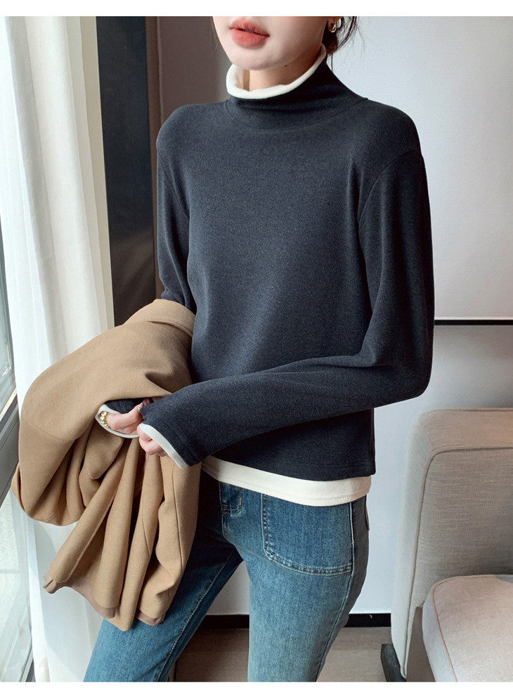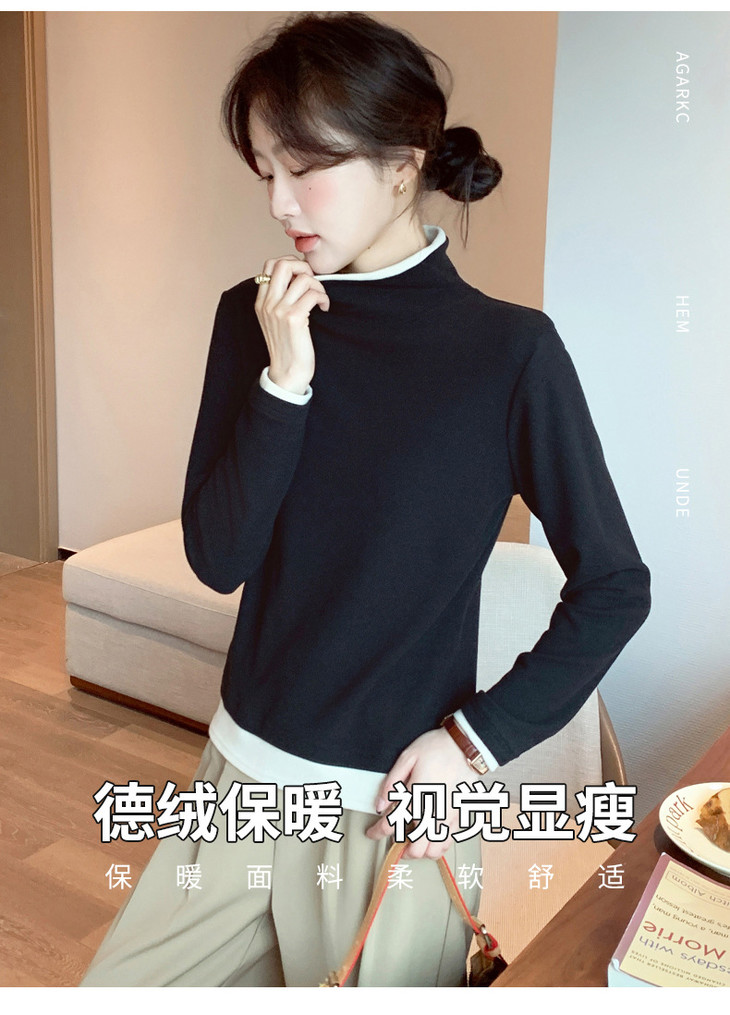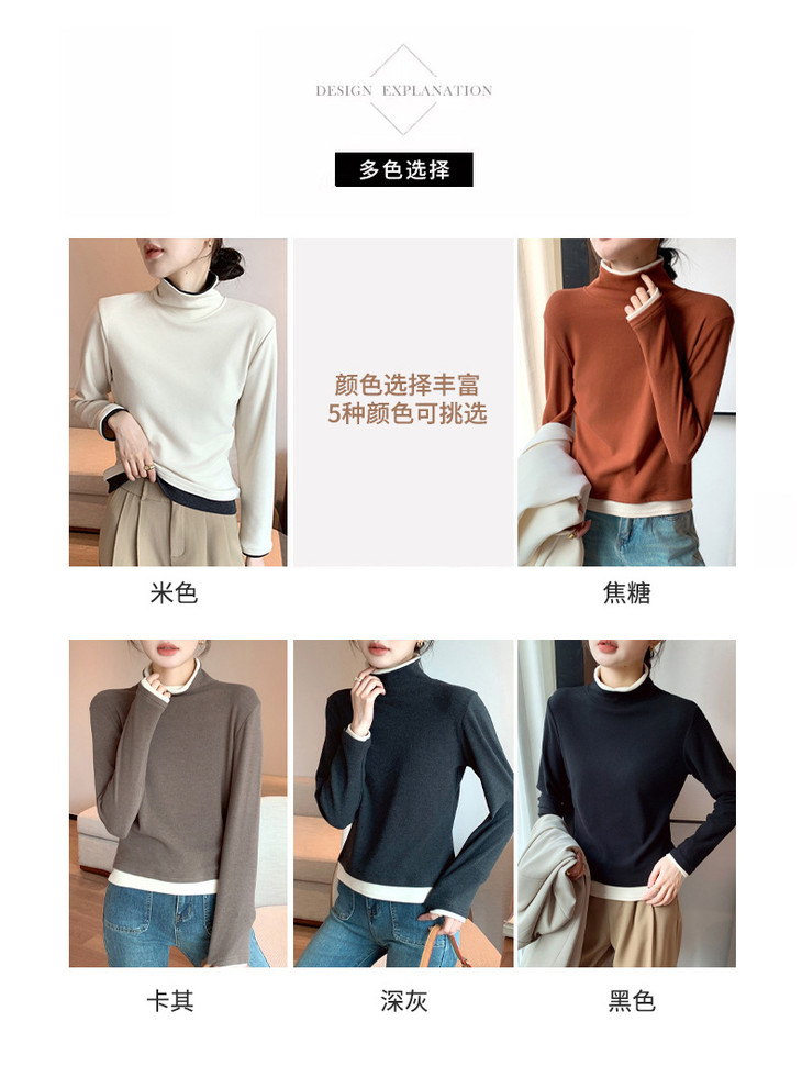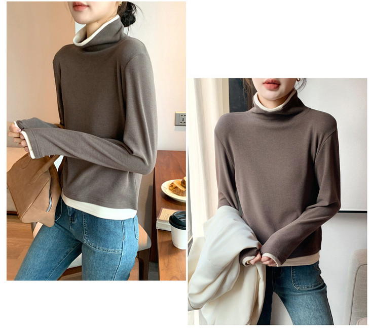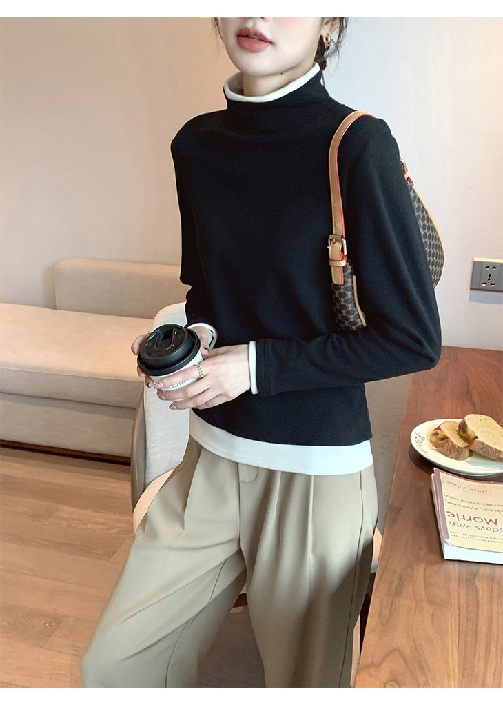 新款装假两件上衣长袖t恤女打底衫叠穿拼接撞色高领内搭